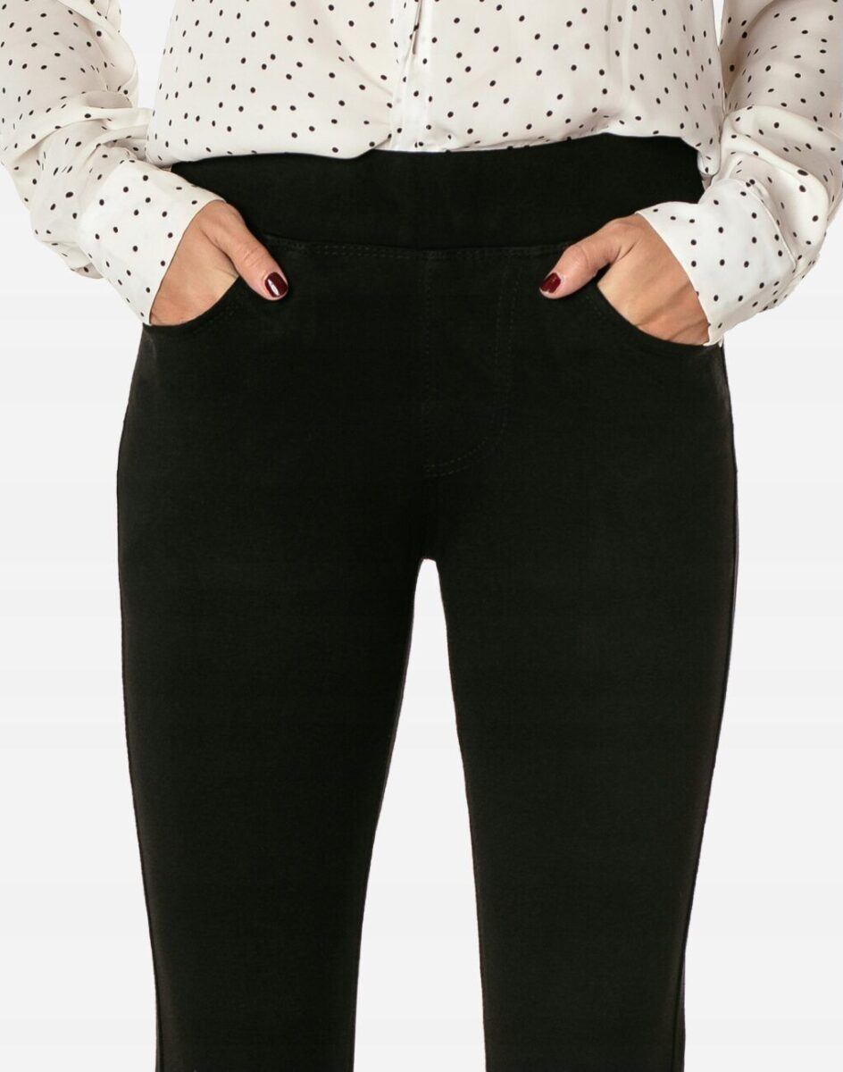 Oferowane przez nas spodnie uszyte są z wysokiej jakości tkaniny bawełnianej średniej grubości z domieszką poliestru i spandexu (elastan) dzięki czemu spodnie są bardziej elastyczne, bardzo dobrze się układają i dopasowują do każdej figury a nogi wydają się się optycznie dłuższe. Trwałe i elastyczne wykończenie spodni (użycie do produkcji elastycznych nici) gwarantuje komfort i wygodę ich użytkownikowi w każdych warunkach, a tkanina jest na tyle gruba, że nie widać przez nią bielizny. Możesz je śmiało łączyć zarówno ze szpilkami (idealnie wydłużają kobiece nogi), jak i obuwiem sportowym. Zapewniają poczucie atrakcyjności przy jednoczesnym zachowaniu wygody i pełnej swobody ruchów. Klasyczne, a jednocześnie zawsze nowoczesne, urzekają minimalistycznym wzornictwem. Elegancki czarny kolor, zawsze modny krój Slim Fit z wąską nogawką pozwoli Ci założyć je na wiele różnych okazji. Sprawdzony przez wiele zadowolonych klientek fason spodni sprawi, że w zależności od dopasowanego do nich elementu garderoby, będziesz zawsze odpowiednio ubrana na każdą okazję, zarówno na „sportowo” jak i na „elegancko”.
