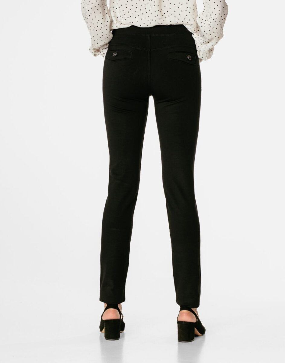 Oferowane przez nas spodnie uszyte są z wysokiej jakości tkaniny bawełnianej średniej grubości z domieszką poliestru i spandexu (elastan) dzięki czemu spodnie są bardziej elastyczne, bardzo dobrze się układają i dopasowują do każdej figury a nogi wydają się się optycznie dłuższe. Trwałe i elastyczne wykończenie spodni (użycie do produkcji elastycznych nici) gwarantuje komfort i wygodę ich użytkownikowi w każdych warunkach, a tkanina jest na tyle gruba, że nie widać przez nią bielizny. Możesz je śmiało łączyć zarówno ze szpilkami (idealnie wydłużają kobiece nogi), jak i obuwiem sportowym. Zapewniają poczucie atrakcyjności przy jednoczesnym zachowaniu wygody i pełnej swobody ruchów. Klasyczne, a jednocześnie zawsze nowoczesne, urzekają minimalistycznym wzornictwem. Elegancki czarny kolor, zawsze modny krój Slim Fit z wąską nogawką pozwoli Ci założyć je na wiele różnych okazji. Sprawdzony przez wiele zadowolonych klientek fason spodni sprawi, że w zależności od dopasowanego do nich elementu garderoby, będziesz zawsze odpowiednio ubrana na każdą okazję, zarówno na „sportowo” jak i na „elegancko”.