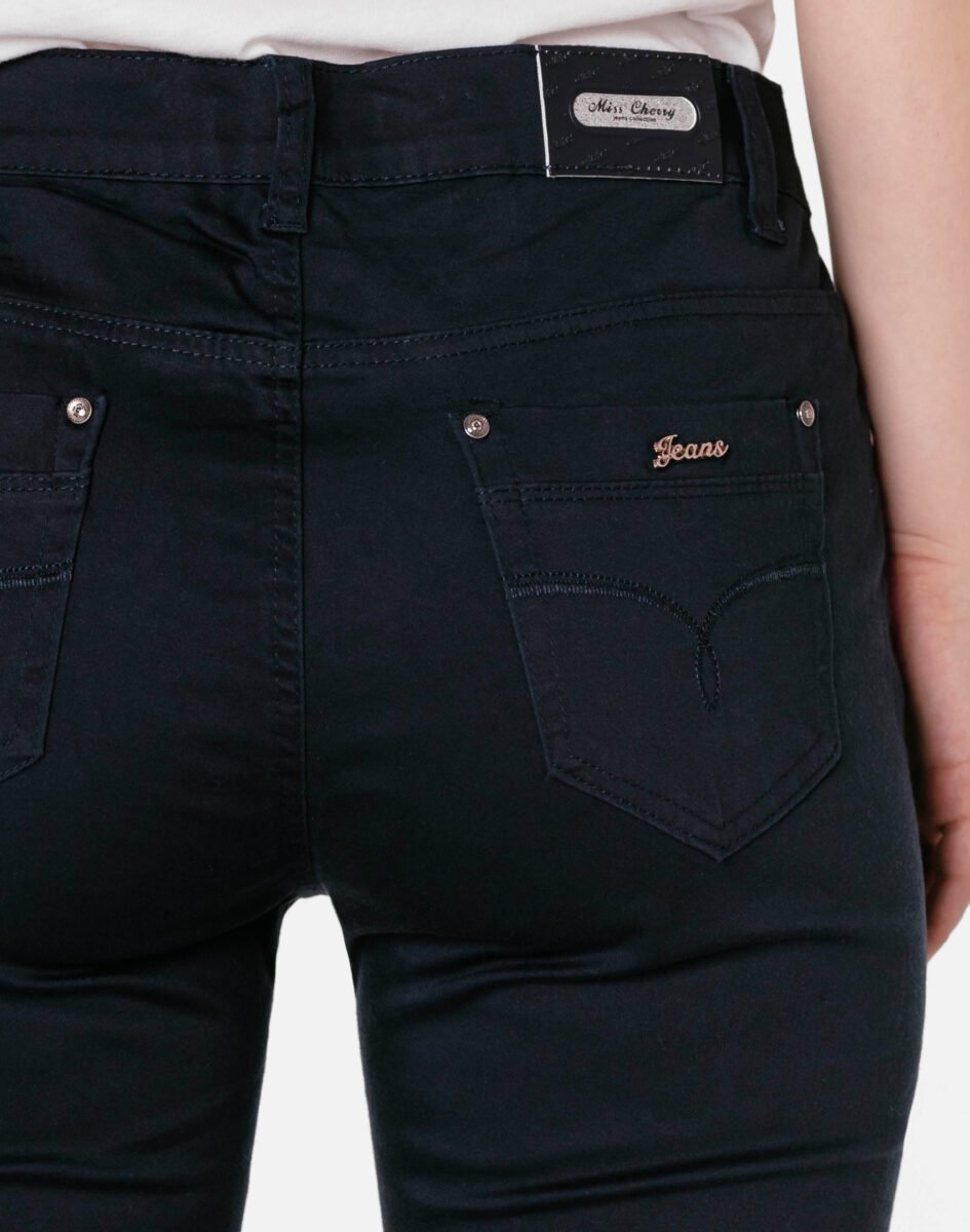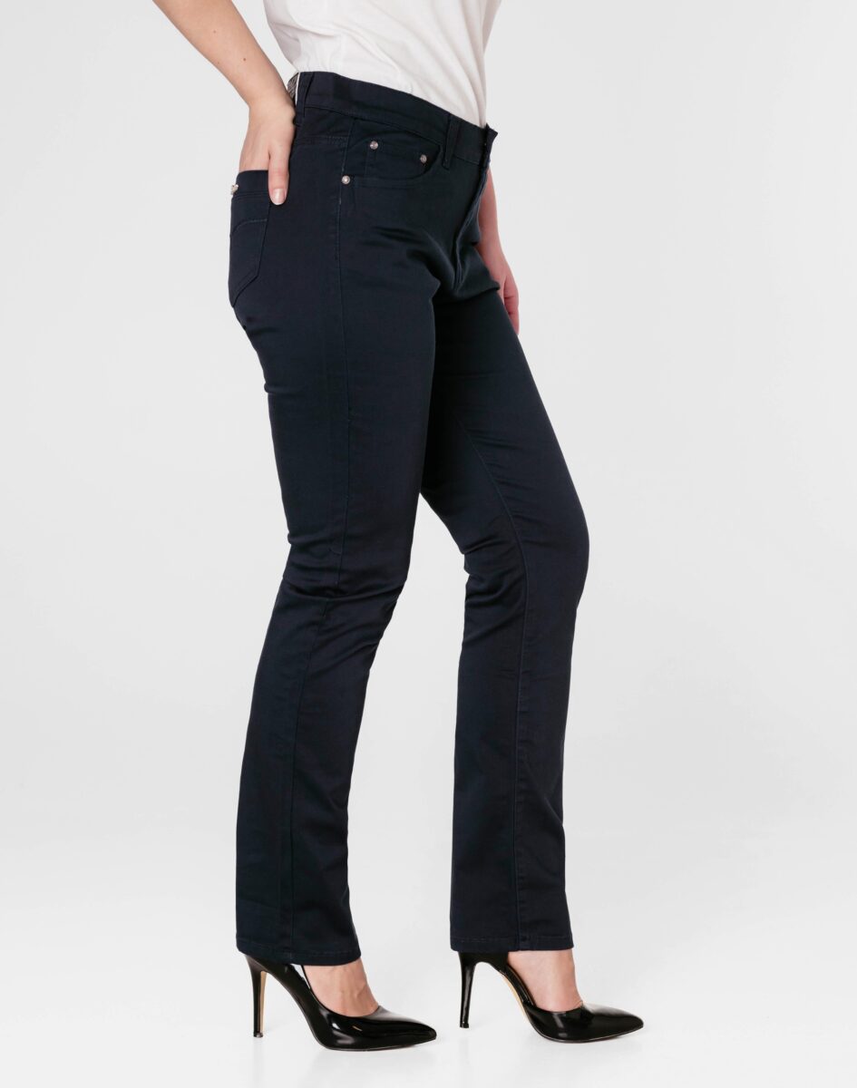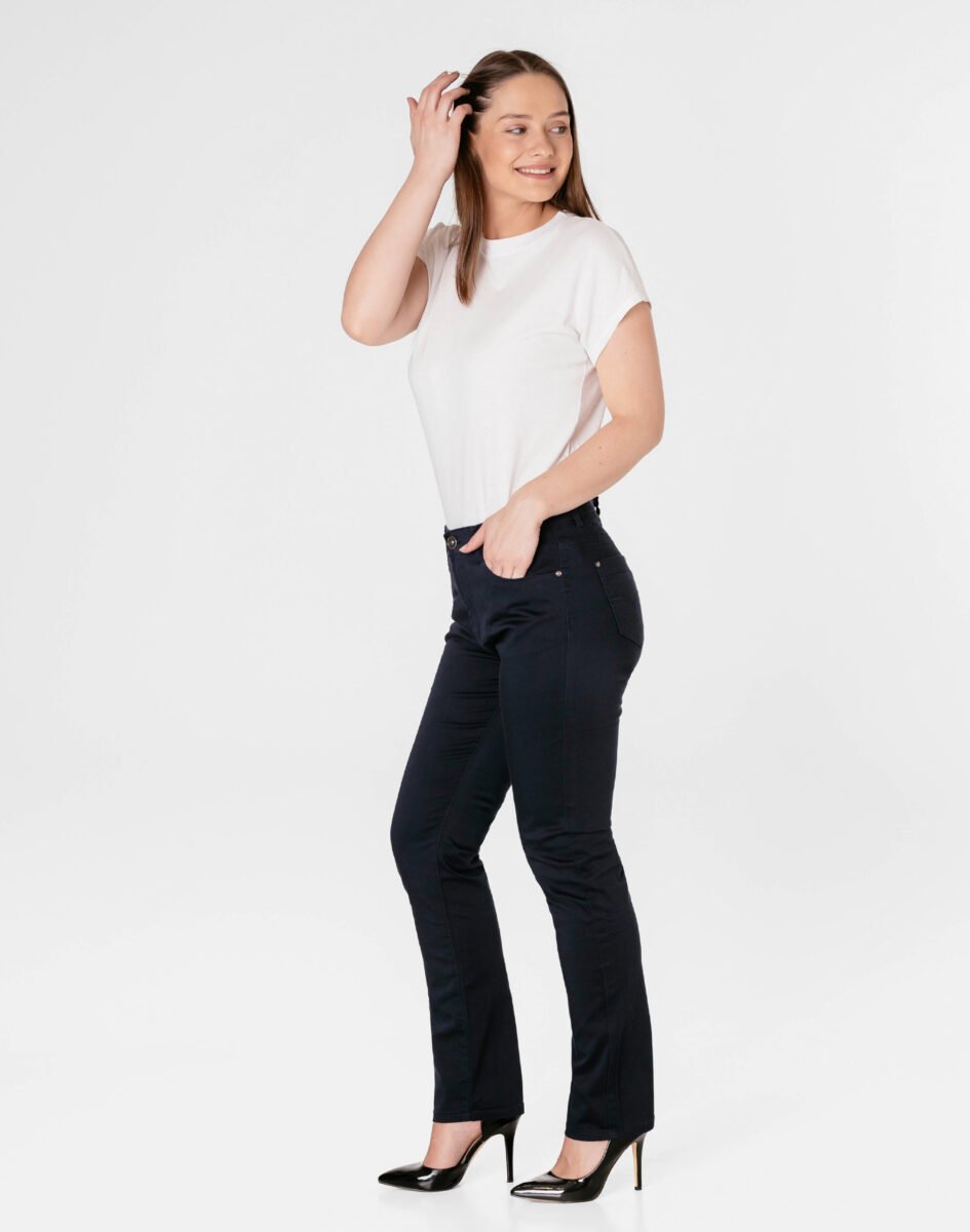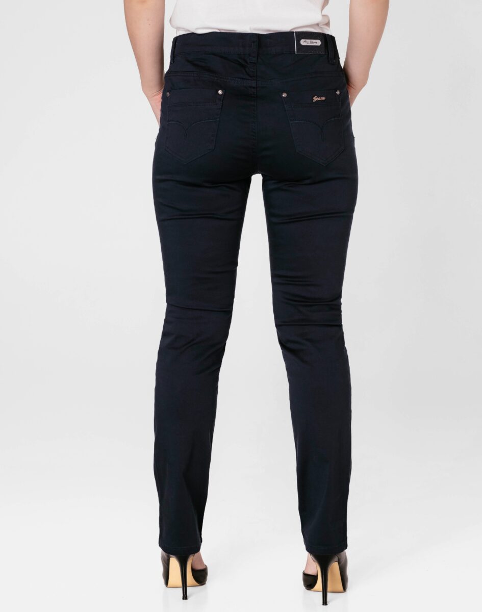 Spodnie damskie model MD3765 to klasyczne, bardzo szykowne rurki z wąskimi nogawkami o wyszczuplającym optycznie kobiecą sylwetkę fasonie (Slim Fit) i wyższym stanie (High Waist). Zapinane na kryty zamek błyskawiczny i metalowy guzik sygnowany logiem firmy. Z przodu mają dwie kieszonki zaokrąglone oraz mniejszą kieszonkę tzw. bilonówkę, a na tyle klasyczne kieszenie naszywane jak w typowych spodniach jeansowych. W pasie szlufki umożliwiające stylizacje z paskiem. Najbardziej podatne na uszkodzenia miejsca wzmocnione są dodatkowymi przeszyciami i małymi ozdobnymi nitami.