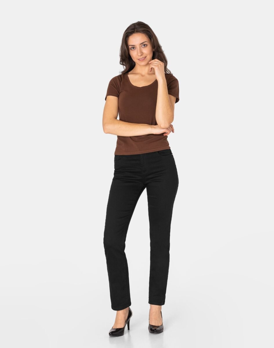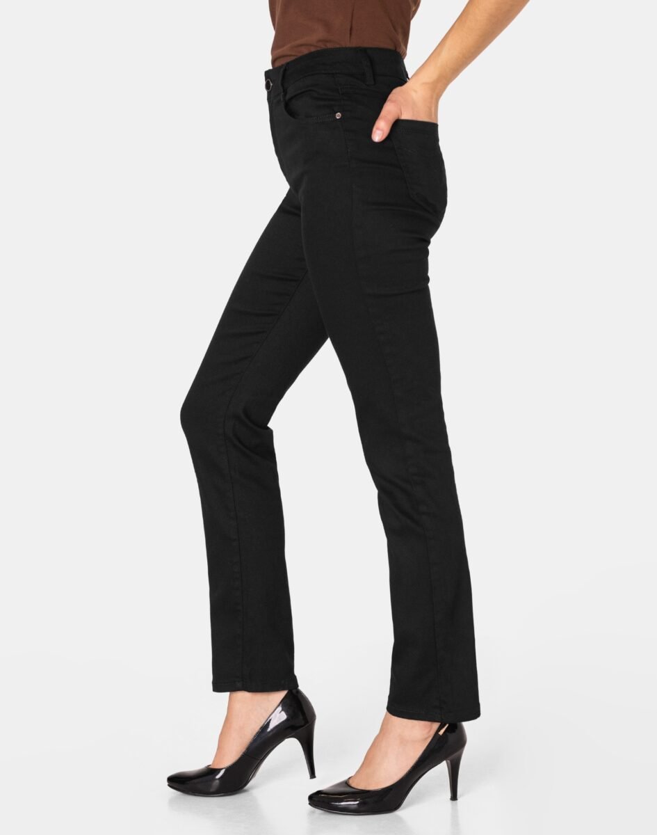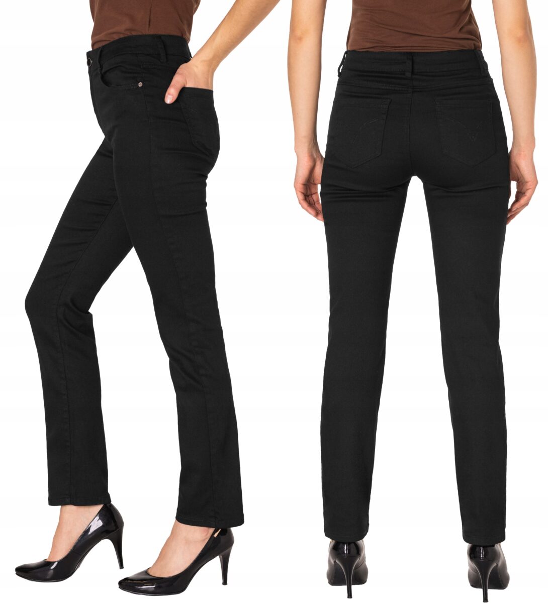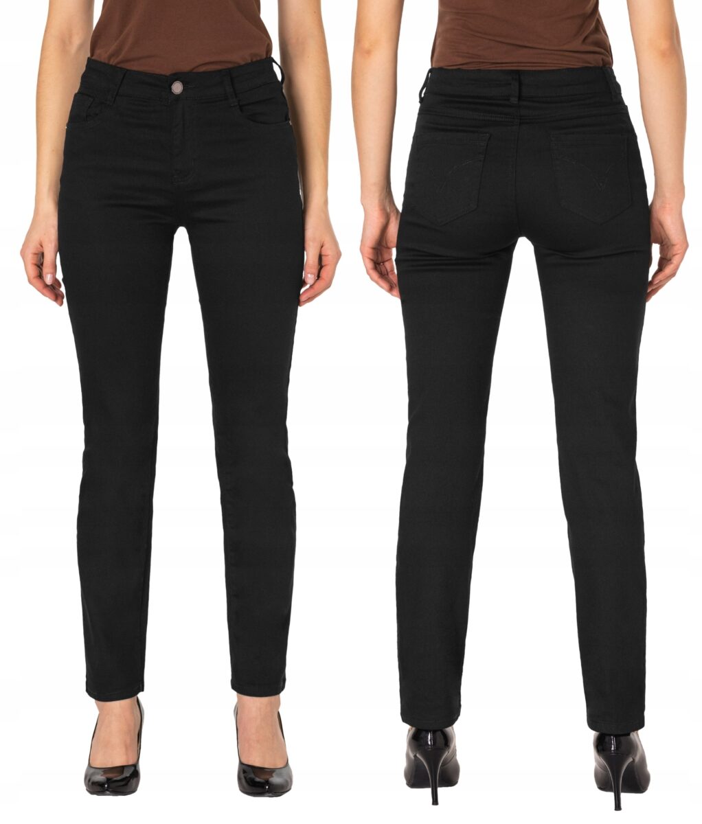 Czarne spodnie bawełniane damskie model #1790A z klasyczną prostą nogawką to klasyka wśród klasyki i jeden z najczęściej wybieranych modeli spodni. Zapinane na kryty zamek błyskawiczny i guzik. Z przodu mają dwie zaokrąglone kieszonki oraz mniejszą tzw. bilonówkę. Na tyle klasyczne naszywane kieszenie jak w typowych spodniach jeansowych. W pasie szlufki umożliwiające stylizacje z paskiem. Najbardziej podatne na uszkodzenia miejsca wzmocnione są dodatkowymi przeszyciami oraz małymi ozdobnymi nitami.