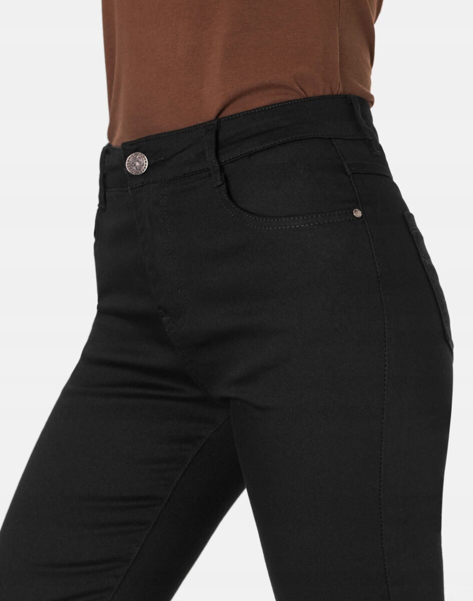 Czarne spodnie bawełniane damskie model #1790A z klasyczną prostą nogawką to klasyka wśród klasyki i jeden z najczęściej wybieranych modeli spodni. Zapinane na kryty zamek błyskawiczny i guzik. Z przodu mają dwie zaokrąglone kieszonki oraz mniejszą tzw. bilonówkę. Na tyle klasyczne naszywane kieszenie jak w typowych spodniach jeansowych. W pasie szlufki umożliwiające stylizacje z paskiem. Najbardziej podatne na uszkodzenia miejsca wzmocnione są dodatkowymi przeszyciami oraz małymi ozdobnymi nitami.
