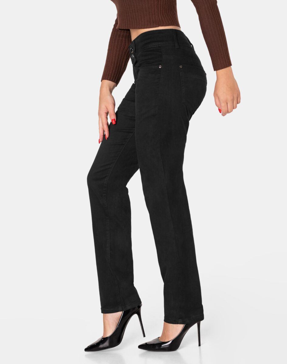 Czarne spodnie bawełniane damskie model #5241 z klasyczną prostą nogawką to klasyka wśród klasyki i jeden z najczęściej wybieranych modeli spodni. Zapinane na kryty zamek błyskawiczny i dwa guziki. Z przodu mają dwie zaokrąglone kieszonki oraz mniejszą tzw. bilonówkę. Na tyle klasyczne naszywane kieszenie jak w typowych spodniach jeansowych. W pasie szlufki umożliwiające stylizacje z paskiem. Najbardziej podatne na uszkodzenia miejsca wzmocnione są dodatkowymi przeszyciami oraz ozdobnymi nitami.