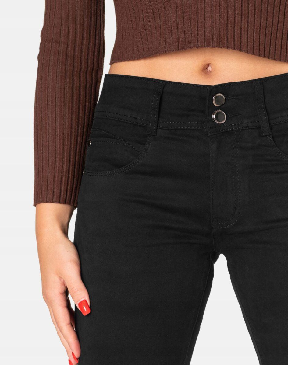Czarne spodnie bawełniane damskie model #5241 z klasyczną prostą nogawką to klasyka wśród klasyki i jeden z najczęściej wybieranych modeli spodni. Zapinane na kryty zamek błyskawiczny i dwa guziki. Z przodu mają dwie zaokrąglone kieszonki oraz mniejszą tzw. bilonówkę. Na tyle klasyczne naszywane kieszenie jak w typowych spodniach jeansowych. W pasie szlufki umożliwiające stylizacje z paskiem. Najbardziej podatne na uszkodzenia miejsca wzmocnione są dodatkowymi przeszyciami oraz ozdobnymi nitami.