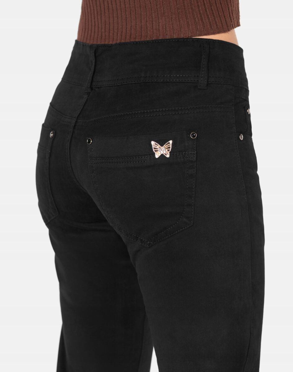 Czarne spodnie bawełniane damskie model #5241 z klasyczną prostą nogawką to klasyka wśród klasyki i jeden z najczęściej wybieranych modeli spodni. Zapinane na kryty zamek błyskawiczny i dwa guziki. Z przodu mają dwie zaokrąglone kieszonki oraz mniejszą tzw. bilonówkę. Na tyle klasyczne naszywane kieszenie jak w typowych spodniach jeansowych. W pasie szlufki umożliwiające stylizacje z paskiem. Najbardziej podatne na uszkodzenia miejsca wzmocnione są dodatkowymi przeszyciami oraz ozdobnymi nitami.