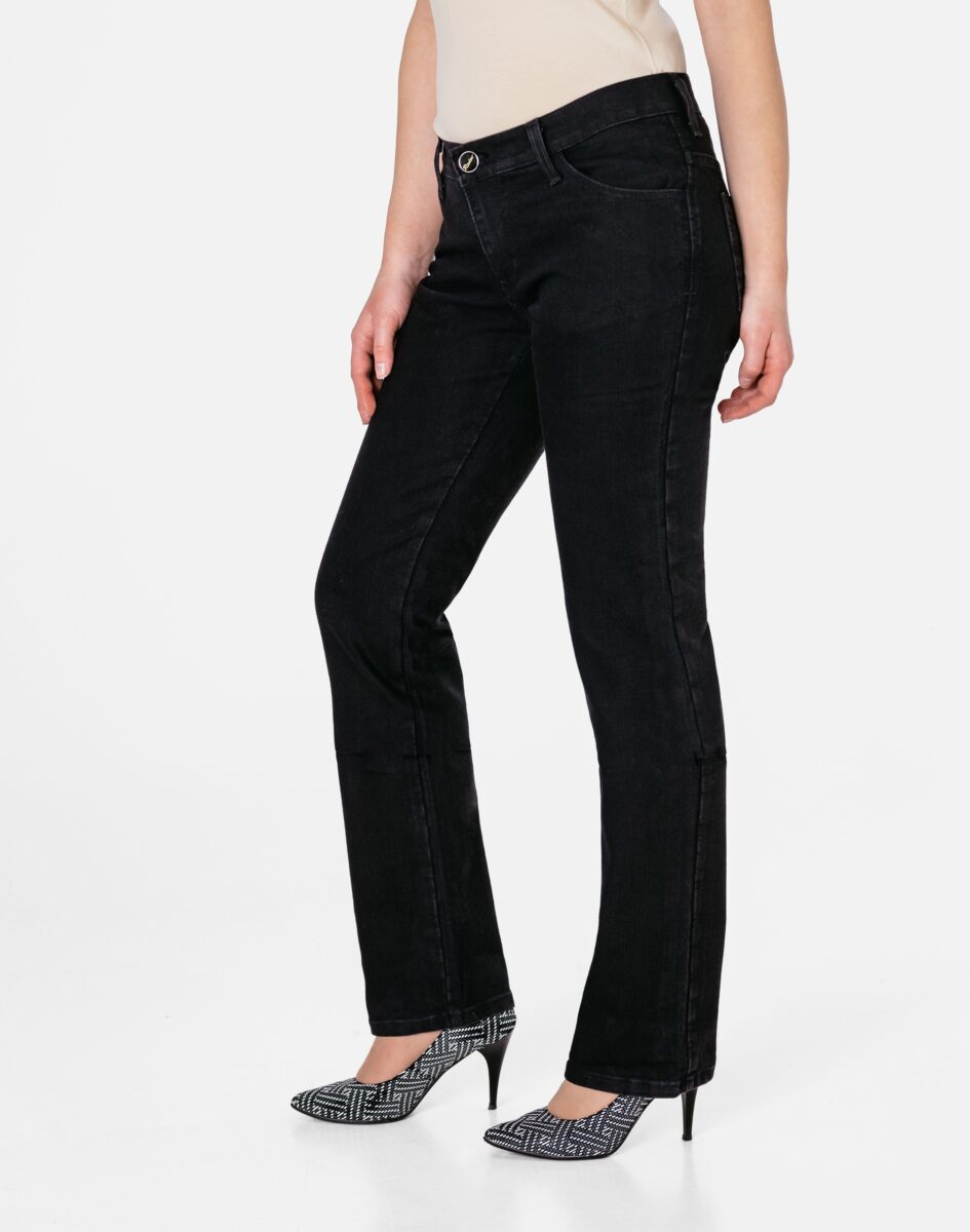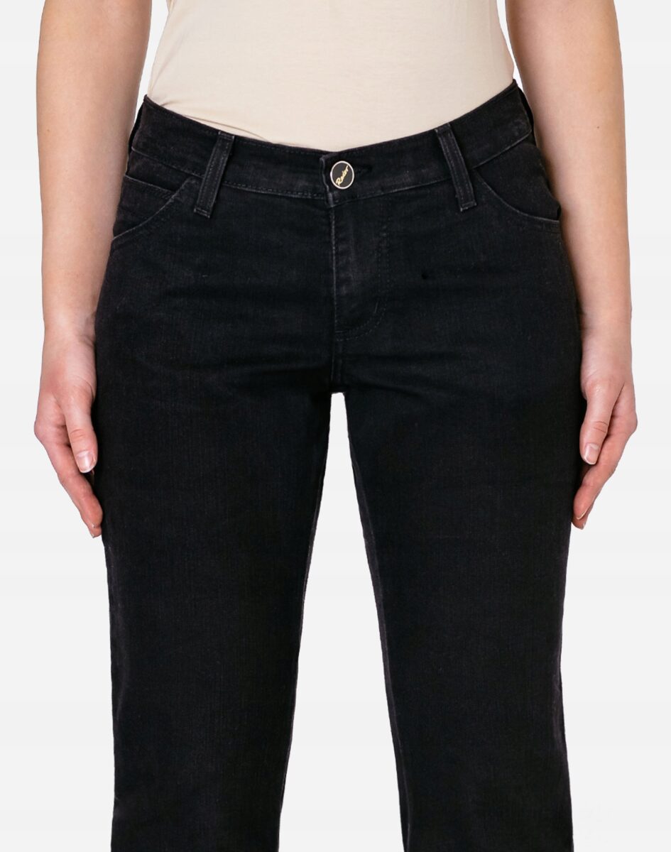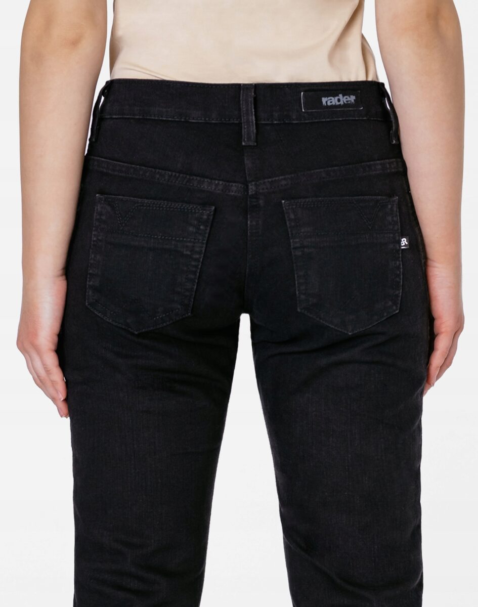 Czarne spodnie jeansowe damskie polskiej firmy RADER model #766/291 z klasyczną prostą nogawką to klasyka wśród klasyki i jeden z najczęściej wybieranych modeli spodni. Zapinane na kryty zamek błyskawiczny i guzik sygnowany logiem firmy. Z przodu mają dwie zaokrąglone kieszonki oraz mniejszą tzw. bilonówkę. Na tyle klasyczne naszywane kieszenie jak w typowych spodniach jeansowych. W pasie szlufki umożliwiające stylizacje z paskiem. Stan podwyższony "High Rise" zapewnia świetne dopasowanie i zgrabnie modeluje sylwetkę w talii. Najbardziej podatne na uszkodzenia miejsca wzmocnione są dodatkowymi podwójnymi przeszyciami.