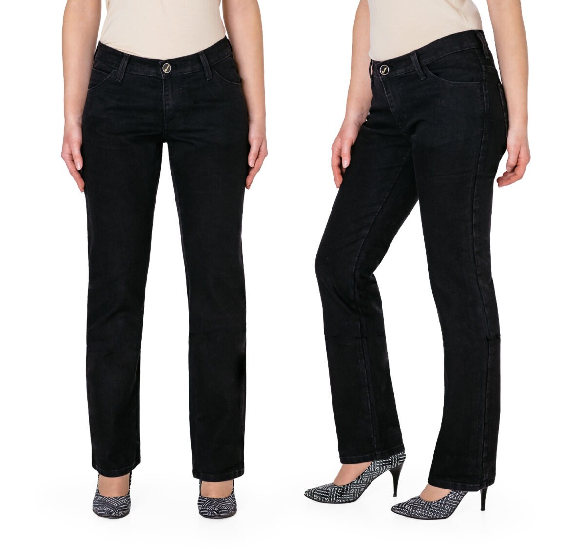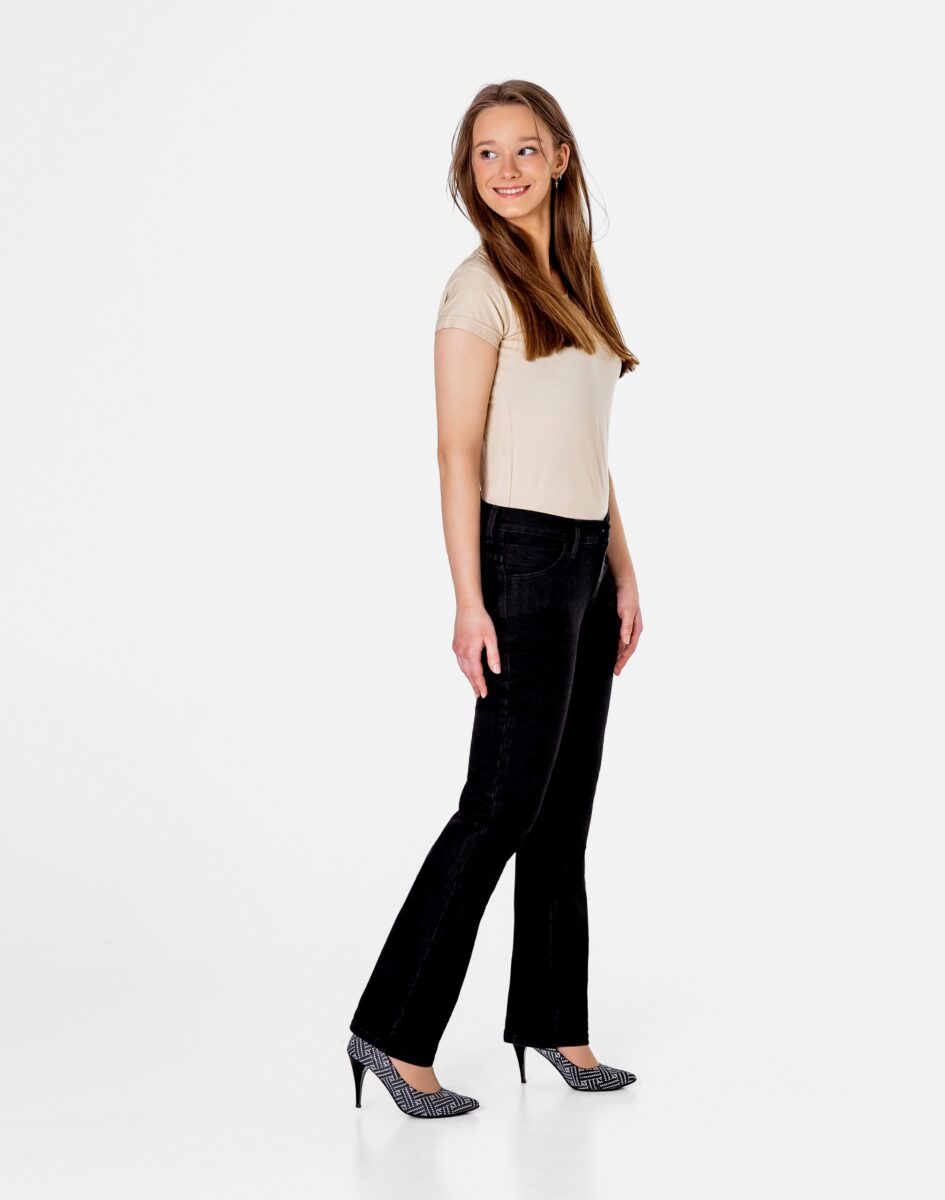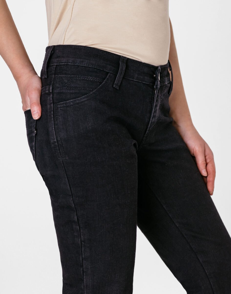 Czarne spodnie jeansowe damskie polskiej firmy RADER model #766/291 z klasyczną prostą nogawką to klasyka wśród klasyki i jeden z najczęściej wybieranych modeli spodni. Zapinane na kryty zamek błyskawiczny i guzik sygnowany logiem firmy. Z przodu mają dwie zaokrąglone kieszonki oraz mniejszą tzw. bilonówkę. Na tyle klasyczne naszywane kieszenie jak w typowych spodniach jeansowych. W pasie szlufki umożliwiające stylizacje z paskiem. Stan podwyższony "High Rise" zapewnia świetne dopasowanie i zgrabnie modeluje sylwetkę w talii. Najbardziej podatne na uszkodzenia miejsca wzmocnione są dodatkowymi podwójnymi przeszyciami.