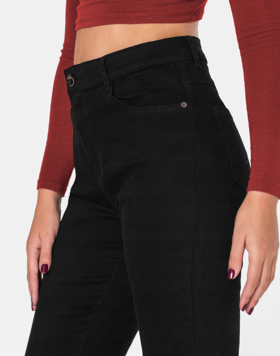 Czarne spodnie jeansowe damskie model #1859 z klasyczną prostą nogawką to klasyka wśród klasyki i jeden z najczęściej wybieranych modeli spodni. Zapinane na kryty zamek błyskawiczny i guzik. Z przodu mają dwie zaokrąglone kieszonki oraz mniejszą tzw. bilonówkę. Na tyle klasyczne naszywane kieszenie jak w typowych spodniach jeansowych. W pasie szlufki umożliwiające stylizacje z paskiem. Najbardziej podatne na uszkodzenia miejsca wzmocnione są dodatkowymi przeszyciami oraz ozdobnymi nitami.