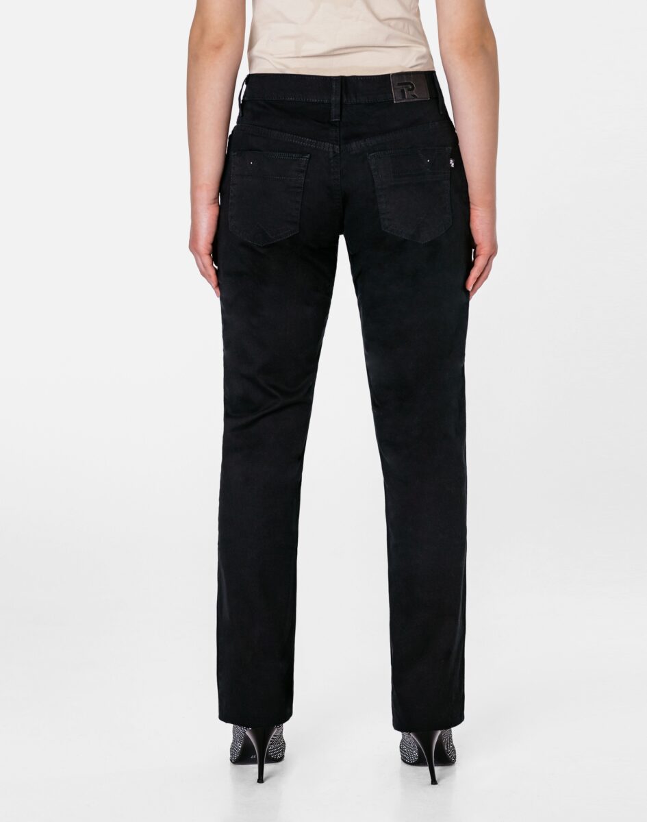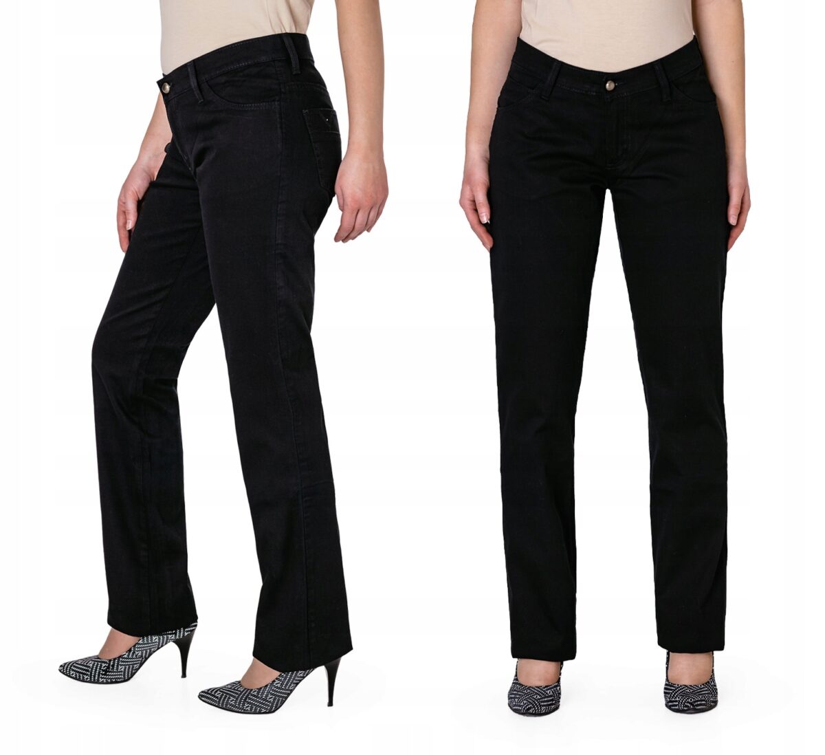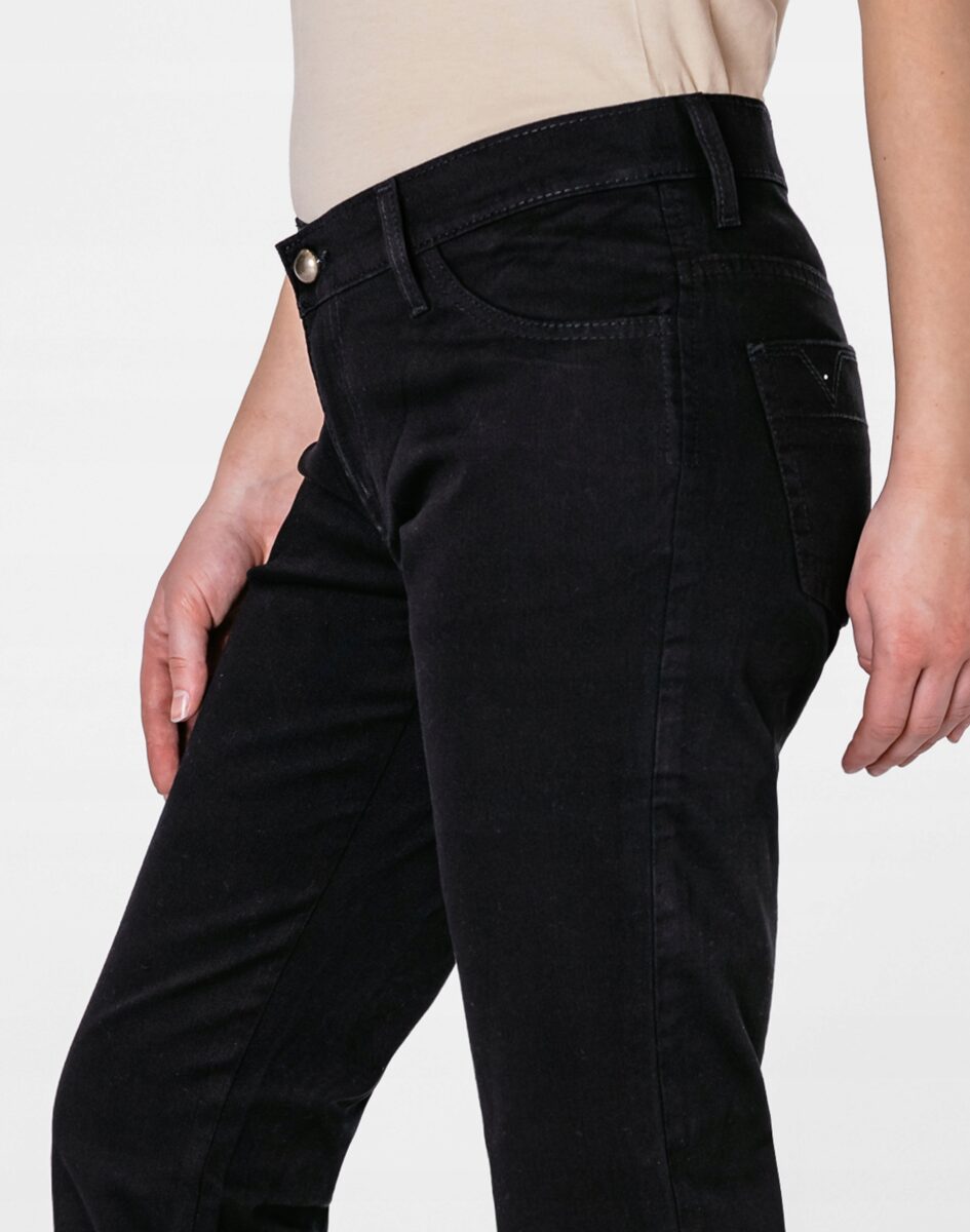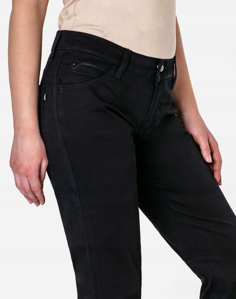 Czarne spodnie jeansowe damskie polskiej firmy RADER model #766/233 z klasyczną prostą nogawką to klasyka wśród klasyki i jeden z najczęściej wybieranych modeli spodni. Zapinane na kryty zamek błyskawiczny i guzik sygnowany logiem firmy. Z przodu mają dwie zaokrąglone kieszonki oraz mniejszą tzw. bilonówkę. Na tyle klasyczne naszywane kieszenie jak w typowych spodniach jeansowych. W pasie szlufki umożliwiające stylizacje z paskiem. Stan podwyższony "High Rise" zapewnia świetne dopasowanie i zgrabnie modeluje sylwetkę w talii. Najbardziej podatne na uszkodzenia miejsca wzmocnione są dodatkowymi podwójnymi przeszyciami.