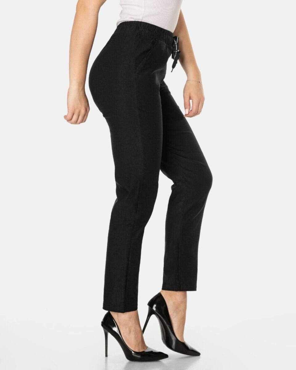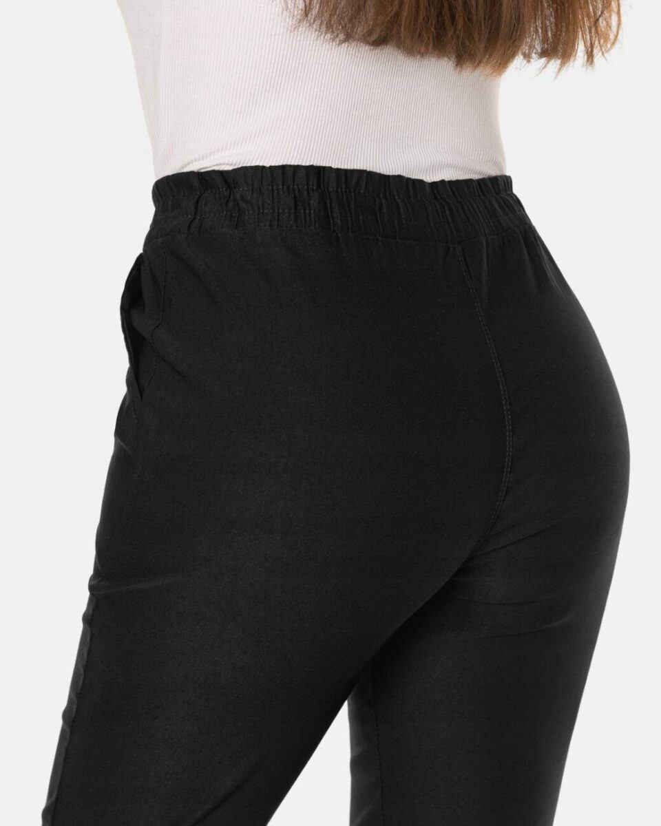 Wykonane z wysokiej jakości tkaniny z dodatkiem elastanu (lycra) dzięki czemu spodnie są bardziej elastyczne, bardzo dobrze się układają i dopasowują do każdej figury. Pozwalają na pełną swobodę ruchów co daje komfort przy siadaniu i zapewnia ogromny komfort noszenia. Trwałe i elastyczne wykończenie spodni (użycie do produkcji elastycznych nici) gwarantuje komfort i wygodę ich użytkownikowi w każdych warunkach, a tkanina jest na tyle gruba, że nie widać przez nią bielizny. Sprawdzony przez wiele zadowolonych klientek uniwersalni i modny krój typu cygaretki z lekko zwężoną nogawką i wyższym stanem, które założysz na wiele różnych okazji.