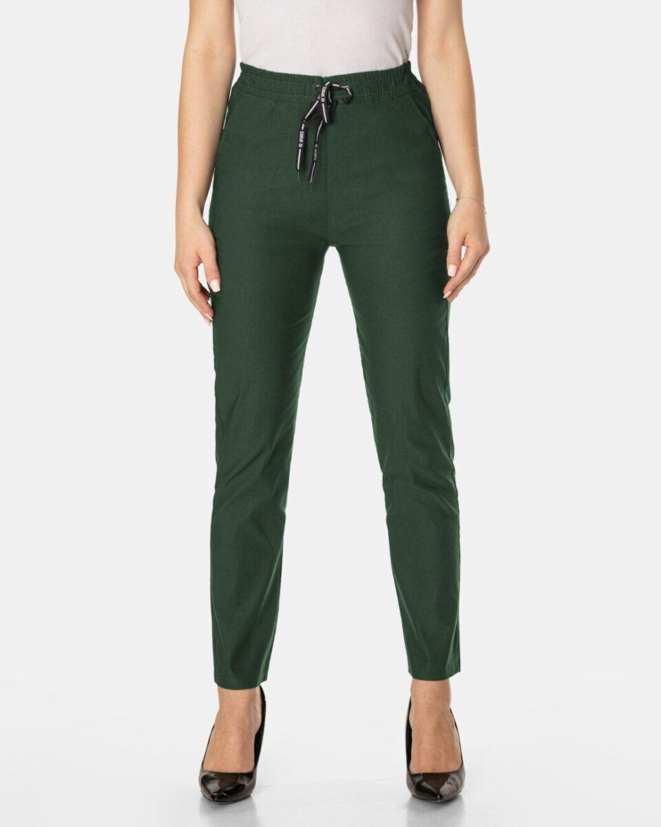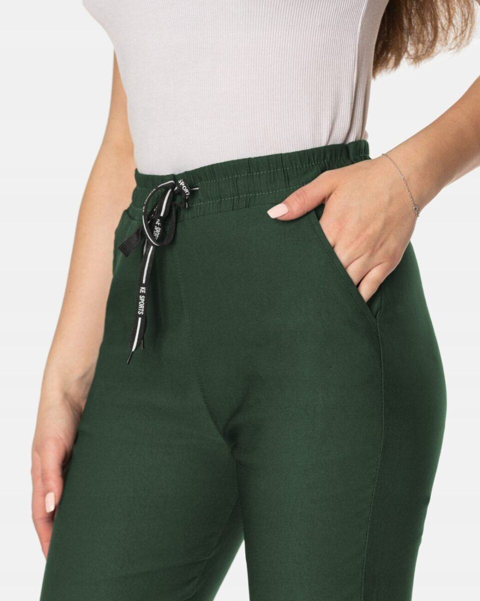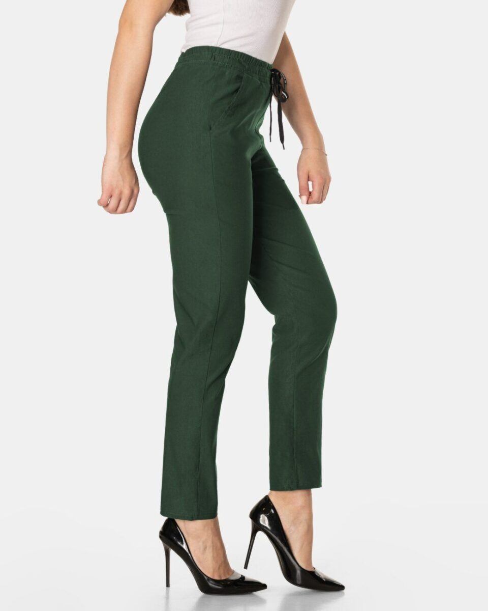 Wykonane z wysokiej jakości tkaniny z dodatkiem elastanu (lycra) dzięki czemu spodnie są bardziej elastyczne, bardzo dobrze się układają i dopasowują do każdej figury. Pozwalają na pełną swobodę ruchów co daje komfort przy siadaniu i zapewnia ogromny komfort noszenia. Trwałe i elastyczne wykończenie spodni (użycie do produkcji elastycznych nici) gwarantuje komfort i wygodę ich użytkownikowi w każdych warunkach, a tkanina jest na tyle gruba, że nie widać przez nią bielizny. Sprawdzony przez wiele zadowolonych klientek uniwersalni i modny krój typu cygaretki z lekko zwężoną nogawką i wyższym stanem, które założysz na wiele różnych okazji.