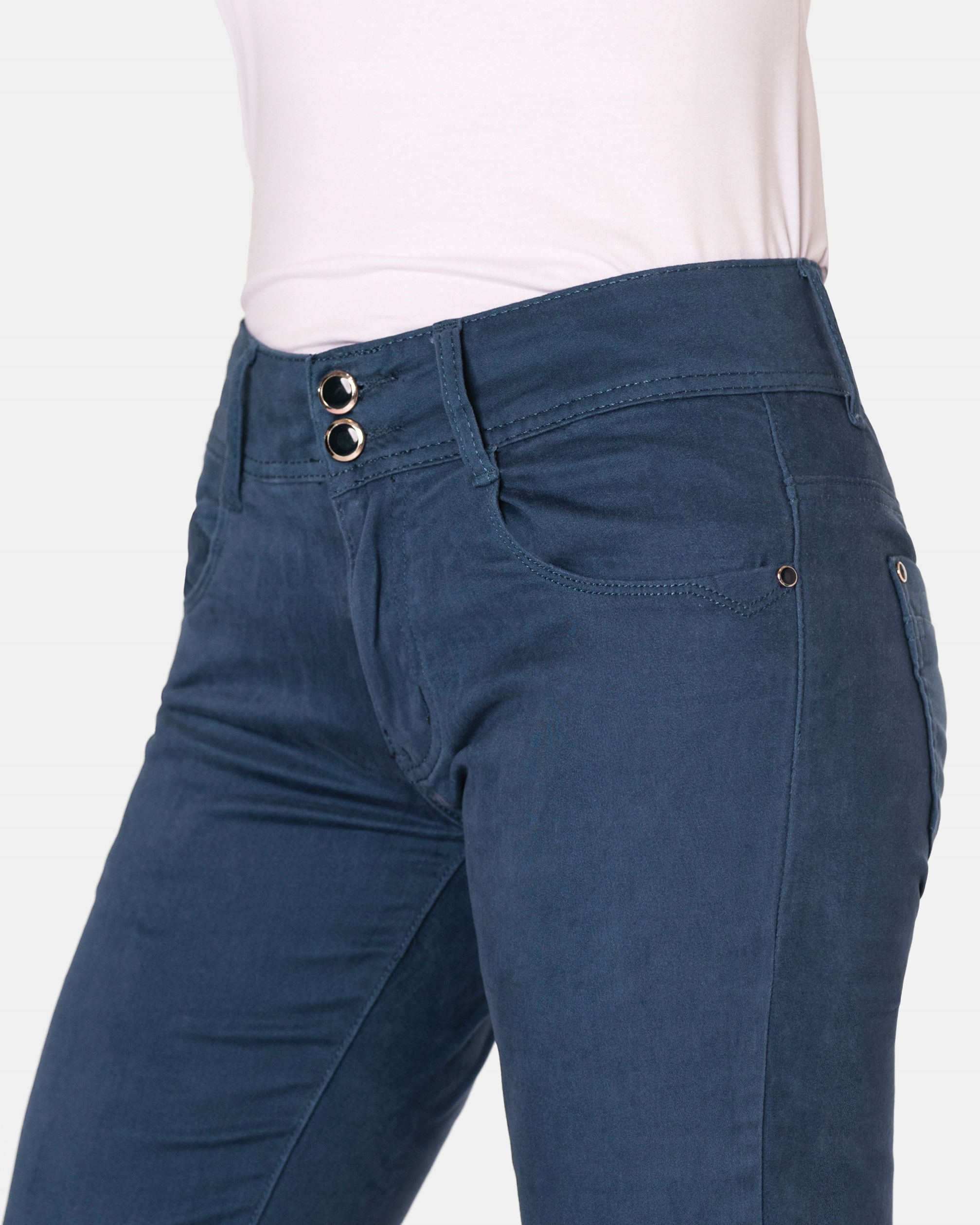 Spodnie bawełniane damskie model #5234 z klasyczną prostą nogawką to klasyka wśród klasyki i jeden z najczęściej wybieranych modeli spodni. Zapinane na kryty zamek błyskawiczny i dwa guziki. Z przodu mają dwie zaokrąglone kieszonki oraz mniejszą tzw. bilonówkę. Na tyle klasyczne naszywane kieszenie jak w typowych spodniach jeansowych. W pasie szlufki umożliwiające stylizacje z paskiem. Najbardziej podatne na uszkodzenia miejsca wzmocnione są dodatkowymi przeszyciami oraz ozdobnymi nitami.