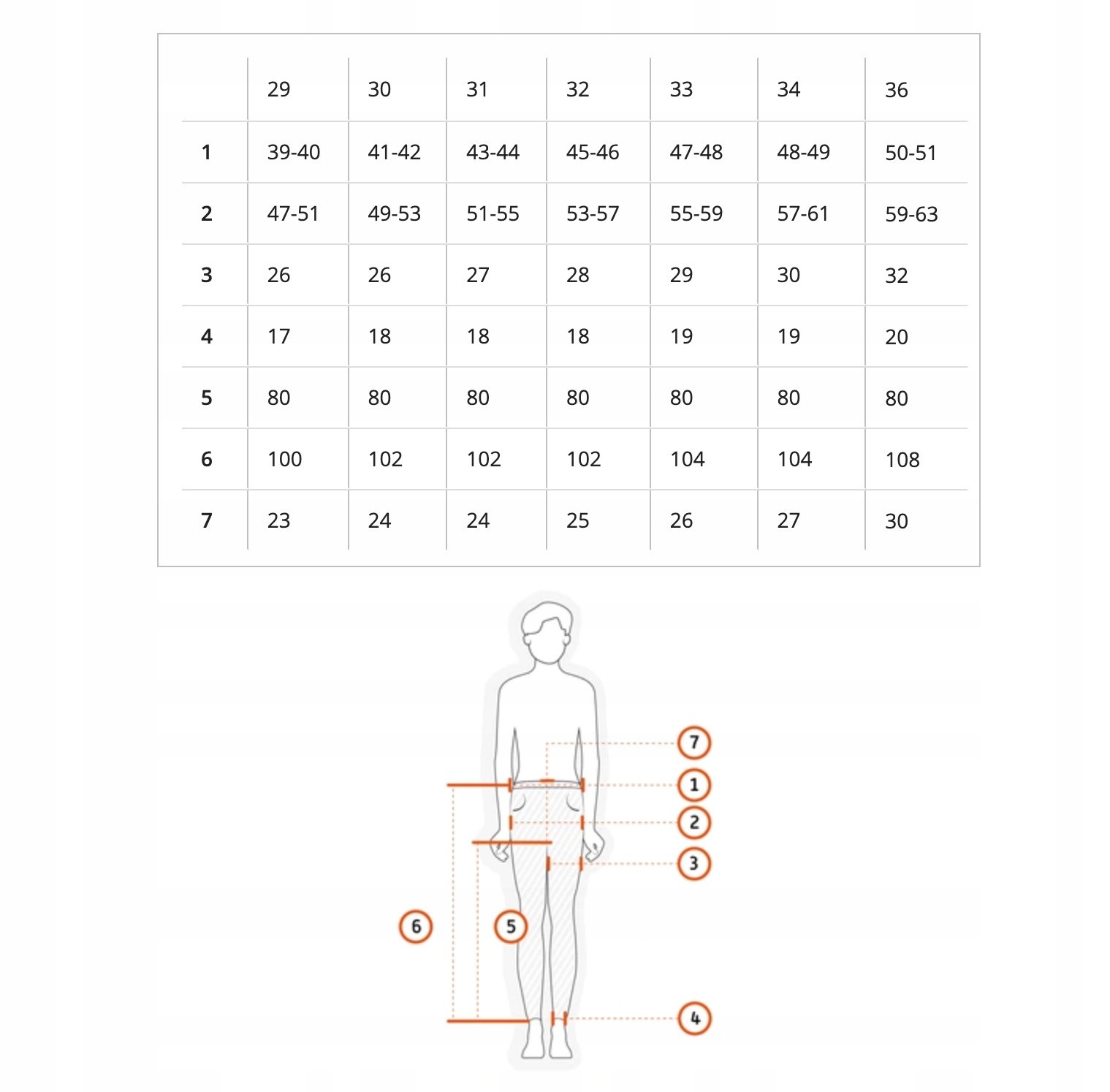 rozmiarszerokość w pasie (cm)szerokość w biodrach (cm)szerokość w udzie (cm)szerokość na dole nogawki (cm)długość nogawki od kroku (cm)długość nogawki zewnętrzna (cm)wysokość pasa (cm)