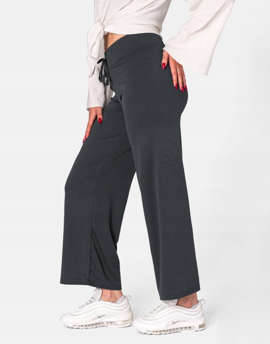 Z założenia wyróżniają się dużą wygodą a dopasowanie w pasie zapewnia szeroki, elastyczny pas ściągający zgrabnie modelujący sylwetkę w talii. Stan podwyższony "High Rise" i szerokie nogawki idealnie równoważą proporcje sylwetki a dzięki nieco ekstrawaganckiemu charakterowi sprawią, że nawet minimalistyczna stylizacja będzie prezentować się nietuzinkowo. Zaprezentują Cię jako osobę, która lubi czuć się wygodnie i uwielbia najnowsze trendy aby bawić się własnym stylem w modzie.