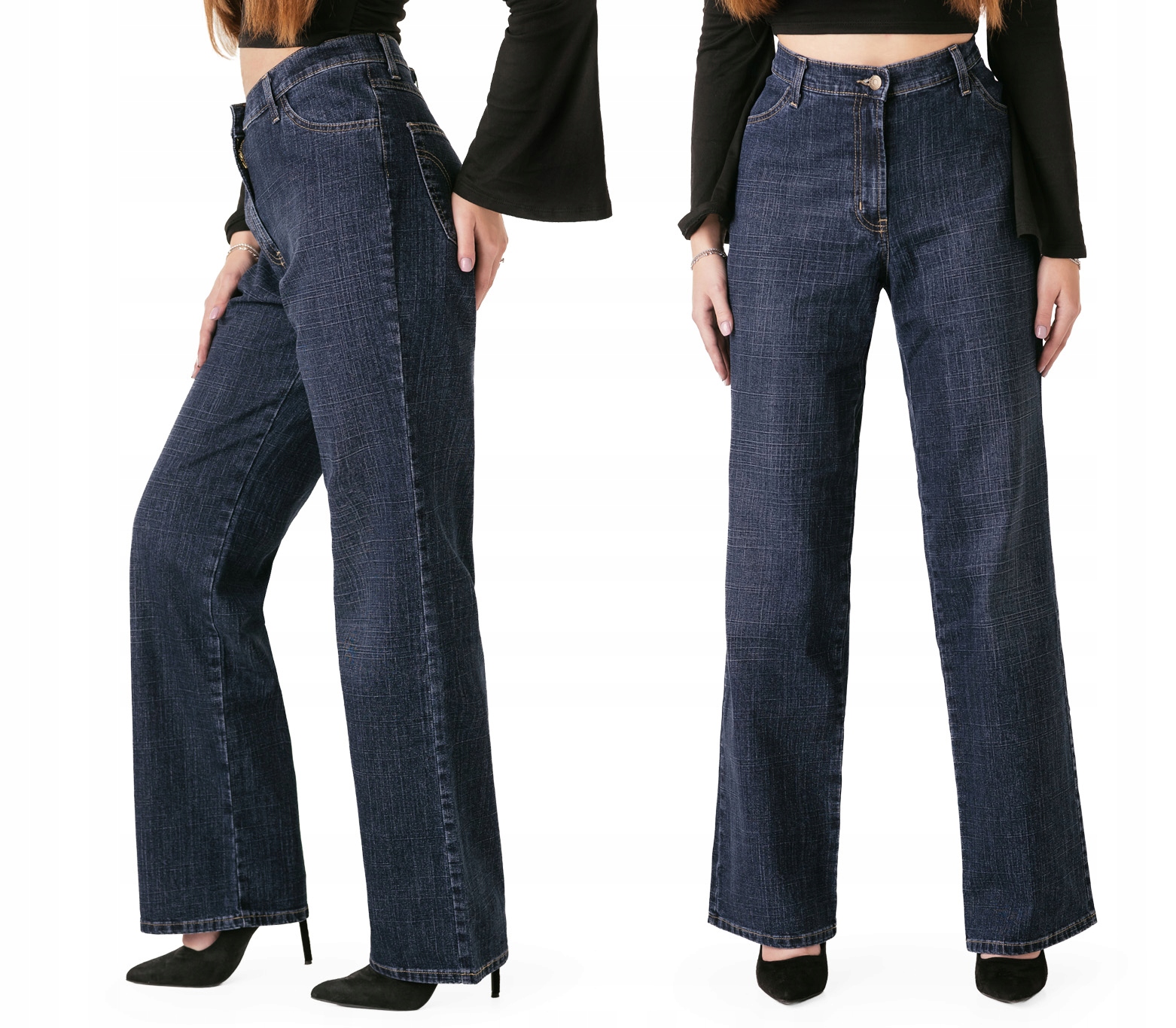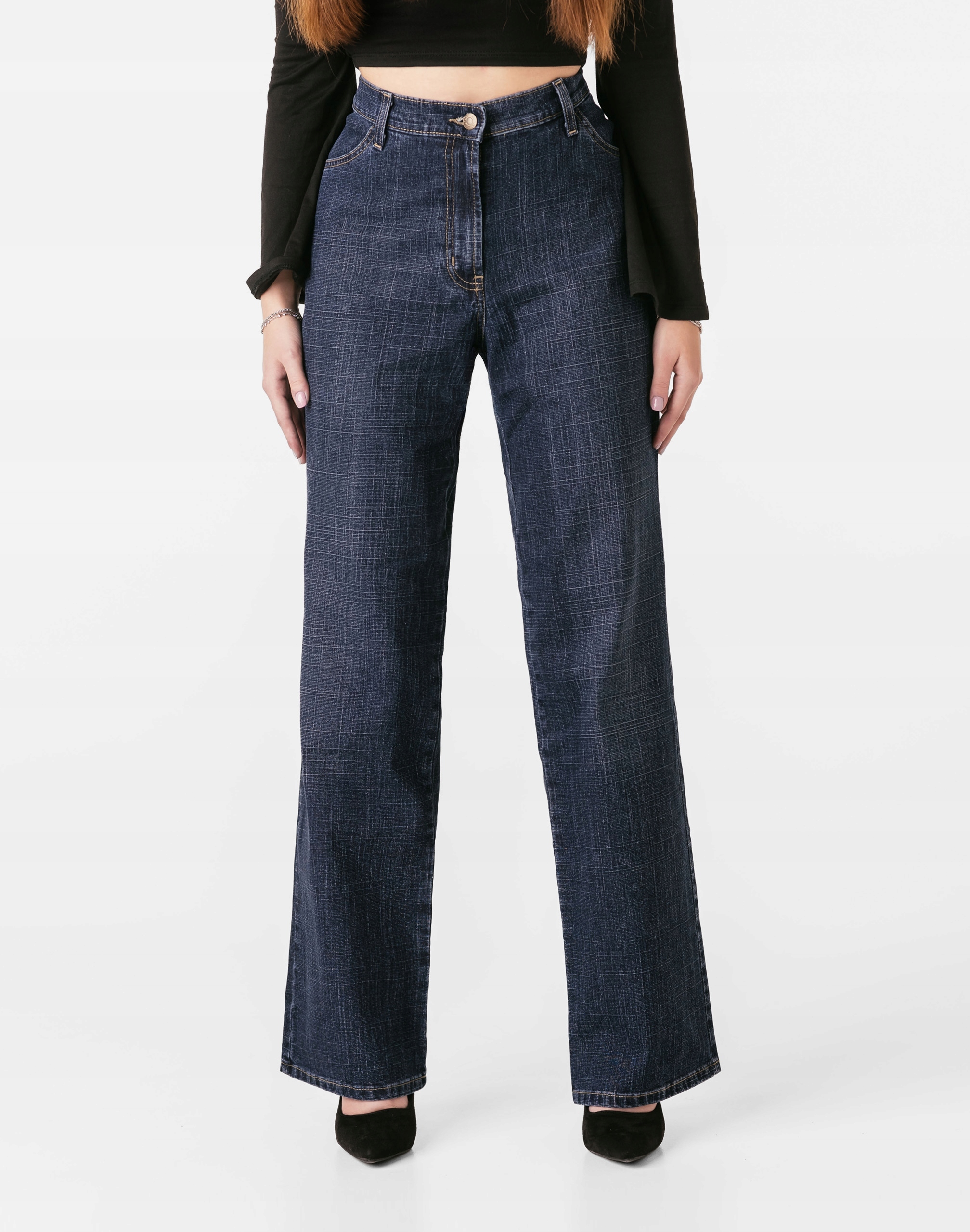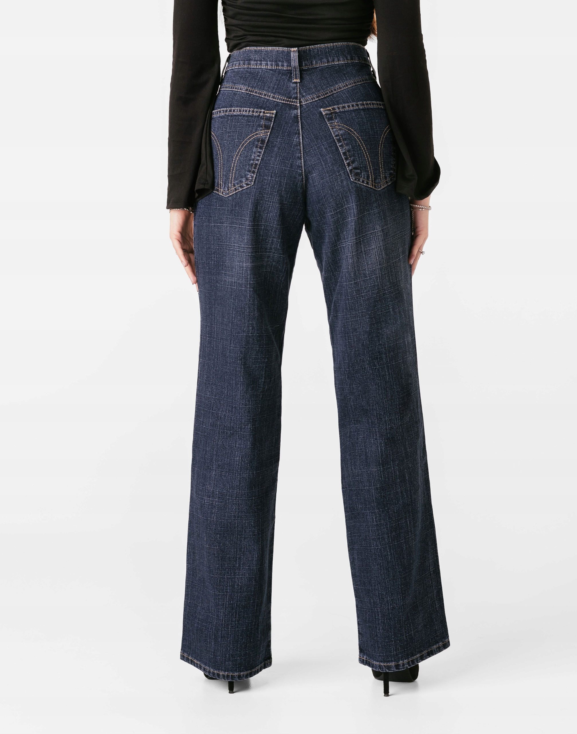 Granatowe spodnie jeansowe damskie polskiej firmy RADER model #715/083 z klasyczną prostą, luźną nogawką to klasyka wśród klasyki i jeden z najczęściej wybieranych modeli spodni. Zapinane na kryty zamek błyskawiczny i guzik sygnowany logiem firmy. Z przodu mają dwie zaokrąglone kieszonki. Na tyle klasyczne naszywane kieszenie jak w typowych spodniach jeansowych. W pasie szlufki umożliwiające stylizacje z paskiem. Stan podwyższony "High Rise" zapewnia świetne dopasowanie i zgrabnie modeluje sylwetkę w talii. Najbardziej podatne na uszkodzenia miejsca wzmocnione są podwójnymi przeszyciami.