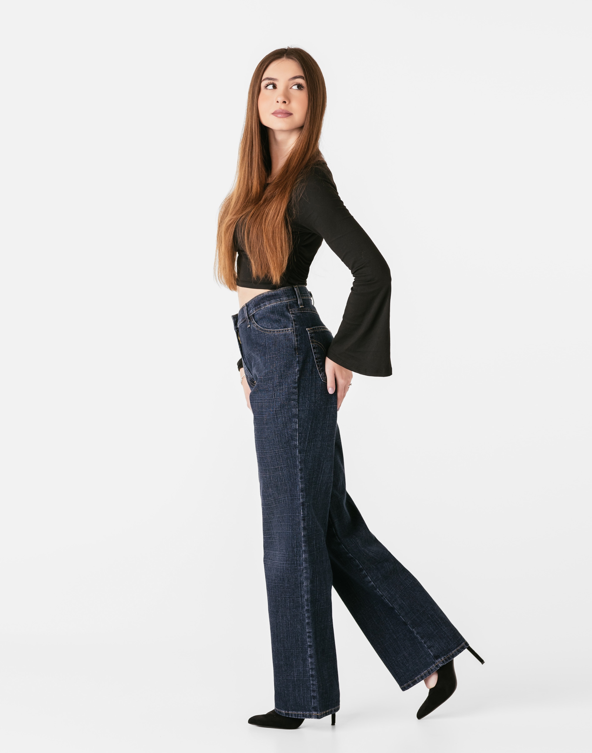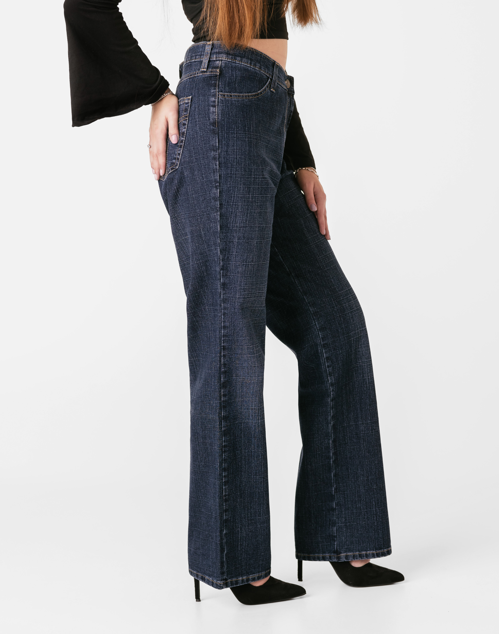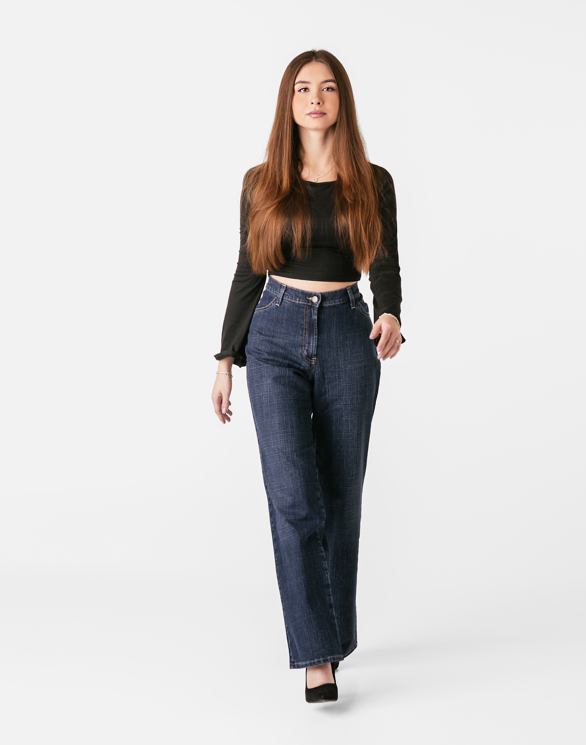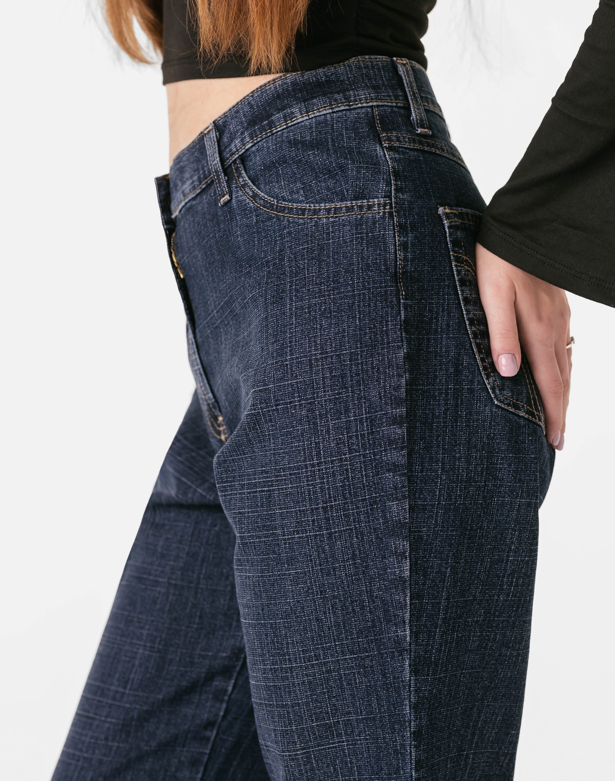 Granatowe spodnie jeansowe damskie polskiej firmy RADER model #715/083 z klasyczną prostą, luźną nogawką to klasyka wśród klasyki i jeden z najczęściej wybieranych modeli spodni. Zapinane na kryty zamek błyskawiczny i guzik sygnowany logiem firmy. Z przodu mają dwie zaokrąglone kieszonki. Na tyle klasyczne naszywane kieszenie jak w typowych spodniach jeansowych. W pasie szlufki umożliwiające stylizacje z paskiem. Stan podwyższony "High Rise" zapewnia świetne dopasowanie i zgrabnie modeluje sylwetkę w talii. Najbardziej podatne na uszkodzenia miejsca wzmocnione są podwójnymi przeszyciami.