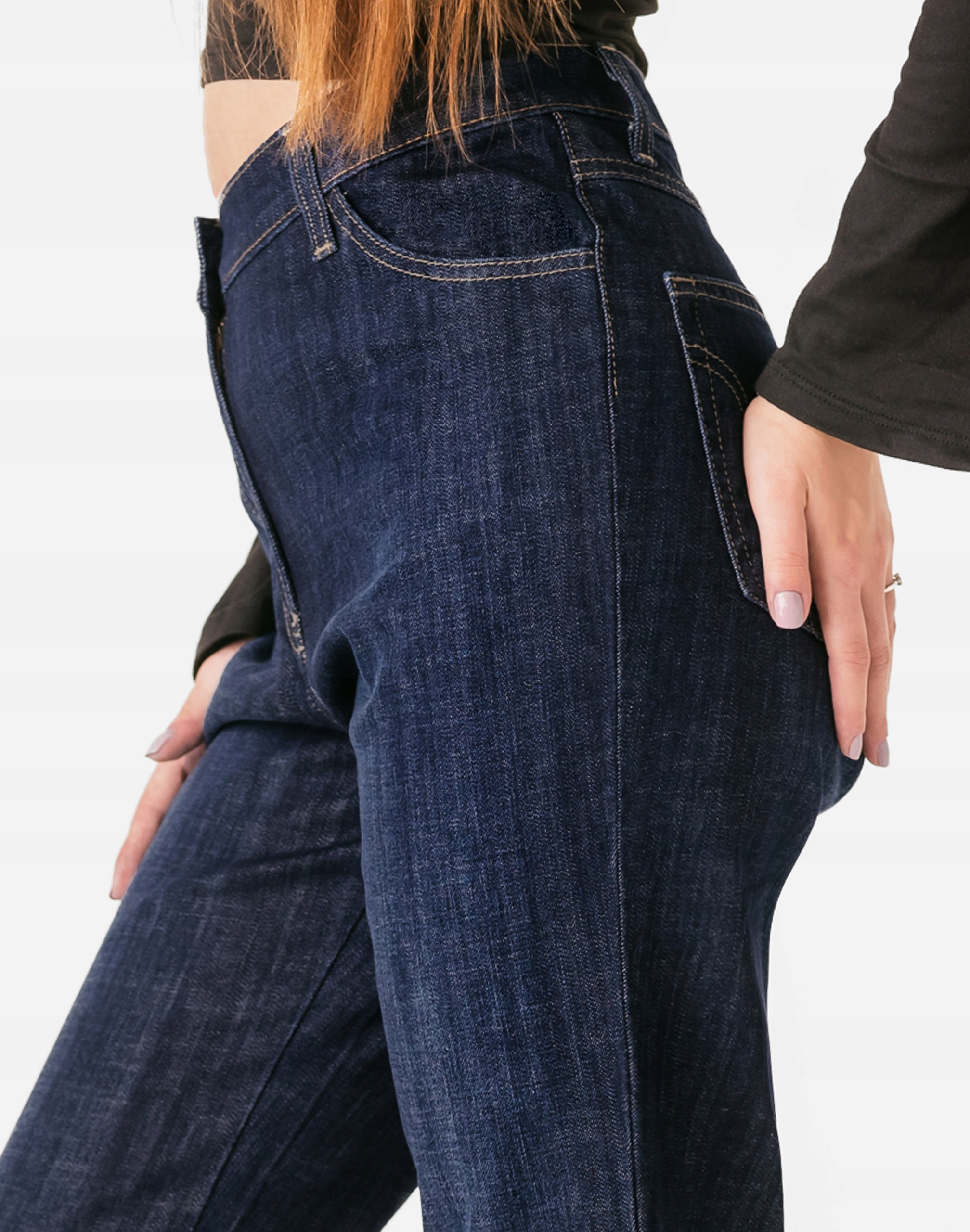 Granatowe spodnie jeansowe damskie polskiej firmy RADER model #715/082 z klasyczną prostą, luźną nogawką to klasyka wśród klasyki i jeden z najczęściej wybieranych modeli spodni. Zapinane na kryty zamek błyskawiczny i guzik sygnowany logiem firmy. Z przodu mają dwie zaokrąglone kieszonki. Na tyle klasyczne naszywane kieszenie jak w typowych spodniach jeansowych. W pasie szlufki umożliwiające stylizacje z paskiem. Stan podwyższony "High Rise" zapewnia świetne dopasowanie i zgrabnie modeluje sylwetkę w talii. Najbardziej podatne na uszkodzenia miejsca wzmocnione są podwójnymi przeszyciami.