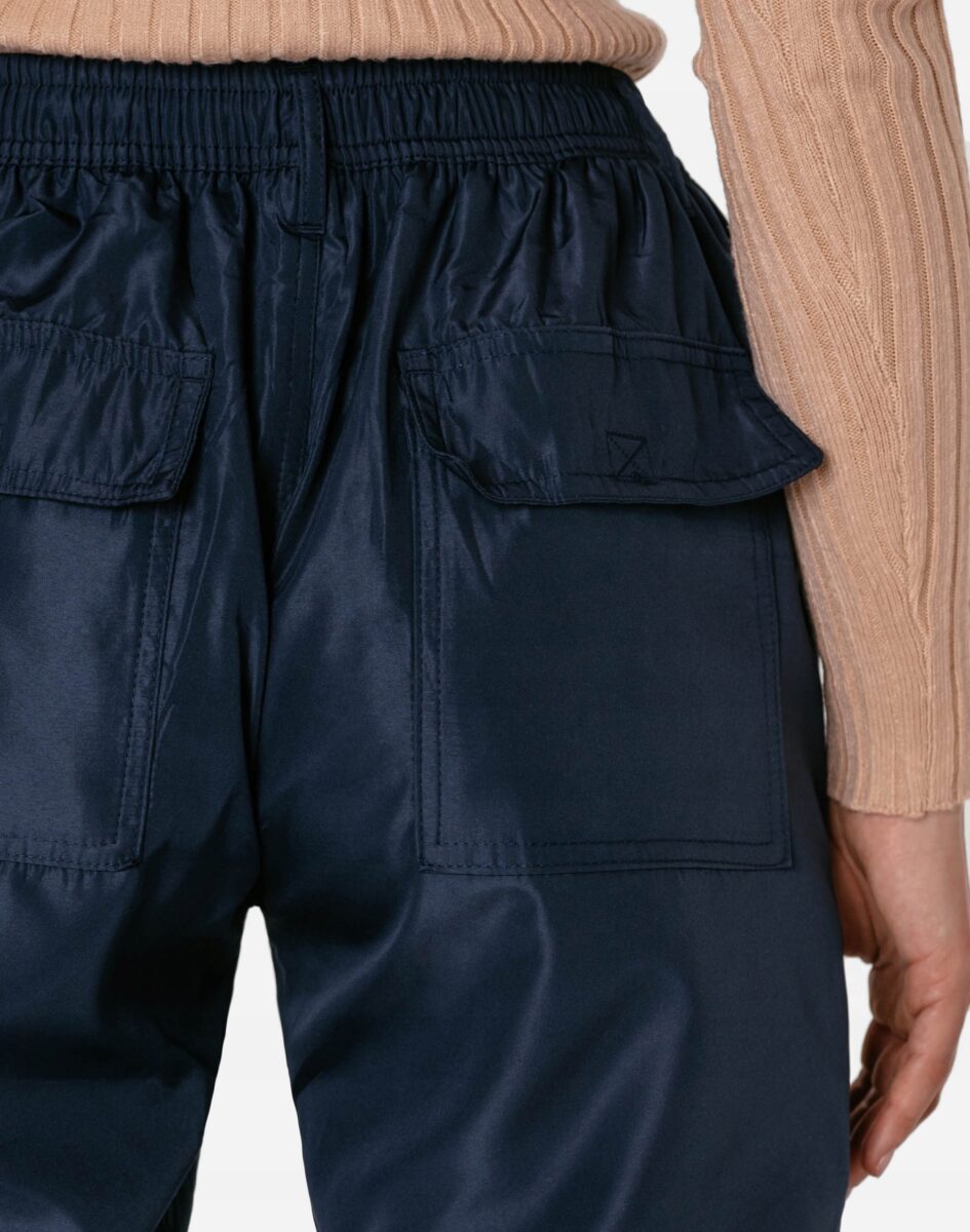 - Szeroki elastyczny ściągacz w pasie z taśmą regulacyjną do zawiązywania