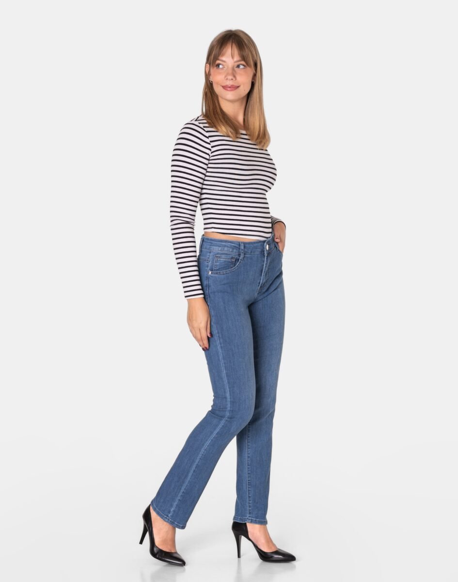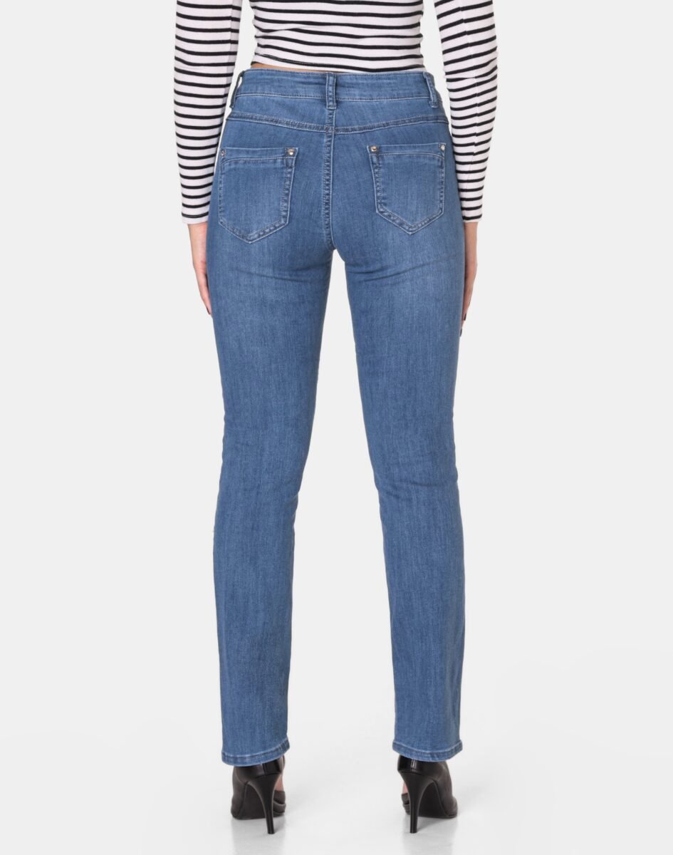 Jeansowe spodnie damskie model #3715 z klasyczną prostą nogawką to klasyka wśród klasyki i jeden z najczęściej wybieranych modeli spodni. Zapinane na kryty zamek błyskawiczny i guzik. Z przodu mają dwie zaokrąglone kieszonki oraz mniejszą tzw. bilonówkę. Na tyle klasyczne naszywane kieszenie jak w typowych spodniach jeansowych. W pasie szlufki umożliwiające stylizacje z paskiem. Najbardziej podatne na uszkodzenia miejsca wzmocnione są dodatkowymi przeszyciami oraz ozdobnymi nitami.