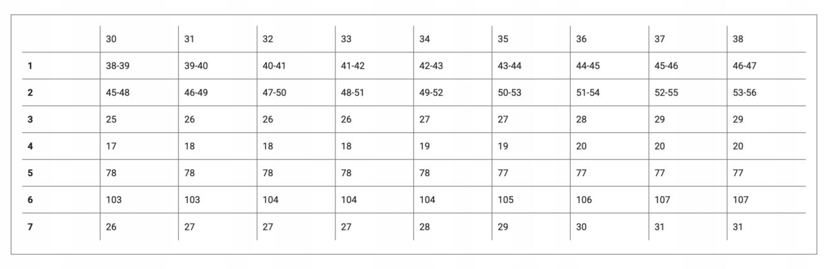 rozmiarszerokość w pasie (cm)szerokość w biodrach (cm)szerokość w udzie (cm)szerokość na dole nogawki (cm)długość nogawki od kroku (cm)długość nogawki zewnętrzna (cm)wysokość pasa (cm)