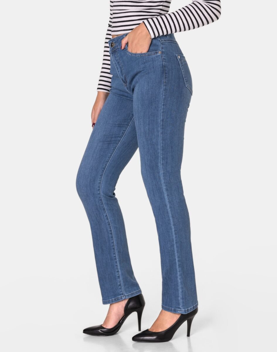 Jeansowe spodnie damskie model #3715 z klasyczną prostą nogawką to klasyka wśród klasyki i jeden z najczęściej wybieranych modeli spodni. Zapinane na kryty zamek błyskawiczny i guzik. Z przodu mają dwie zaokrąglone kieszonki oraz mniejszą tzw. bilonówkę. Na tyle klasyczne naszywane kieszenie jak w typowych spodniach jeansowych. W pasie szlufki umożliwiające stylizacje z paskiem. Najbardziej podatne na uszkodzenia miejsca wzmocnione są dodatkowymi przeszyciami oraz ozdobnymi nitami.