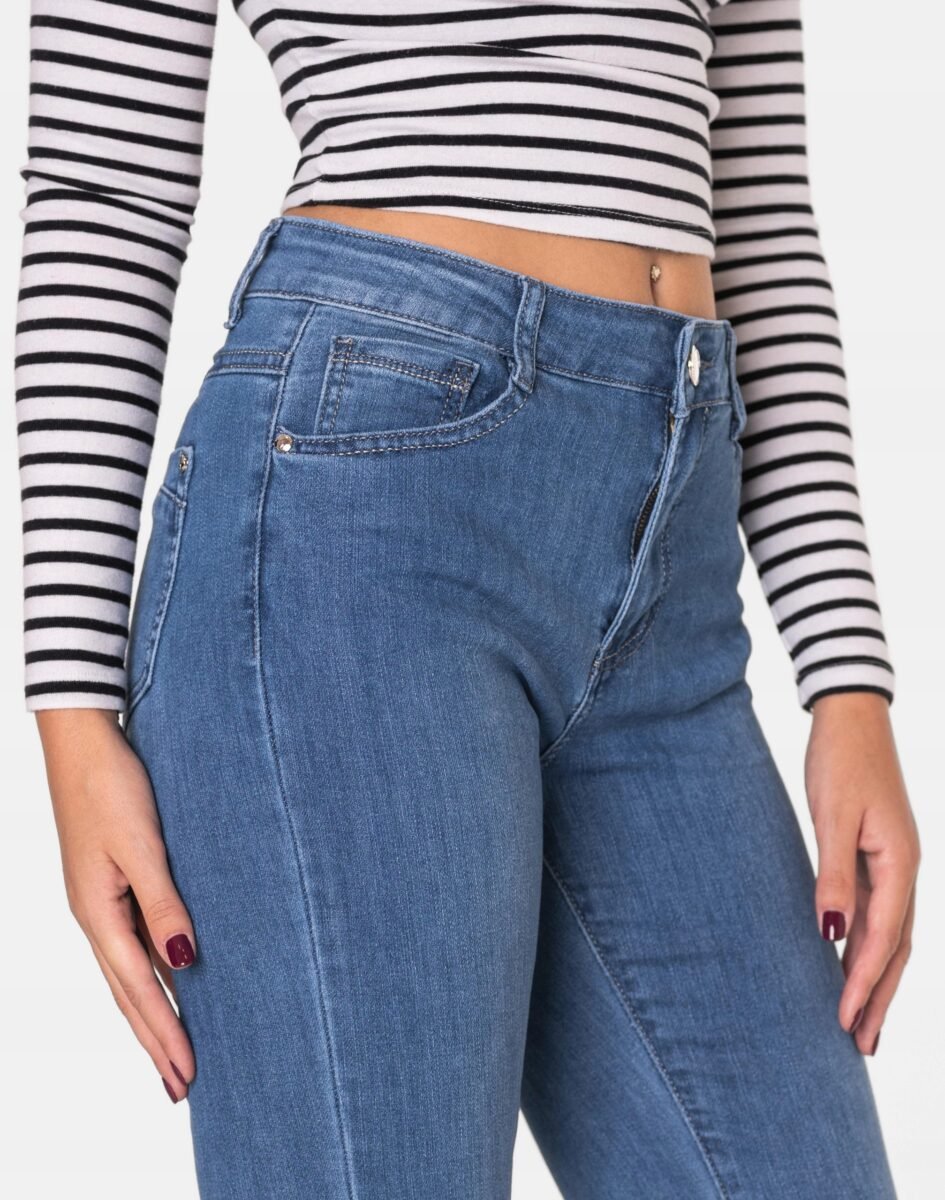 Oferowane przez nas spodnie uszyte są z wysokiej jakości tkaniny jeansowej "Denim Light Blue" średniej grubości z domieszką lycry (elastan), która odznacza się wysoką elastycznością, co gwarantuje, że spodnie nie będą się deformować i odkształcać nawet po długim użytkowaniu. Łatwo się je zakłada i są znacznie wygodniejsze od spodni, które lycry nie mają. Poza tym bawełna ma tendencję do kurczenia się w praniu, dlatego lycra sprawia, że spodnie są wyjątkowo praktyczne i można je bez problemu założyć po wysuszeniu. Pozwalają na pełną swobodę ruchów, co daje komfort przy siadaniu i zapewnia ogromny komfort noszenia. Modny i sprawdzony krój spodni sprawi, że w zależności od dopasowanego do nich elementu garderoby stworzysz wiele udanych stylizacji, w których będziesz czuła się wygodnie i swobodnie. Możesz je śmiało łączyć zarówno z eleganckimi szpilkami (idealnie wydłużają kobiece nogi), lub w wersji bardziej "na luzie" z balerinami lub czółenkami na wysokim obcasie, a Twoja stylizacja nabierze wyjątkowego charakteru. Zapewniają poczucie atrakcyjności przy jednoczesnym zachowaniu wygody i pełnej swobody ruchów. Sprawdzony przez wiele zadowolonych klientek fason spodni z klasyczną prostą nogawką pozwoli Ci założyć je na wiele różnych okazji.