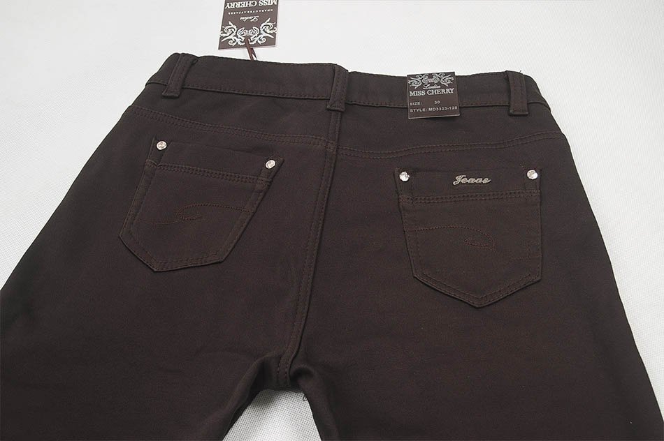 Zapinane na kryty zamek błyskawiczny i guzik sygnowany logiem firmy. Z przodu mają dwie kieszonki zaokrąglone oraz mniejszą kieszonkę tzw. bilonówkę a na tyle klasyczne kieszenie naszywane jak w typowych spodniach jeansowych. W pasie szlufki umożliwiające stylizacje z paskiem. Najbardziej podatne na uszkodzenia miejsca wzmocnione są dodatkowymi przeszyciami oraz ozdobnymi nitami. Uszyte z wysokiej jakości bawełny z domieszką lycry dzięki czemu spodnie są elastyczne, bardzo dobrze dopasowują się do każdej sylwetki, nie wałkują się, nie marszczą i idealnie leżą. Pozwalają na pełną swobodę ruchów co daje komfort przy siadaniu i zapewnia ogromny komfort noszenia. Uniwersalny zawsze modny klasyczny krój z wąską nogawką typu rurka i wyższym podkreślającym talię stanem.