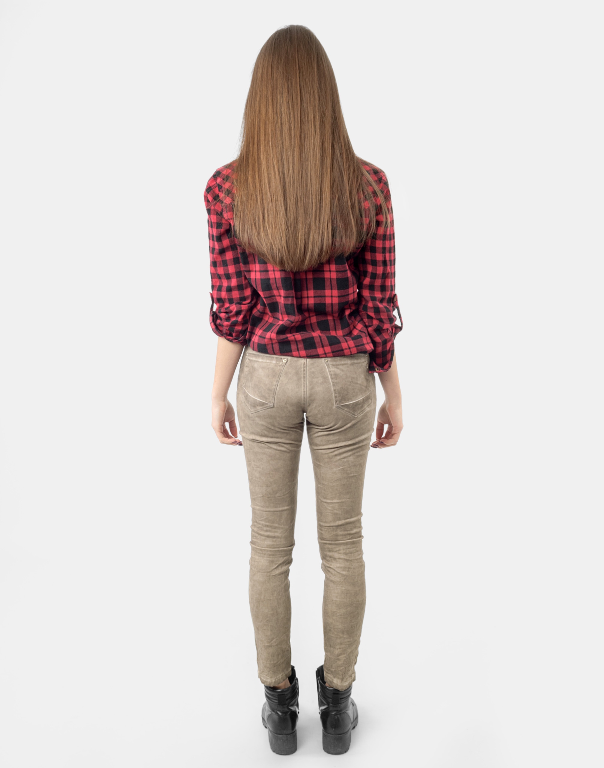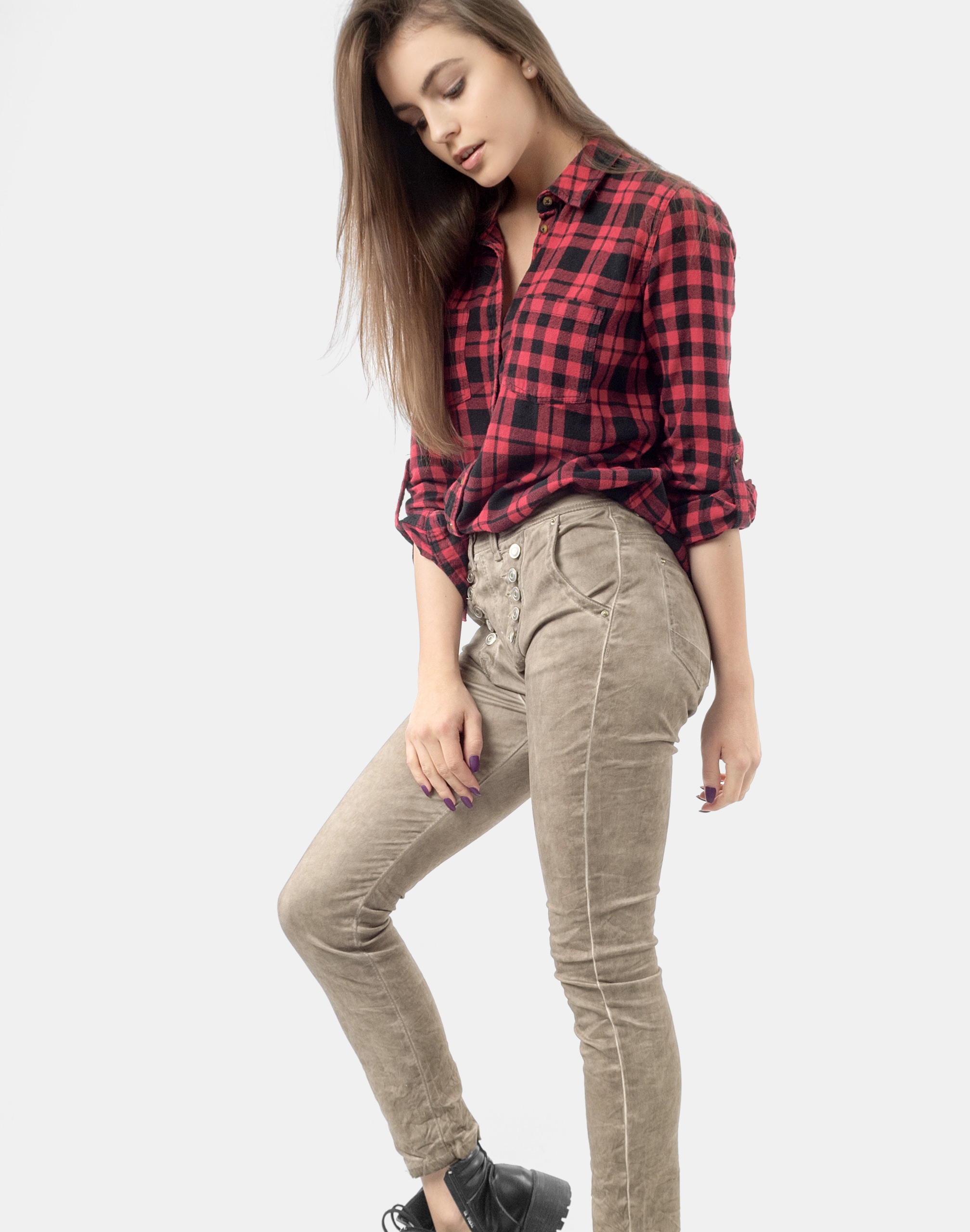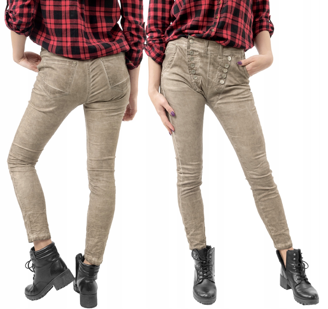 Uszyte z wysokiej jakości tkaniny bawełnianej z domieszką lycry (elastan), która odznacza się wysoką elastycznością co gwarantuje że spodnie nie będą się deformować i odkształcać nawet po długim użytkowaniu. Świetnie przylegają do ciała i pozwalają na pełną swobodę ruchów, co daje komfort przy siadaniu i zapewnia ogromny komfort noszenia. Zapinane na rząd ozdobnych guzików w pasie mają szlufki umożliwiające stylizacje z paskiem. Z przodu dwie kieszonki zaokrąglone + bilonówka, z tyłu dwie kieszenie nakładane jak w typowych spodniach jeansowych. Charakterystyczne dla stylu Used-Look przetarcia i pomarszczenia mające na celu wywołanie modnego efektu znoszonych jeansów, optycznie wysmuklają, odwracając uwagę od ewentualnych niedoskonałości. Najbardziej podatne na uszkodzenia miejsca wzmocnione są dodatkowymi przeszyciami oraz nitami.