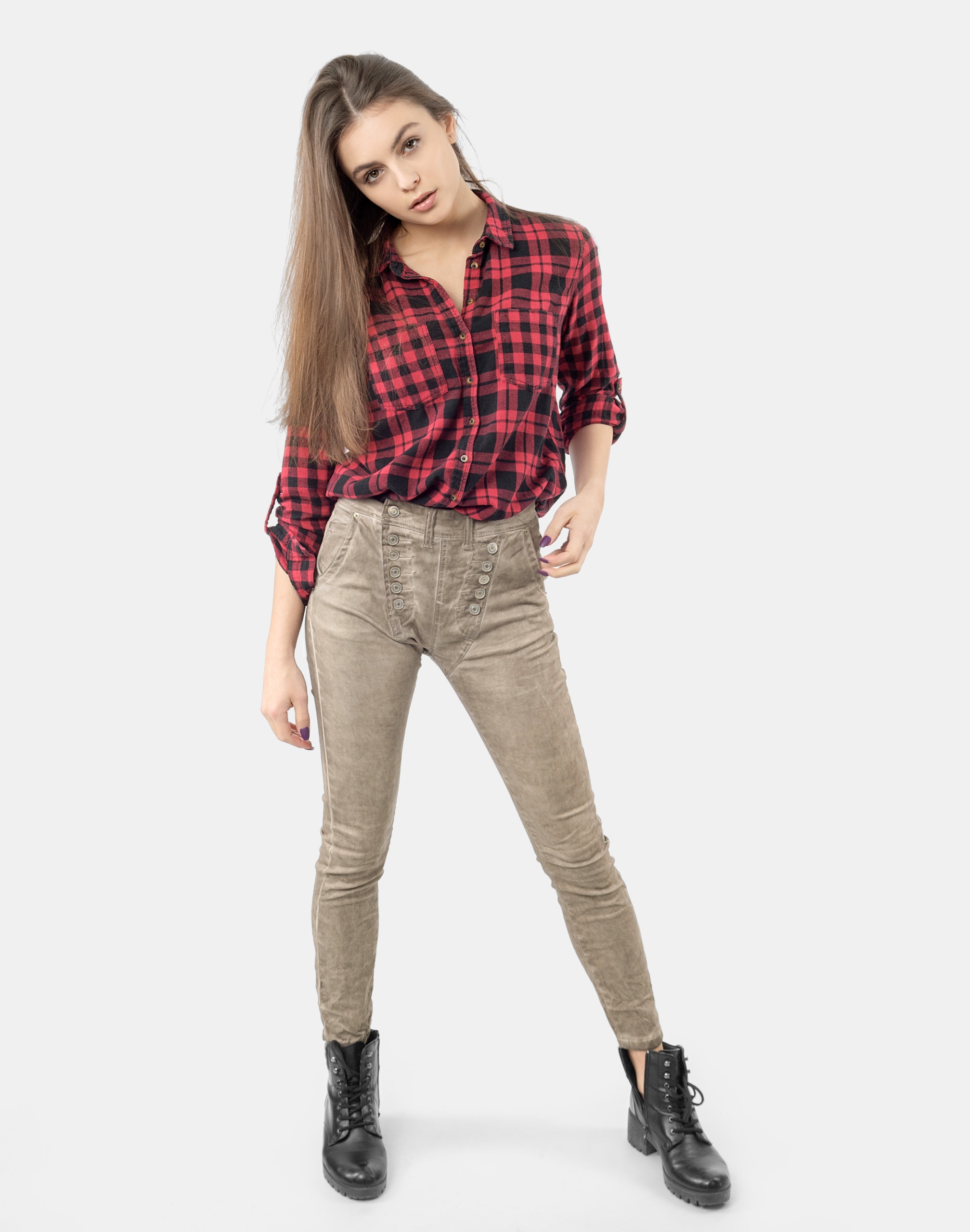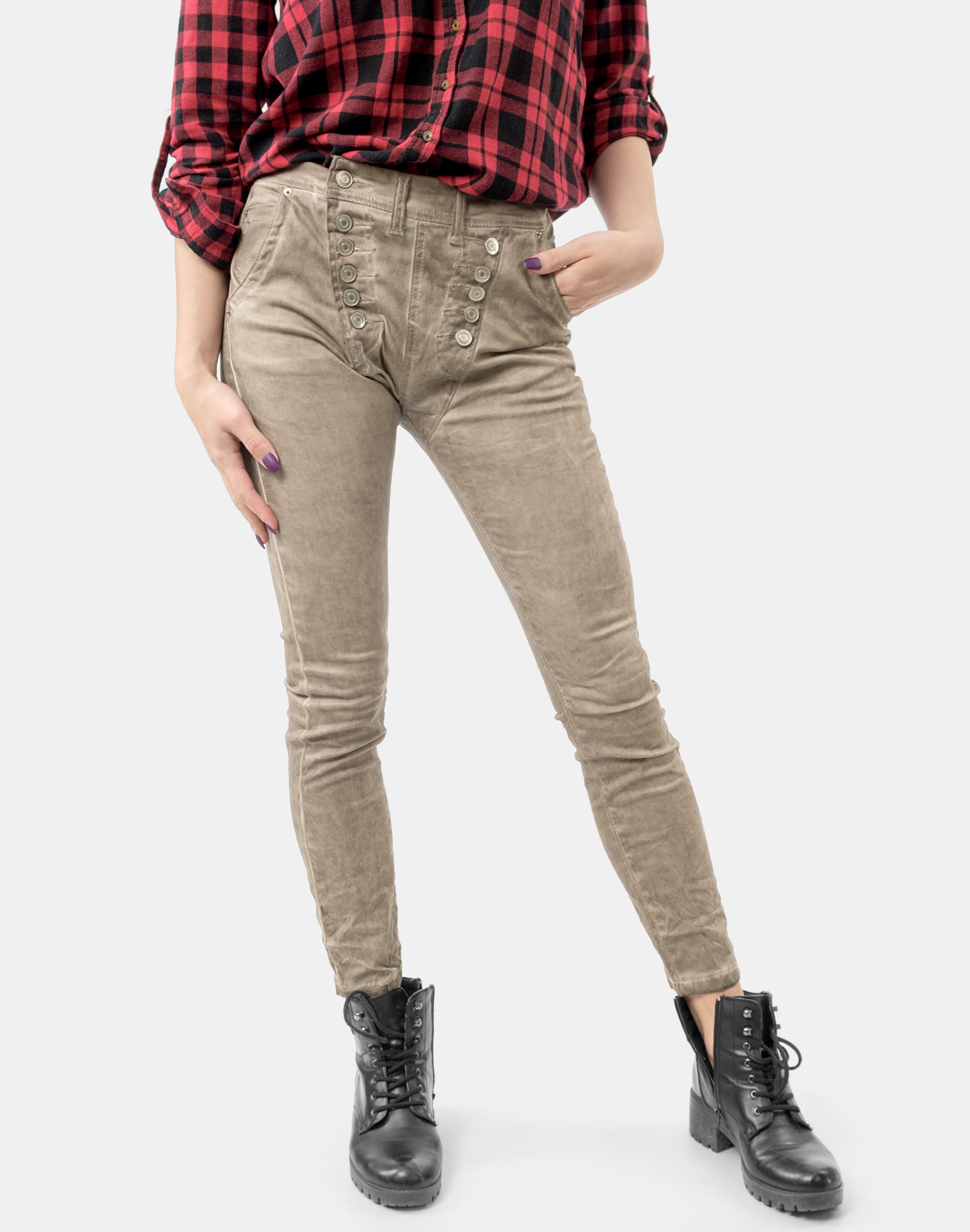 Uszyte z wysokiej jakości tkaniny bawełnianej z domieszką lycry (elastan), która odznacza się wysoką elastycznością co gwarantuje że spodnie nie będą się deformować i odkształcać nawet po długim użytkowaniu. Świetnie przylegają do ciała i pozwalają na pełną swobodę ruchów, co daje komfort przy siadaniu i zapewnia ogromny komfort noszenia. Zapinane na rząd ozdobnych guzików w pasie mają szlufki umożliwiające stylizacje z paskiem. Z przodu dwie kieszonki zaokrąglone + bilonówka, z tyłu dwie kieszenie nakładane jak w typowych spodniach jeansowych. Charakterystyczne dla stylu Used-Look przetarcia i pomarszczenia mające na celu wywołanie modnego efektu znoszonych jeansów, optycznie wysmuklają, odwracając uwagę od ewentualnych niedoskonałości. Najbardziej podatne na uszkodzenia miejsca wzmocnione są dodatkowymi przeszyciami oraz nitami.