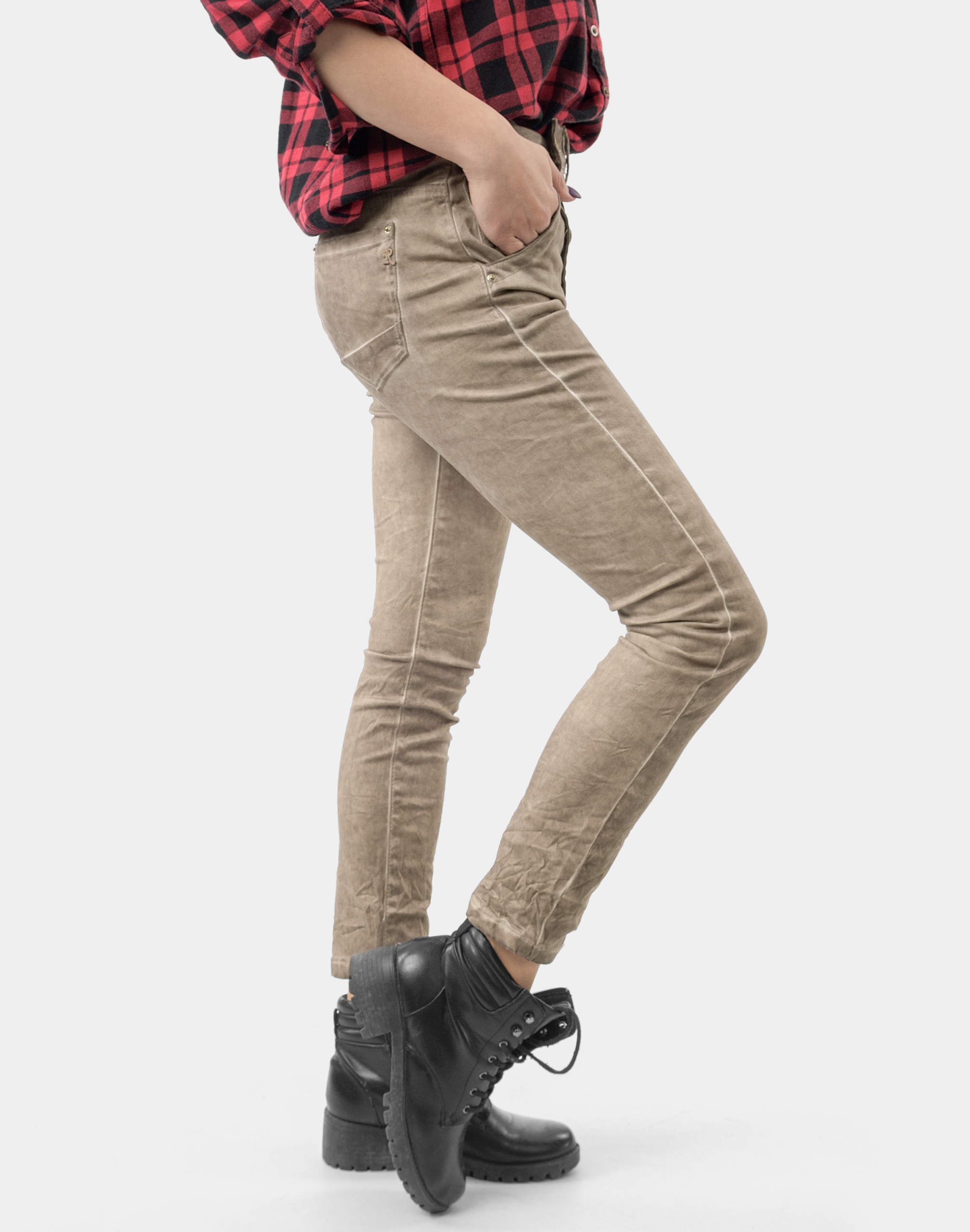Uszyte z wysokiej jakości tkaniny bawełnianej z domieszką lycry (elastan), która odznacza się wysoką elastycznością co gwarantuje że spodnie nie będą się deformować i odkształcać nawet po długim użytkowaniu. Świetnie przylegają do ciała i pozwalają na pełną swobodę ruchów, co daje komfort przy siadaniu i zapewnia ogromny komfort noszenia. Zapinane na rząd ozdobnych guzików w pasie mają szlufki umożliwiające stylizacje z paskiem. Z przodu dwie kieszonki zaokrąglone + bilonówka, z tyłu dwie kieszenie nakładane jak w typowych spodniach jeansowych. Charakterystyczne dla stylu Used-Look przetarcia i pomarszczenia mające na celu wywołanie modnego efektu znoszonych jeansów, optycznie wysmuklają, odwracając uwagę od ewentualnych niedoskonałości. Najbardziej podatne na uszkodzenia miejsca wzmocnione są dodatkowymi przeszyciami oraz nitami.