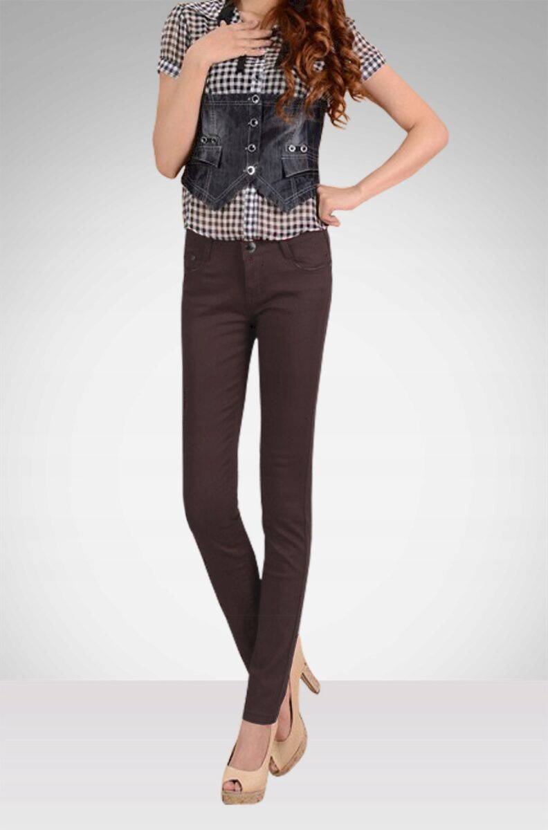 Spodnie damskie bawełniane z podwyższonym stanem i klasyczną lekko zwężaną nogawką to jeden z najczęściej wybieranych modeli spodni. Wykonane z wysokiej jakości tkaniny bawełnianej o jednolitym wybarwieniu z dodatkiem lycry (elastan). Niewielki dodatek lycry sprawia że spodnie są bardziej elastyczne i doskonale dopasowują się do każdej sylwetki. Pozwalają na pełną swobodę ruchów co daje użytkownikowi wygodę przy siadaniu i zapewnia ogromny komfort noszenia. Zapinane są na kryty zamek błyskawiczny i metalowy guzik sygnowany logiem firmy. Z przodu mają dwie kieszonki zaokrąglone oraz mniejszą kieszonkę tzw. bilonówkę, a na tyle klasyczne kieszenie naszywane jak w typowych spodniach jeansowych. W pasie szlufki umożliwiające stylizacje z paskiem. Najbardziej podatne na uszkodzenia miejsca wzmocnione są dodatkowymi przeszyciami i ozdobnymi metalowymi nitami.