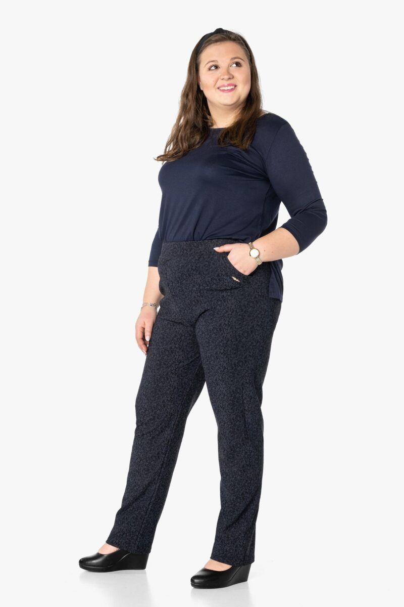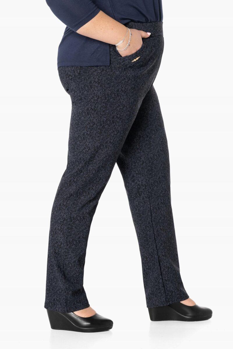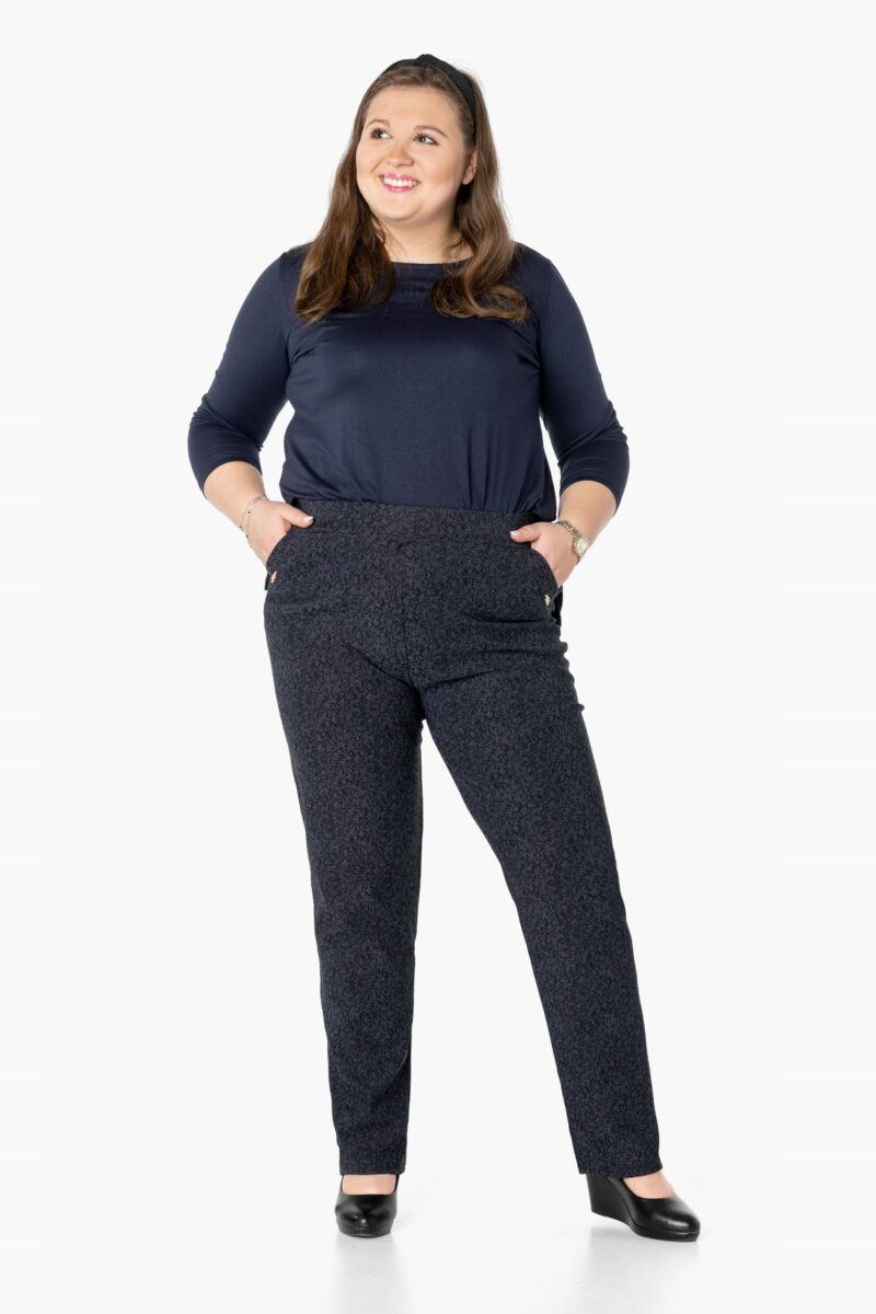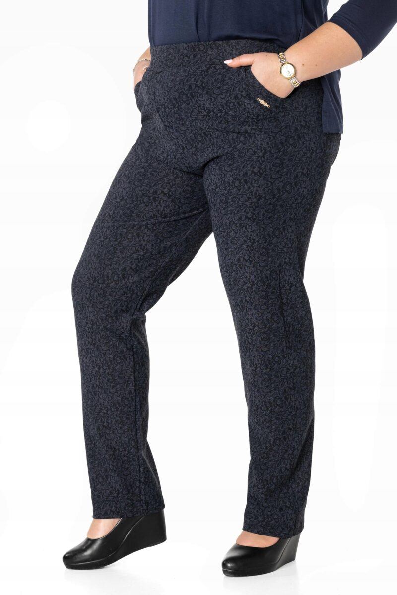 Spodnie model W202 to klasyczne bardzo szykowne cygaretki damskie w stylu Glamour o wyszczuplającym optycznie kobiecą sylwetkę fasonie i wyższym stanie. Na bokach mają dwie wpuszczane kieszenie na dłonie a z tyłu dwie kieszenie naszywane. Dopasowanie w pasie zapewnia szeroki, elastyczny pas wyszczuplający, który zgrabnie modeluje sylwetkę w talii. Jak w typowych cygaretkach nogawka zwężana co sprawia że sylwetka wygląda w nich lekko i zgrabnie. Trwałe i elastyczne wykończenie spodni (użycie do produkcji elastycznych nici) gwarantuje komfort i wygodę ich użytkownikowi w każdych warunkach, a dzianina jest na tyle gruba że nie widać przez nią bielizny. Pozwalają na pełną swobodę ruchów, co daje komfort przy siadaniu i zapewnia ogromny komfort noszenia. Uniwersalny, zawsze modny krój typu cygaretki z lekko zwężoną nogawką i wyższym stanem założysz na wiele różnych okazji. Skutecznie maskują pełną figurę i podkreślają kobiece kształty.