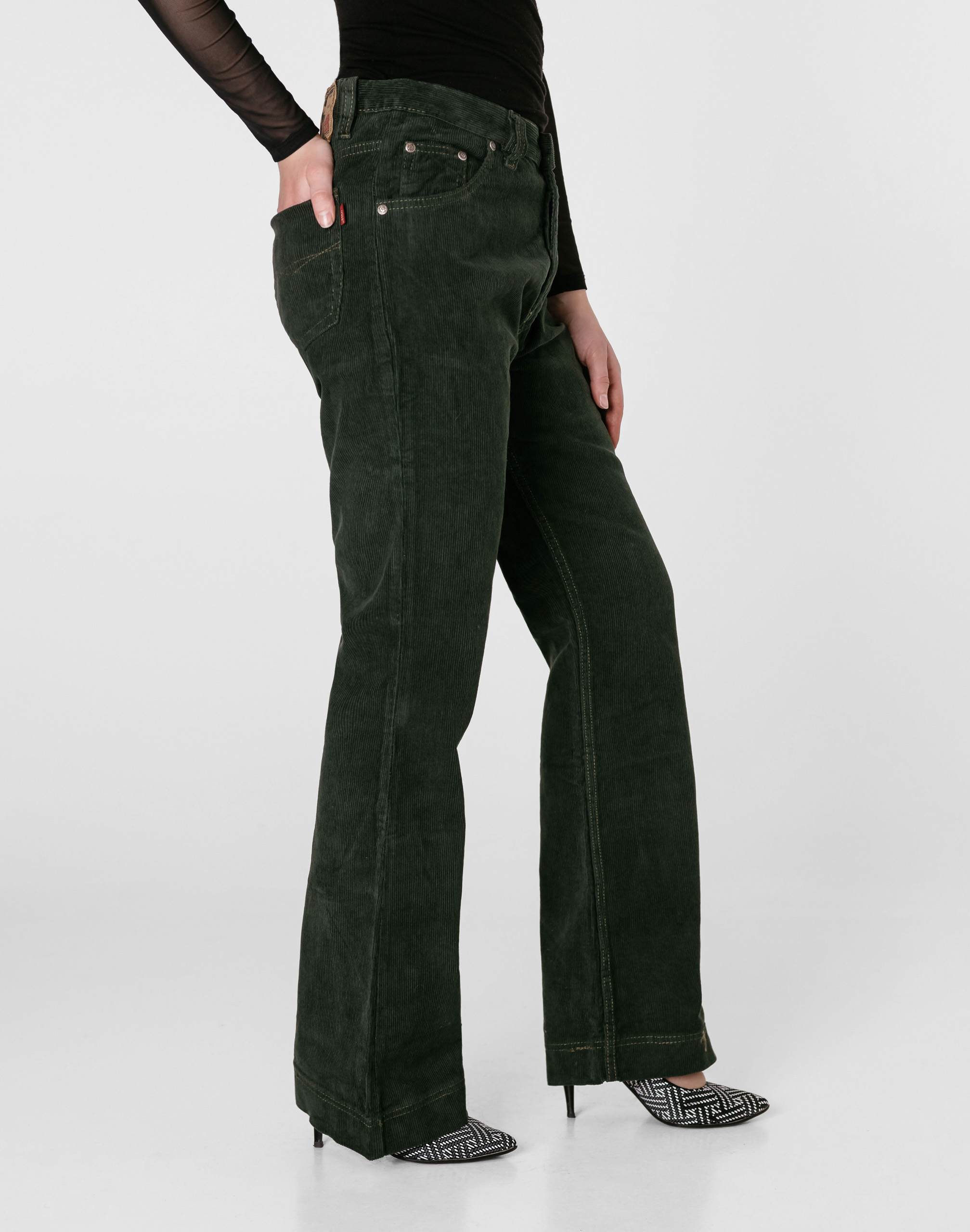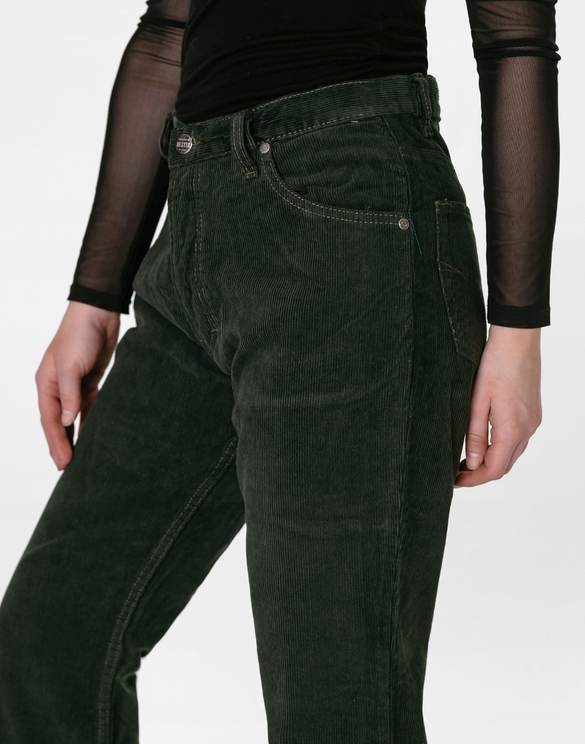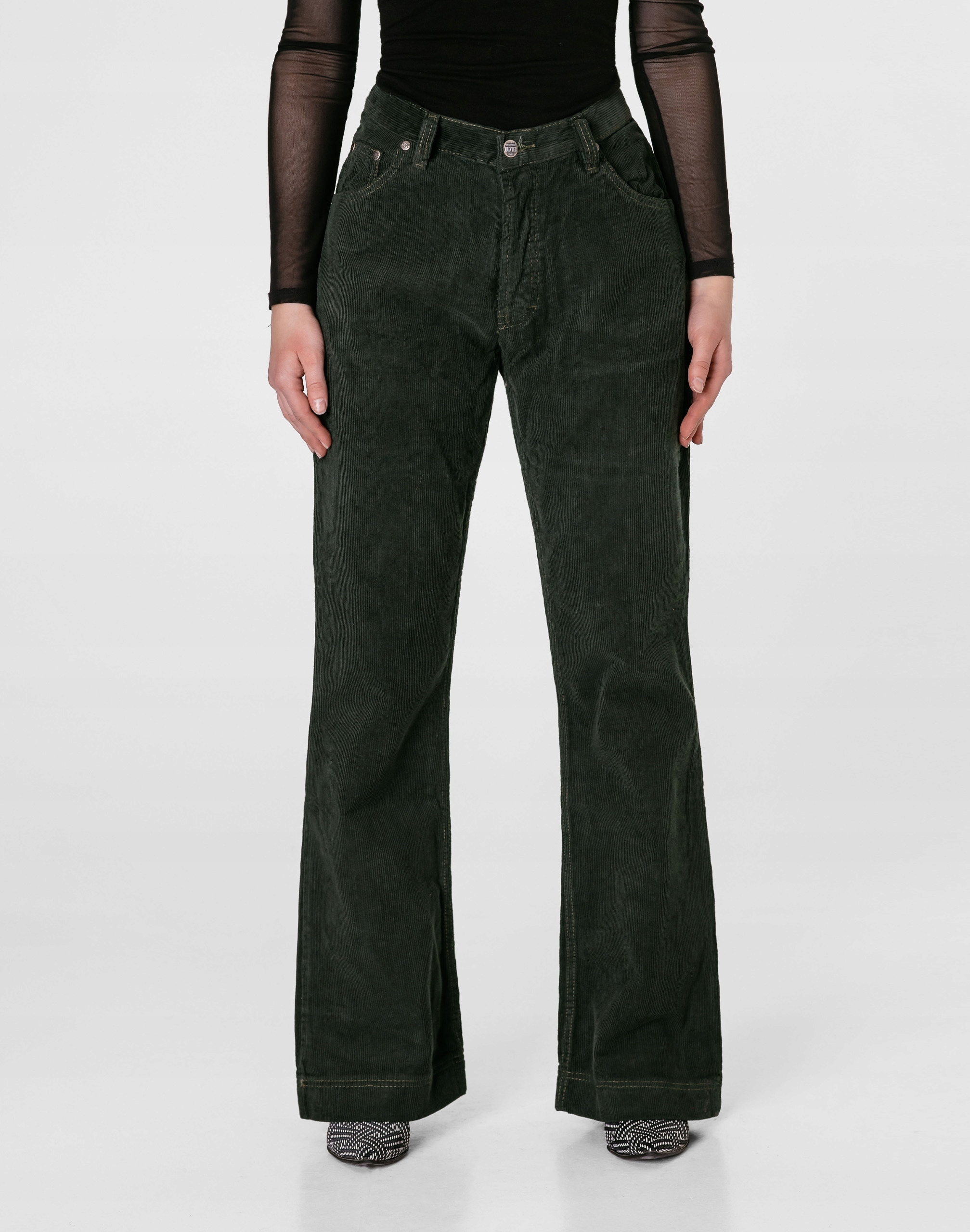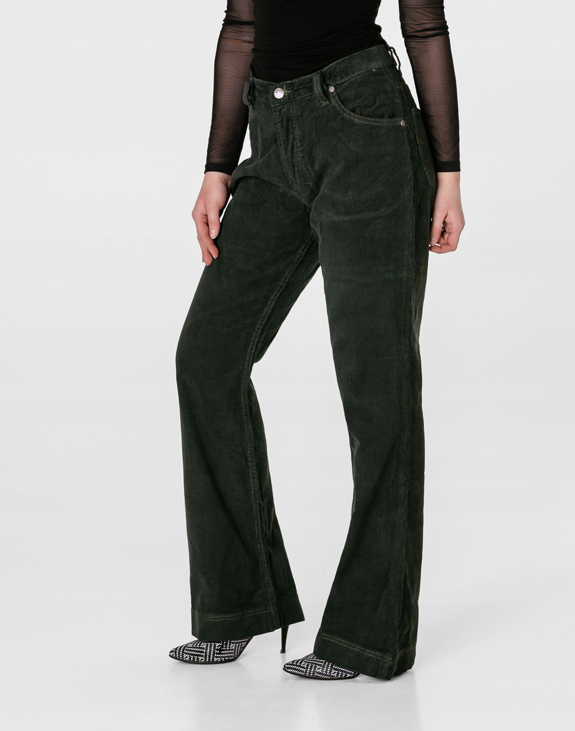 Mają krój dopasowany w biodrach oraz na wysokości ud i zapinane są na kryty zamek błyskawiczny oraz metalowy guzik sygnowany logiem firmy. Z przodu dwie kieszonki naszywane oraz mniejszą kieszonkę tzw. bilonówkę, z tyłu dwie naszywane kieszenie jak w typowych spodniach jeansowych. W pasie szlufki umożliwiające stylizacje z paskiem. Spodnie z rozszerzanymi nogawkami idealnie równoważą proporcje sylwetki i dzięki nieco ekstrawaganckiemu charakterowi sprawią, że nawet minimalistyczna stylizacja będzie prezentować się nietuzinkowo. Zaprezentują Cię jako osobę, która lubi czuć się wygodnie i która uwielbia najnowsze trendy aby bawić się własnym stylem w modzie.