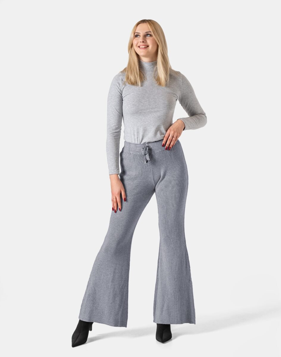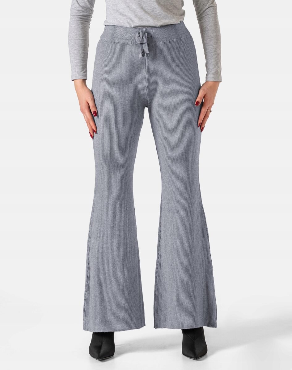 Jak w typowych dzwonach krój dopasowany w biodrach oraz w udach z rozszerzającymi się od kolan nogawkami, a w pasie szeroki elastyczny pas ściągający z taśmą regulacyjną do zawiązania zgrabnie modelujący sylwetkę w talii. Wyprodukowane z wysokiej jakości ciepłej dzianiny będącej mieszanką kaszmiru, wiskozy, poliestru i elastanu zapewniającej maksymalną wygodę i komfort użytkowania, a także wyróżniający się zmysłową kobiecością, fenomenalnie podkreślając atuty kobiecej sylwetki. Miękka i elastyczna dzianina idealnie dopasowuje się do kobiecej figury zapewniając atrakcyjny wygląd i uwydatniając same jej zalety. Spodnie z rozszerzanymi nogawkami idealnie równoważą proporcje sylwetki i dzięki nieco ekstrawaganckiemu charakterowi sprawią, że nawet minimalistyczna stylizacja będzie prezentować się nietuzinkowo. Zaprezentują Cię jako osobę, która lubi czuć się wygodnie i która uwielbia najnowsze trendy aby bawić się własnym stylem w modzie.