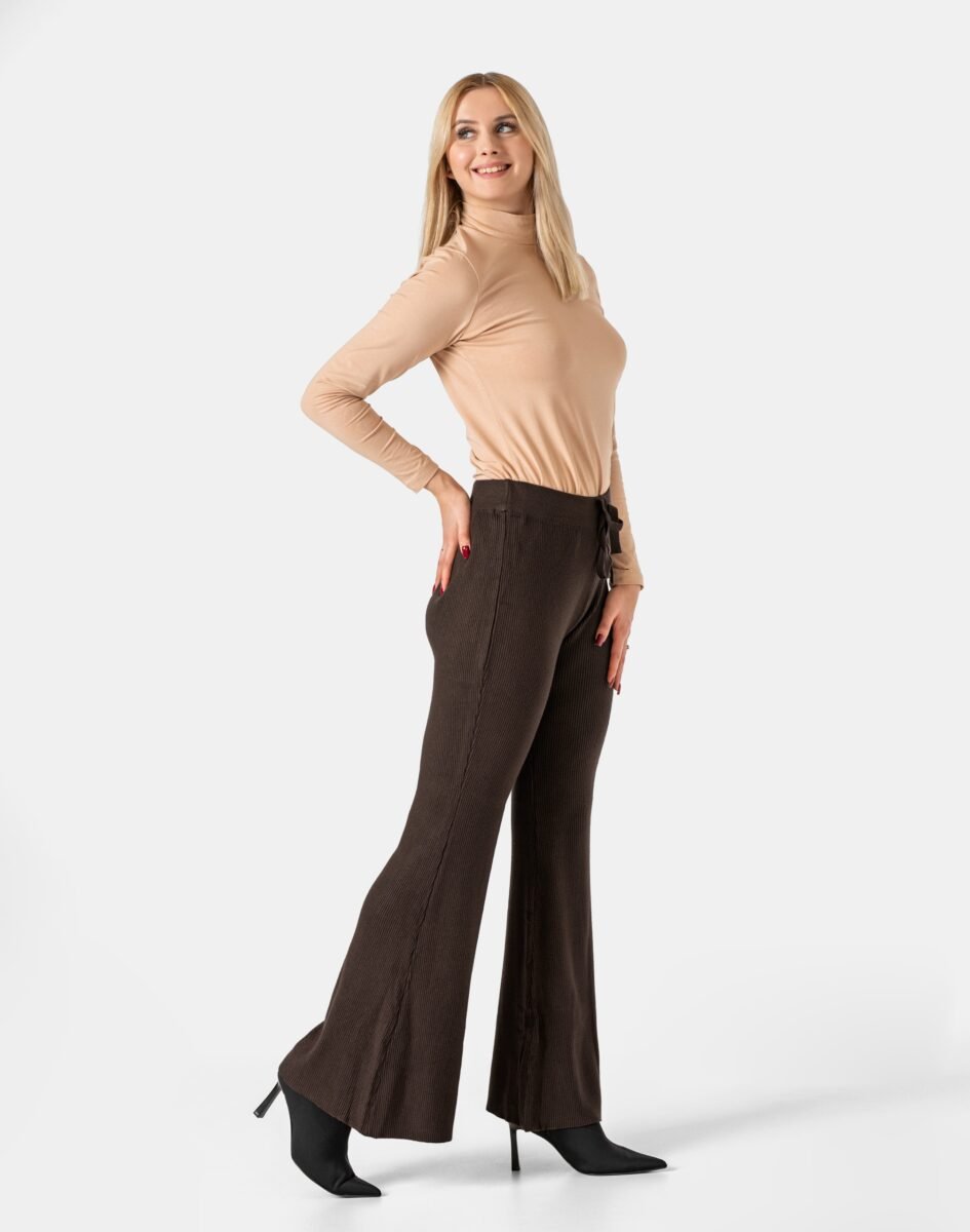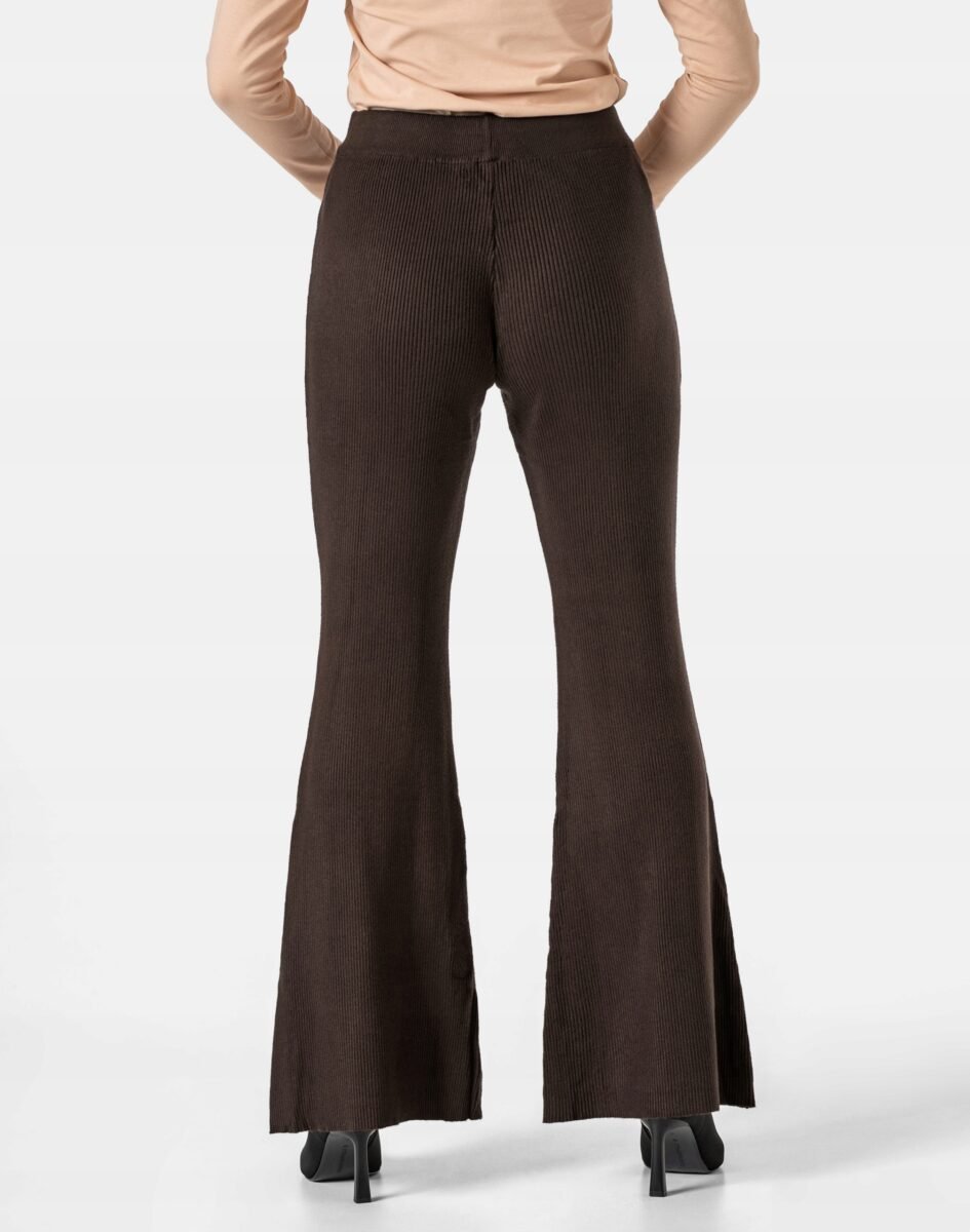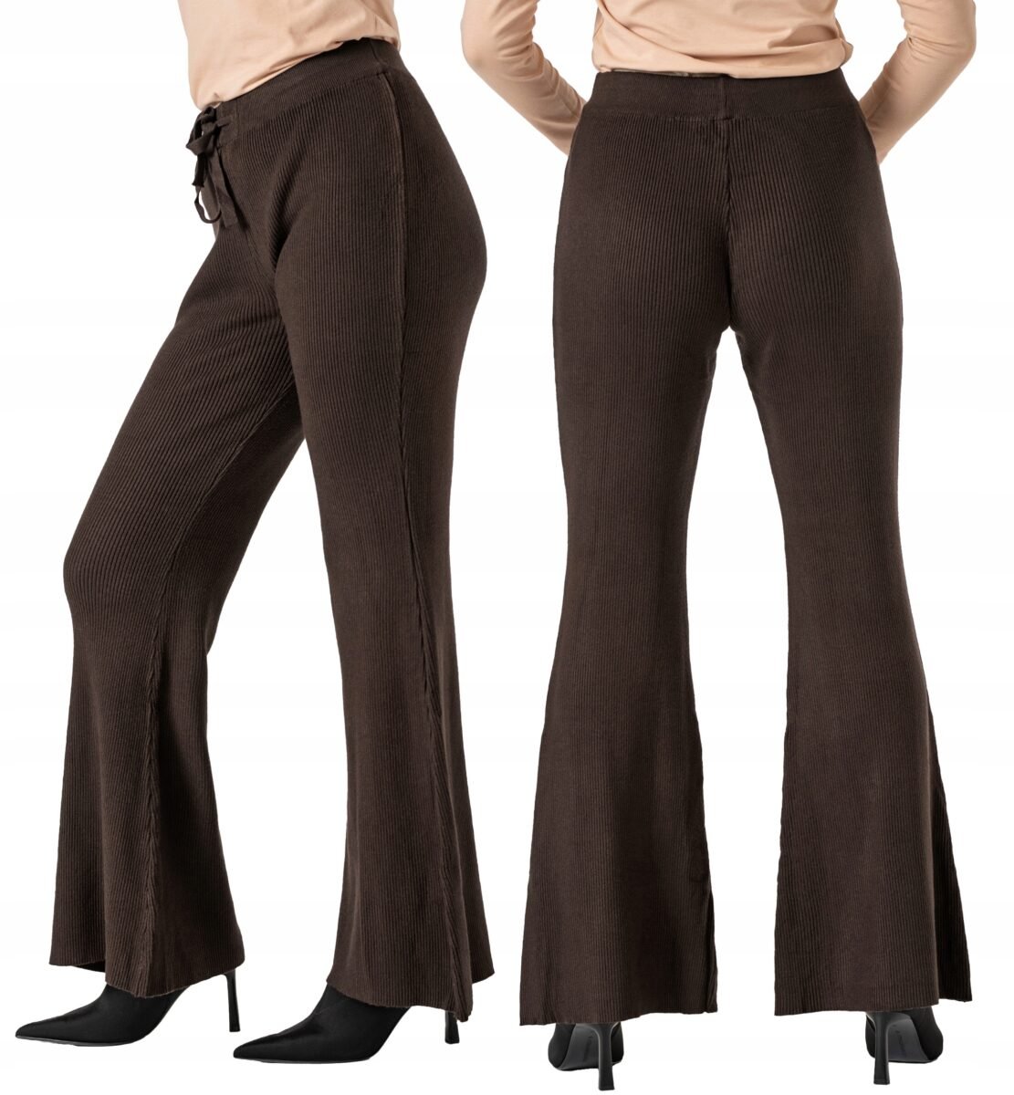 Jak w typowych dzwonach krój dopasowany w biodrach oraz w udach z rozszerzającymi się od kolan nogawkami, a w pasie szeroki elastyczny pas ściągający z taśmą regulacyjną do zawiązania zgrabnie modelujący sylwetkę w talii. Wyprodukowane z wysokiej jakości ciepłej dzianiny będącej mieszanką kaszmiru, wiskozy, poliestru i elastanu zapewniającej maksymalną wygodę i komfort użytkowania, a także wyróżniający się zmysłową kobiecością, fenomenalnie podkreślając atuty kobiecej sylwetki. Miękka i elastyczna dzianina idealnie dopasowuje się do kobiecej figury zapewniając atrakcyjny wygląd i uwydatniając same jej zalety. Spodnie z rozszerzanymi nogawkami idealnie równoważą proporcje sylwetki i dzięki nieco ekstrawaganckiemu charakterowi sprawią, że nawet minimalistyczna stylizacja będzie prezentować się nietuzinkowo. Zaprezentują Cię jako osobę, która lubi czuć się wygodnie i która uwielbia najnowsze trendy aby bawić się własnym stylem w modzie.