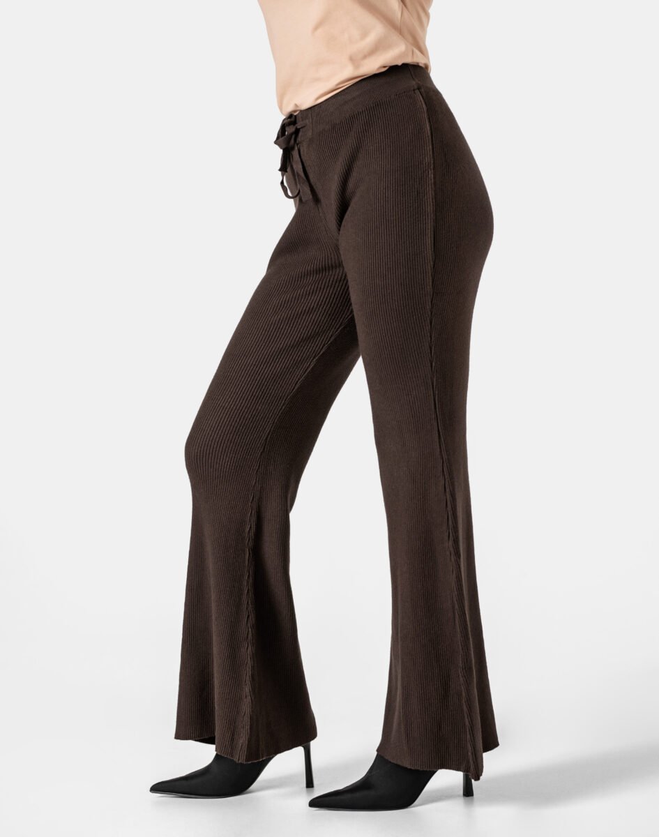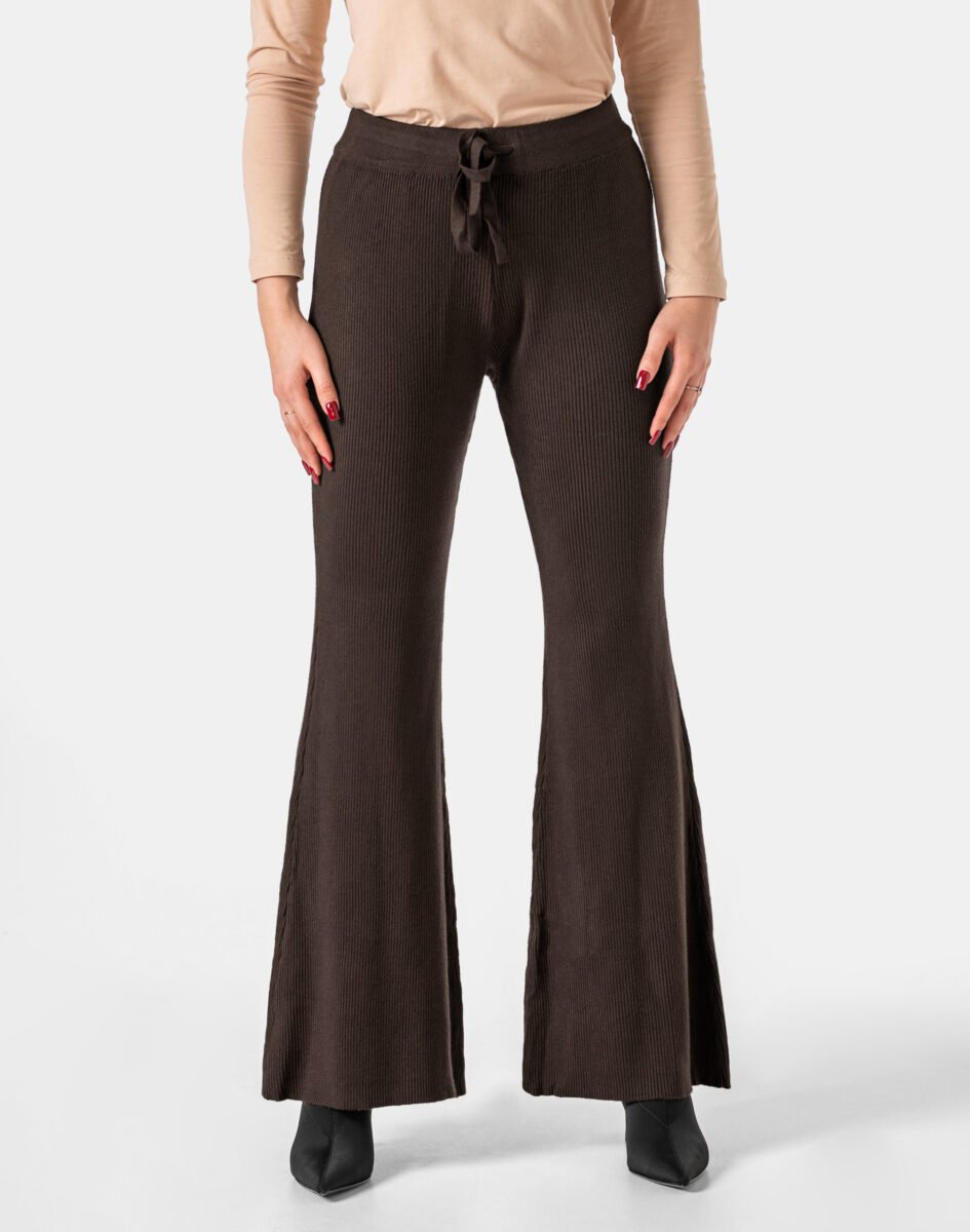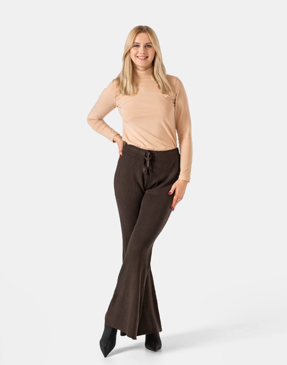Jak w typowych dzwonach krój dopasowany w biodrach oraz w udach z rozszerzającymi się od kolan nogawkami, a w pasie szeroki elastyczny pas ściągający z taśmą regulacyjną do zawiązania zgrabnie modelujący sylwetkę w talii. Wyprodukowane z wysokiej jakości ciepłej dzianiny będącej mieszanką kaszmiru, wiskozy, poliestru i elastanu zapewniającej maksymalną wygodę i komfort użytkowania, a także wyróżniający się zmysłową kobiecością, fenomenalnie podkreślając atuty kobiecej sylwetki. Miękka i elastyczna dzianina idealnie dopasowuje się do kobiecej figury zapewniając atrakcyjny wygląd i uwydatniając same jej zalety. Spodnie z rozszerzanymi nogawkami idealnie równoważą proporcje sylwetki i dzięki nieco ekstrawaganckiemu charakterowi sprawią, że nawet minimalistyczna stylizacja będzie prezentować się nietuzinkowo. Zaprezentują Cię jako osobę, która lubi czuć się wygodnie i która uwielbia najnowsze trendy aby bawić się własnym stylem w modzie.