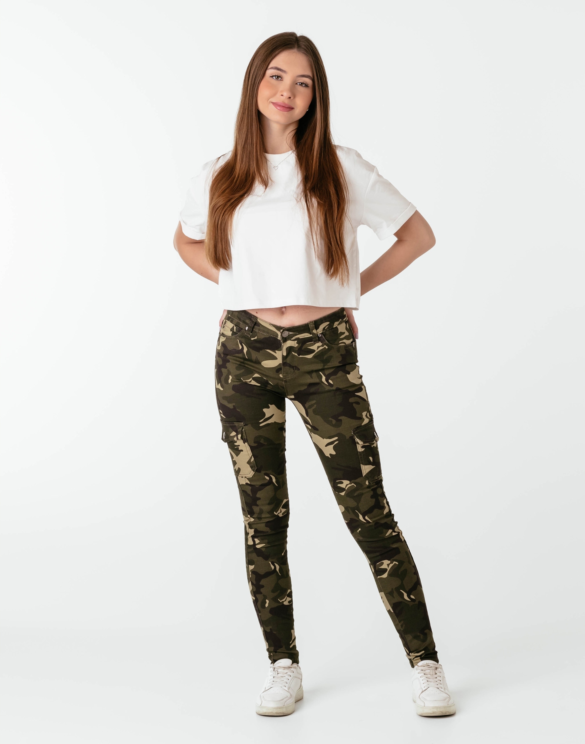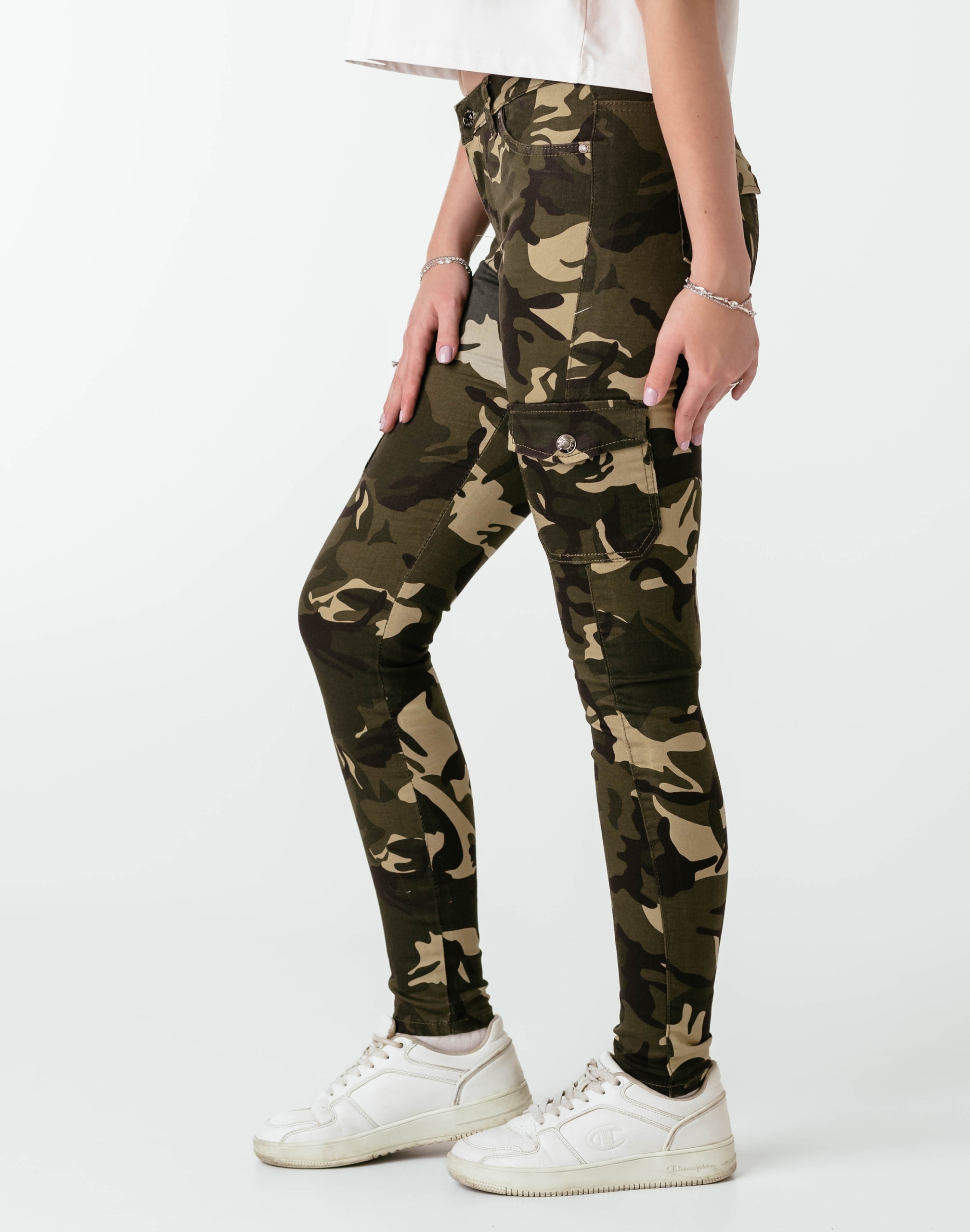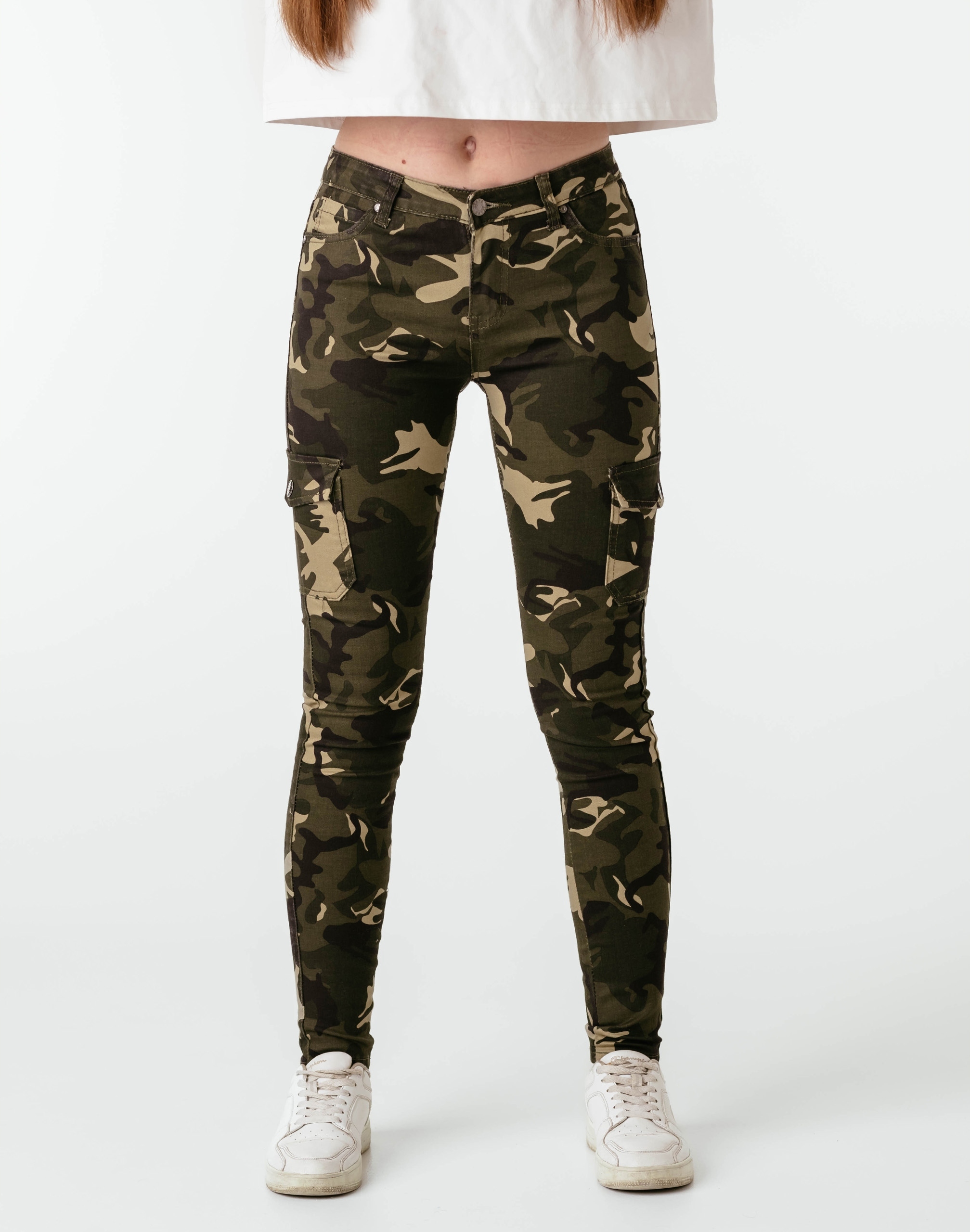 Spodnie damskie model DJ148 to klasyczne, bardzo szykowne rurki z wąskimi nogawkami o wyszczuplającym optycznie kobiecą sylwetkę fasonie (Slim Fit) i średnim stanie (Medium Waist). Wykonane z wysokiej jakości, trwałej i mocnej, sprężystej tkaniny bawełnianej średniej grubości z domieszką lycry (elastan), która odznacza się wysoką elastycznością, co gwarantuje, że spodnie nie będą się deformować i odkształcać nawet po długim użytkowaniu. Niewielki dodatek elastanu (lycra) sprawia, że spodnie są bardziej elastyczne, ładnie dopasowują się do sylwetki i są bardzo komfortowe w użytkowaniu. Łatwo się je zakłada i są znacznie wygodniejsze od spodni, które lycry nie mają. Poza tym bawełna ma tendencję do kurczenia się w praniu, dlatego lycra sprawia, że spodnie są wyjątkowo praktyczne i można je bez problemu założyć po wysuszeniu. Pozwalają na pełną swobodę ruchów, co daje wygodę przy siadaniu i zapewnia ogromny komfort noszenia.Prawdziwym hitem w kobiecych kolekcjach w stylu militarnym jest najmodniejszy w tym sezonie wzór militarny "Moro Camo".