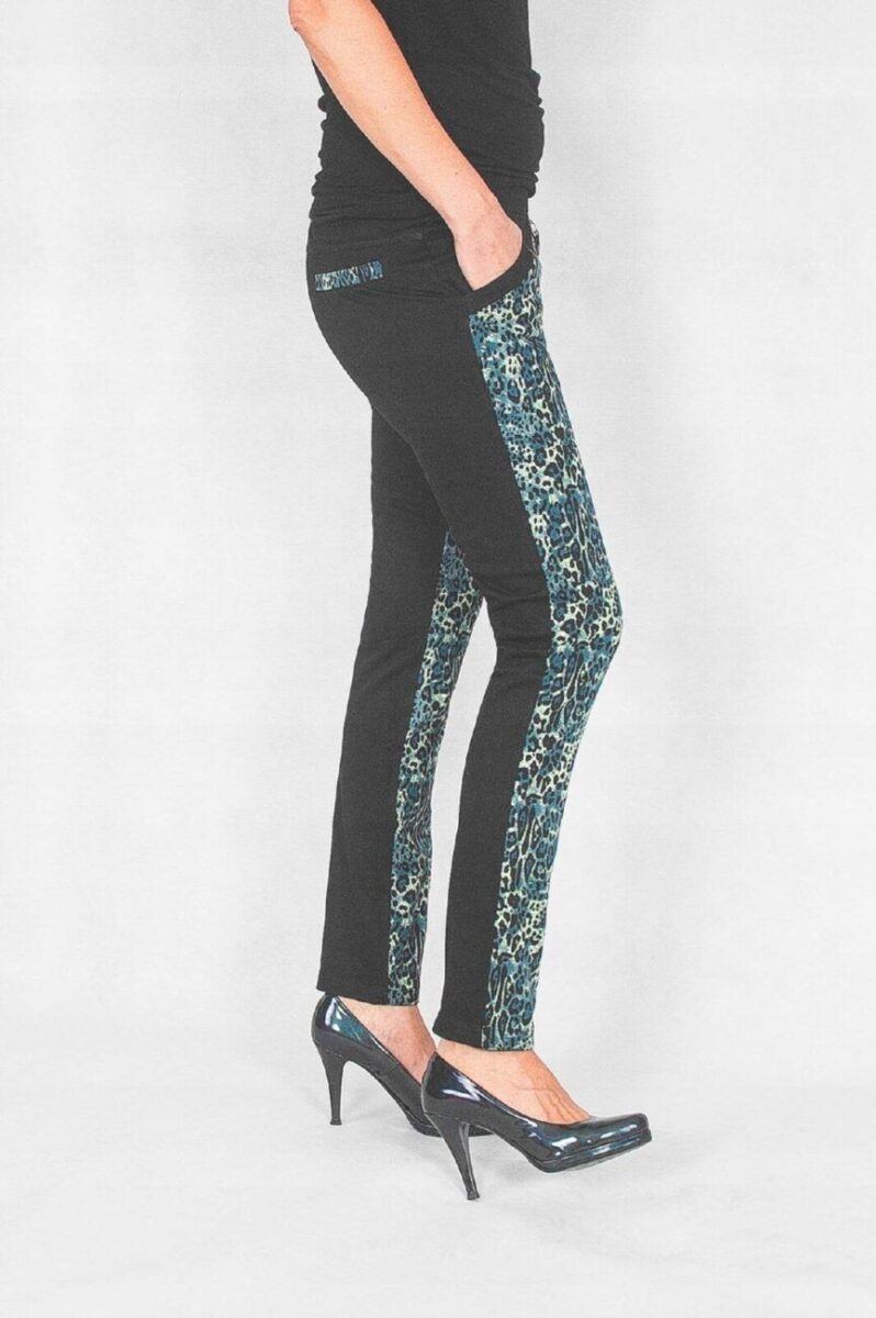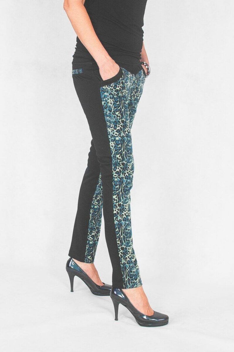 Modne i niezwykle oryginalne spodnie damskie z wyższym stanem ozdobione z przodu efektownym nadrukiem 3D w panterkę, który w tym sezonie opanował spodnie, koszule, bluzki i kurtki. Zgrabnie modelują sylwetkę w tali, wygodne jak legginsy, nie mają żadnego zamka, guzików ani niewygodnych szwów, a tkanina jest mocna i gęsta jak w typowych spodniach jeansowych. Dopasowanie w pasie zapewnia szeroki, specjalnie wzmocniony, elastyczny pas ściągający dzięki, któremu brzuch wydaje się bardziej płaski. Zapewniają poczucie atrakcyjności przy jednoczesnym zachowaniu wygody i pełnej swobody ruchów.