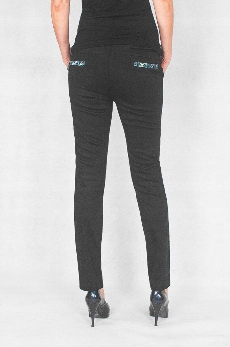 - Kieszenie: dwie wpuszczane kieszenie z przodu oraz ozdobna imitacja kieszeni wpuszczanych z tyłu spodni