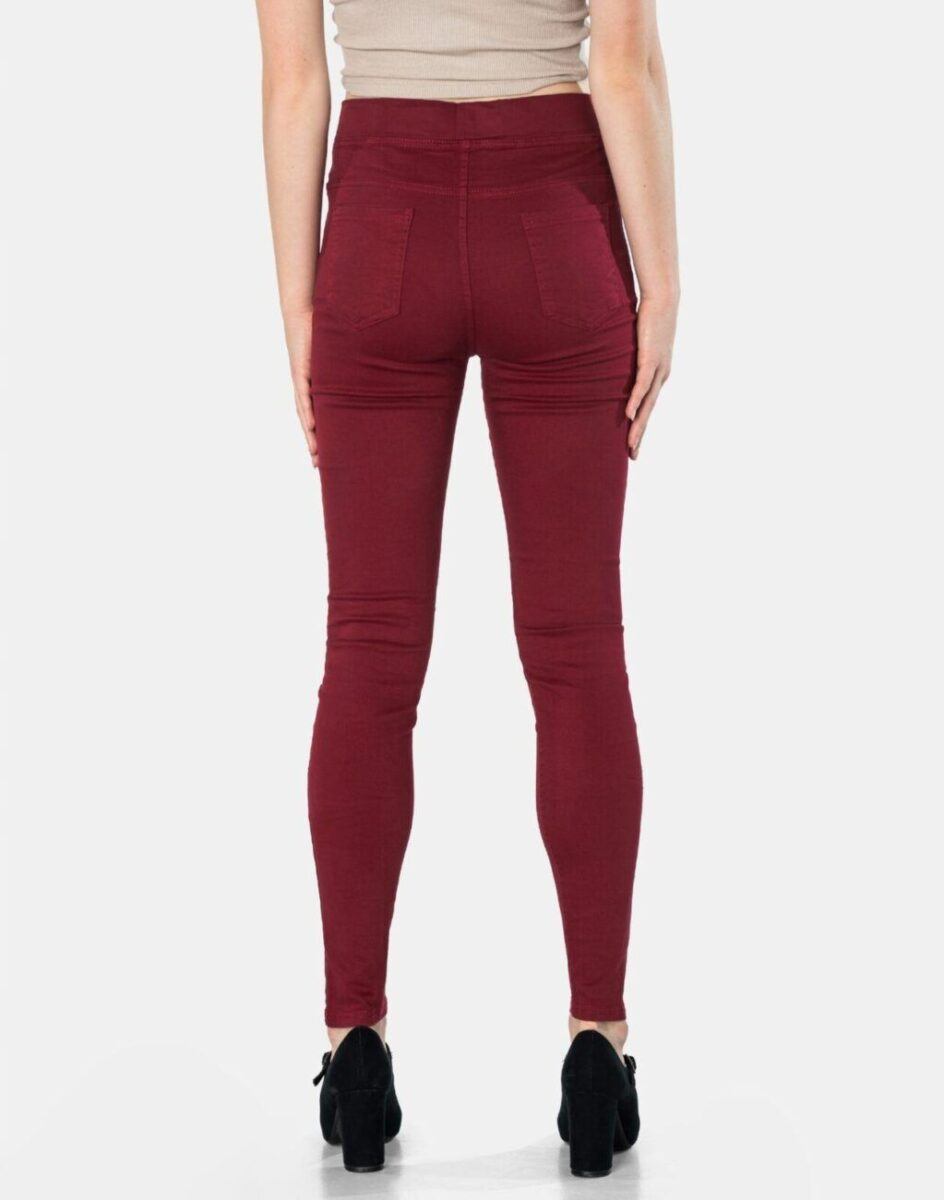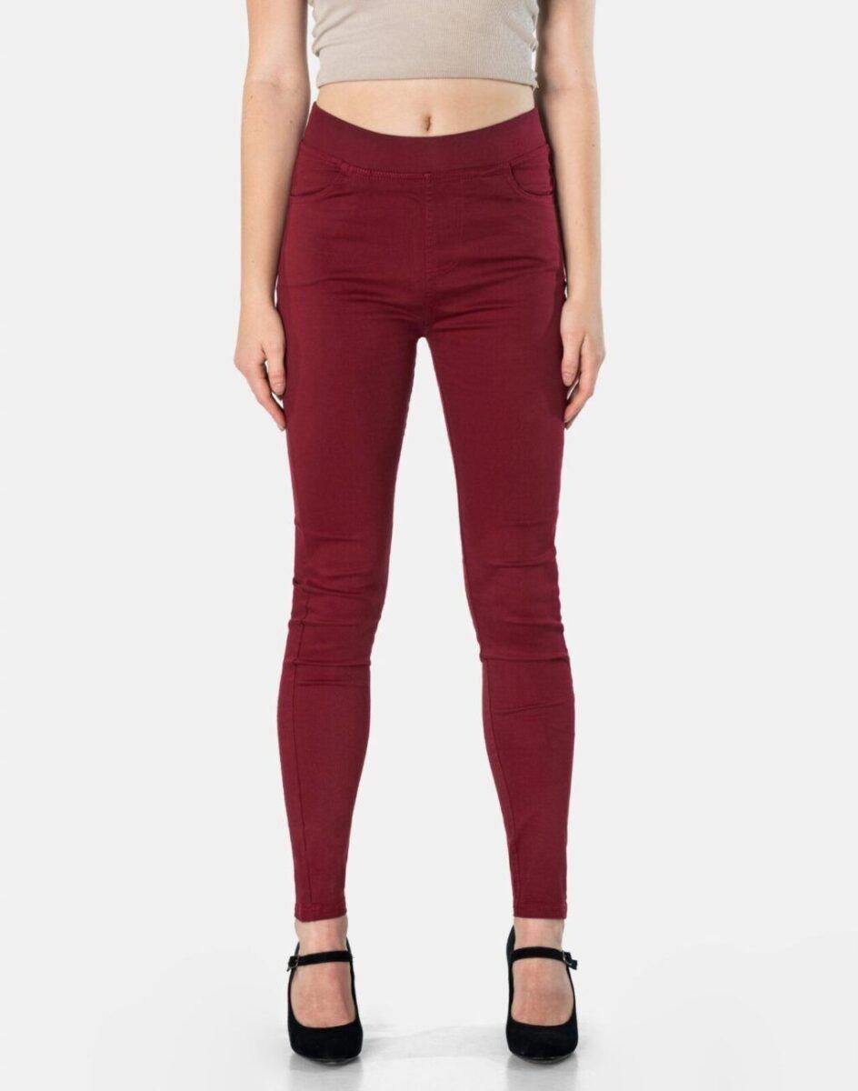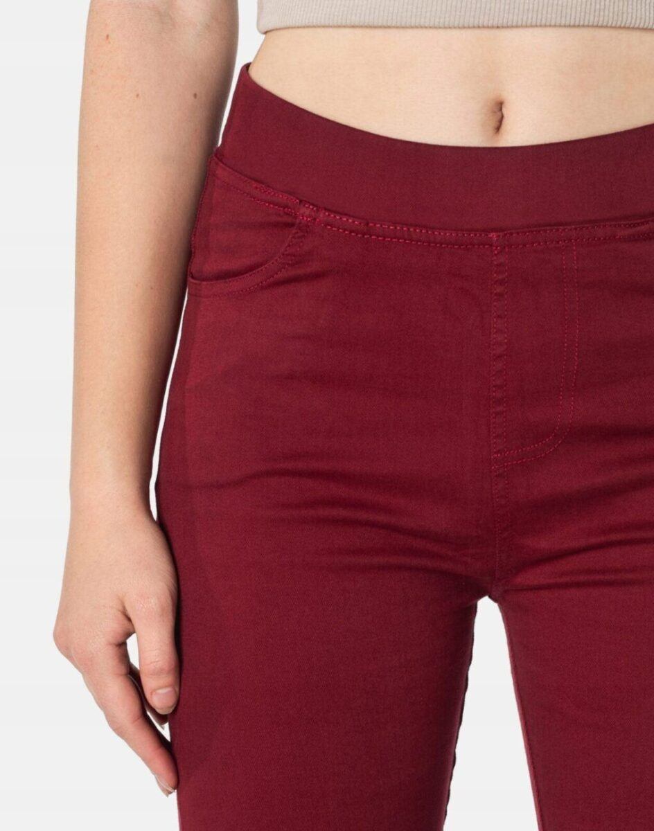 Spodnie damskie model 1920 Slim Fit to klasyczne, bardzo szykowne rurki w kolorze bordowym z wysokim stanem i wąskimi nogawkami, dzięki czemu sylwetka wygląda w nich lekko i zgrabnie. Optycznie wysmuklają, odwracając uwagę od ewentualnych niedoskonałości. Posiadają szeroki elastyczny pas ściągający sylwetkę w talii. Z przodu mają dwie kieszonki zaokrąglone a na tyle klasyczne kieszenie naszywane jak w typowych spodniach jeansowych. Najbardziej podatne na uszkodzenia miejsca wzmocnione są dodatkowymi przeszyciami.