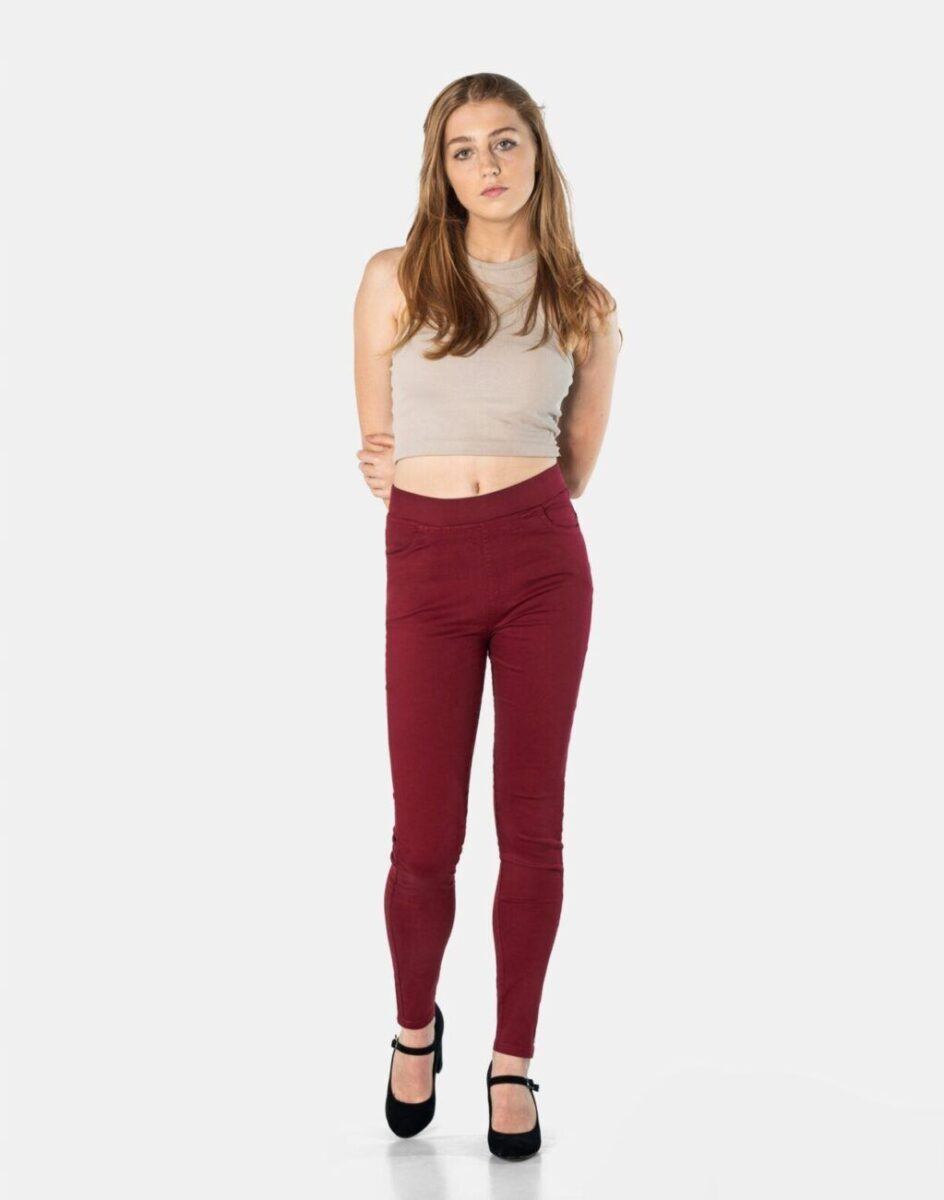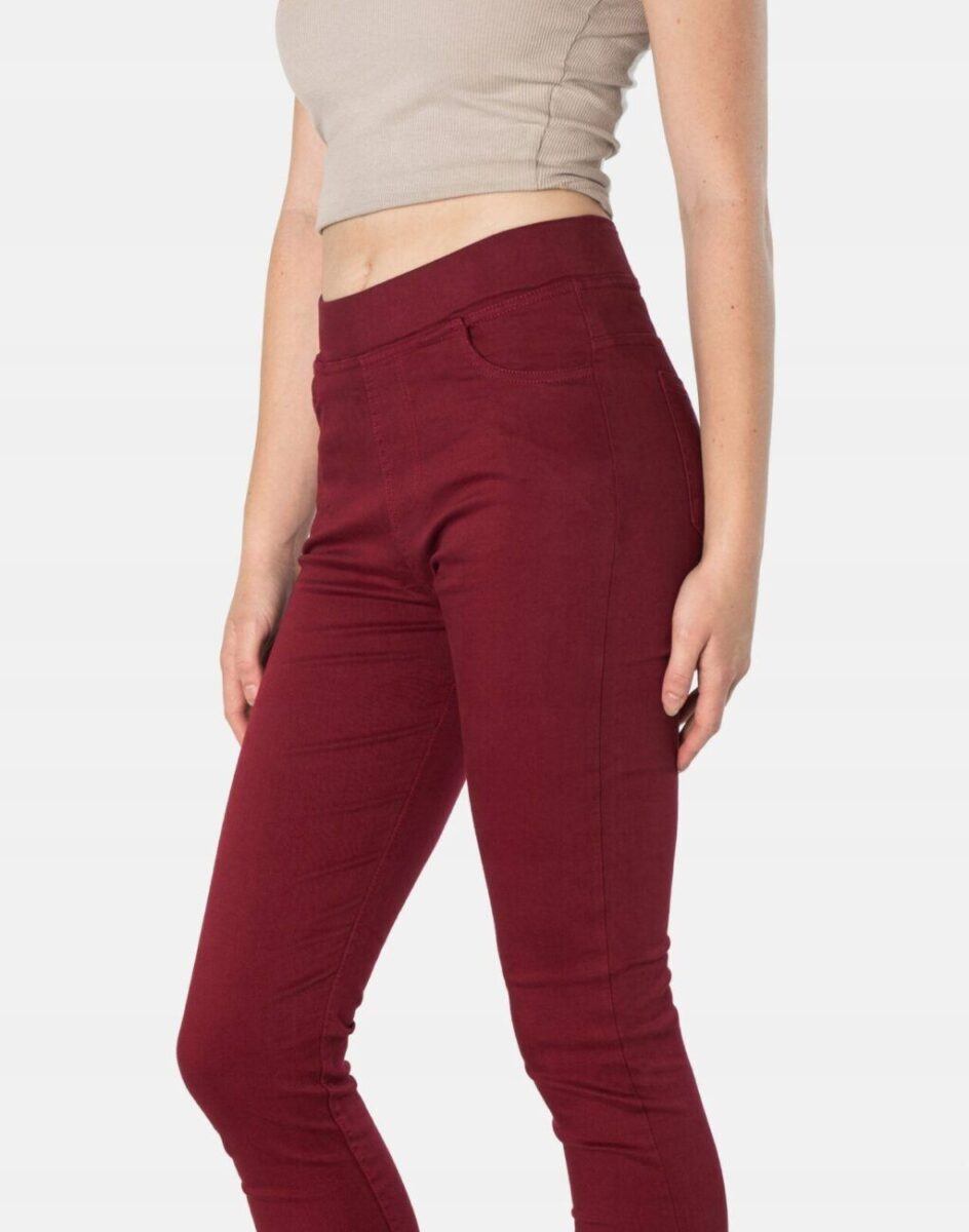 Spodnie damskie model 1920 Slim Fit to klasyczne, bardzo szykowne rurki w kolorze bordowym z wysokim stanem i wąskimi nogawkami, dzięki czemu sylwetka wygląda w nich lekko i zgrabnie. Optycznie wysmuklają, odwracając uwagę od ewentualnych niedoskonałości. Posiadają szeroki elastyczny pas ściągający sylwetkę w talii. Z przodu mają dwie kieszonki zaokrąglone a na tyle klasyczne kieszenie naszywane jak w typowych spodniach jeansowych. Najbardziej podatne na uszkodzenia miejsca wzmocnione są dodatkowymi przeszyciami.