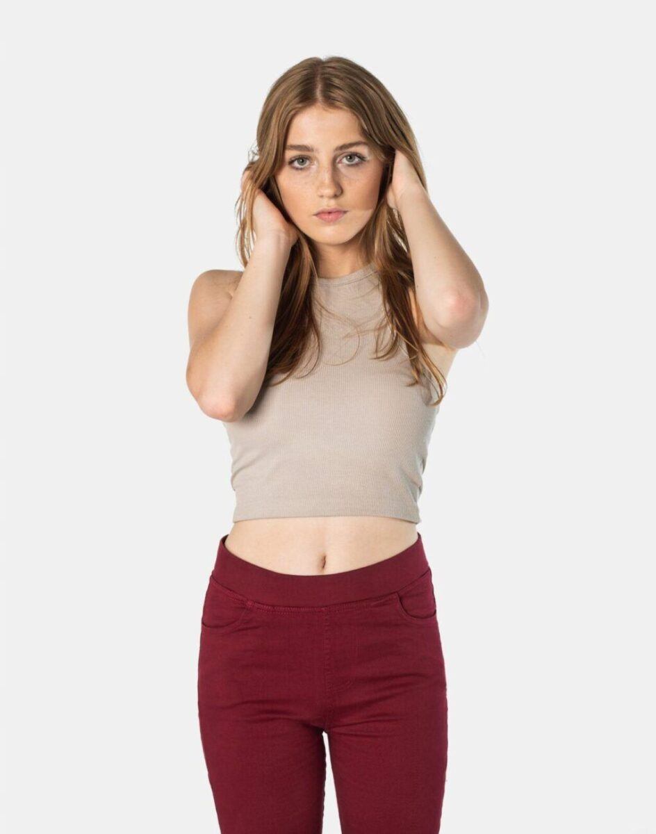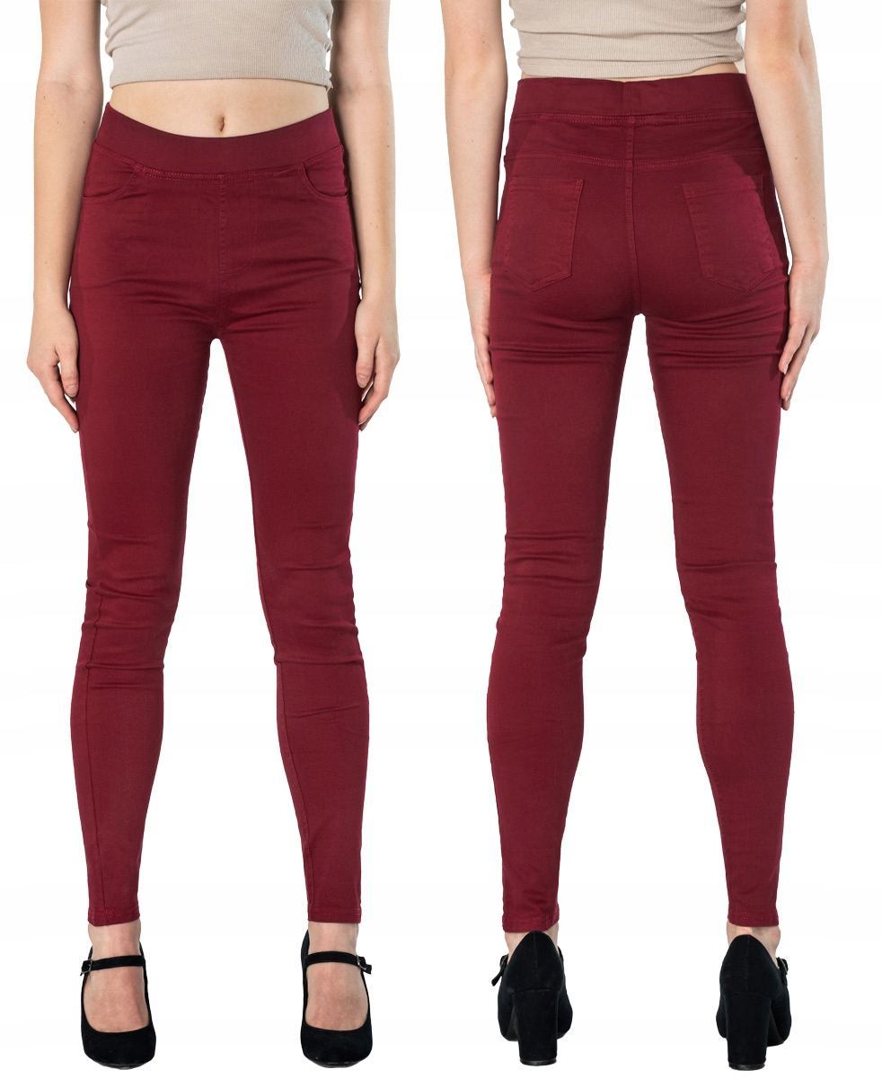 Spodnie damskie model 1920 Slim Fit to klasyczne, bardzo szykowne rurki w kolorze bordowym z wysokim stanem i wąskimi nogawkami, dzięki czemu sylwetka wygląda w nich lekko i zgrabnie. Optycznie wysmuklają, odwracając uwagę od ewentualnych niedoskonałości. Posiadają szeroki elastyczny pas ściągający sylwetkę w talii. Z przodu mają dwie kieszonki zaokrąglone a na tyle klasyczne kieszenie naszywane jak w typowych spodniach jeansowych. Najbardziej podatne na uszkodzenia miejsca wzmocnione są dodatkowymi przeszyciami.