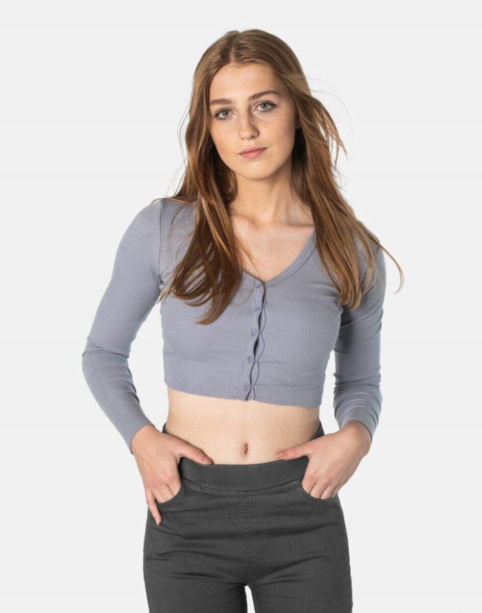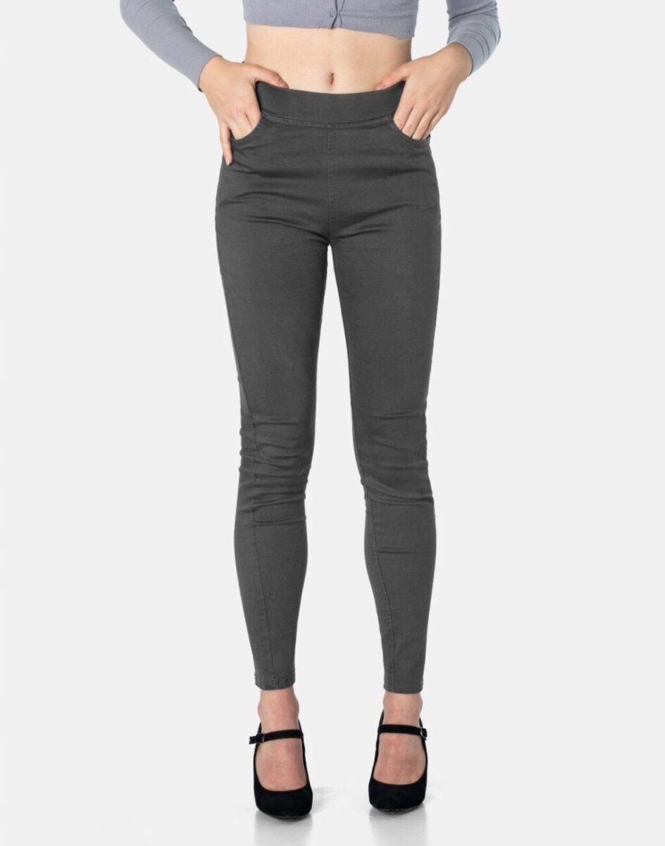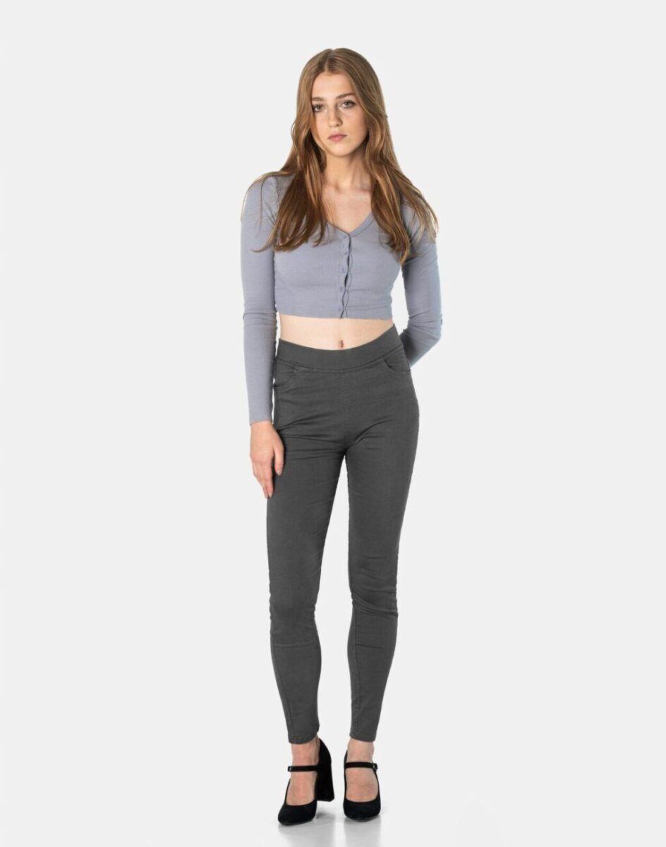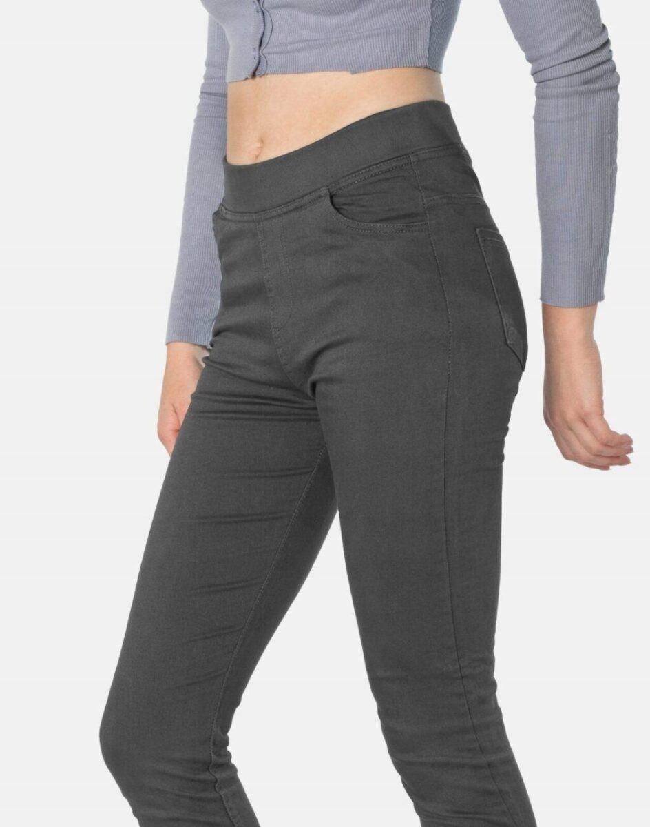 Spodnie damskie model 1920 Slim Fit to klasyczne, bardzo szykowne rurki w kolorze stalowym z wysokim stanem i wąskimi nogawkami, dzięki czemu sylwetka wygląda w nich lekko i zgrabnie. Optycznie wysmuklają, odwracając uwagę od ewentualnych niedoskonałości. Posiadają szeroki elastyczny pas ściągający sylwetkę w talii. Z przodu mają dwie kieszonki zaokrąglone a na tyle klasyczne kieszenie naszywane jak w typowych spodniach jeansowych. Najbardziej podatne na uszkodzenia miejsca wzmocnione są dodatkowymi przeszyciami.