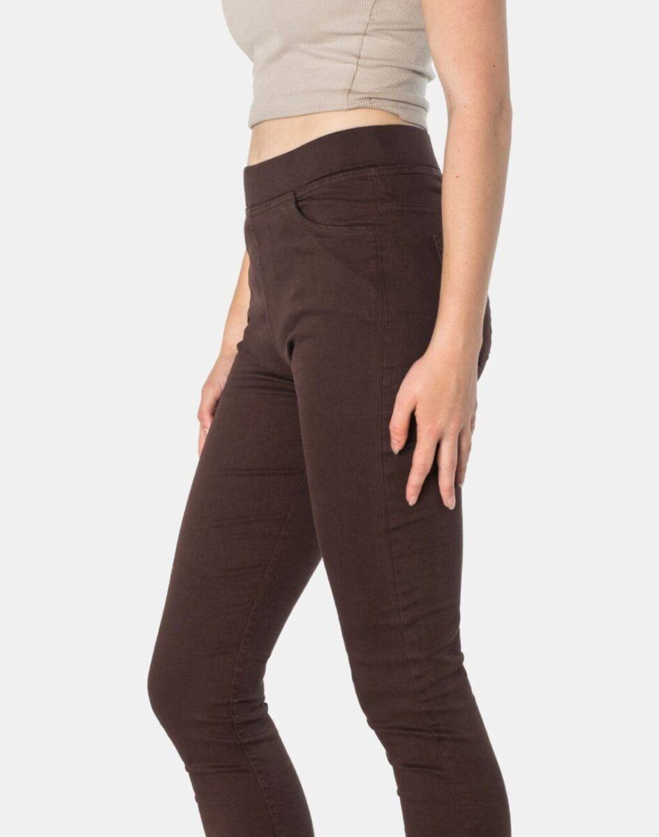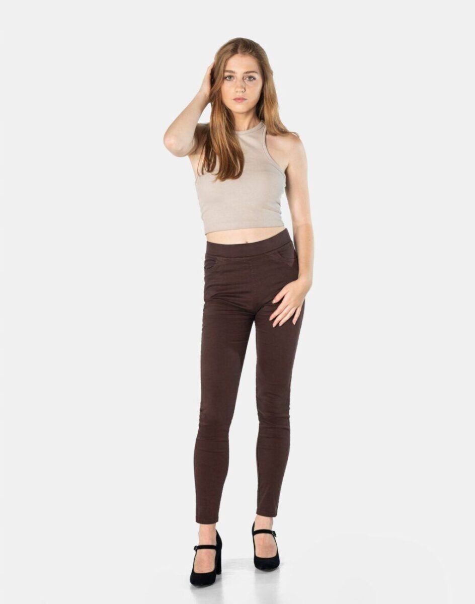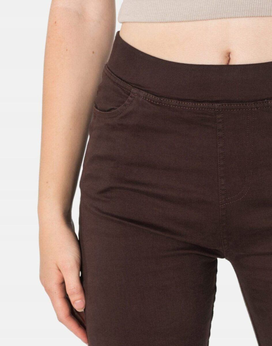 Spodnie damskie model 1920 Slim Fit to klasyczne, bardzo szykowne rurki w kolorze brązowym z wysokim stanem i wąskimi nogawkami, dzięki czemu sylwetka wygląda w nich lekko i zgrabnie. Optycznie wysmuklają, odwracając uwagę od ewentualnych niedoskonałości. Posiadają szeroki elastyczny pas ściągający sylwetkę w talii. Z przodu mają dwie kieszonki zaokrąglone a na tyle klasyczne kieszenie naszywane jak w typowych spodniach jeansowych. Najbardziej podatne na uszkodzenia miejsca wzmocnione są dodatkowymi przeszyciami.
