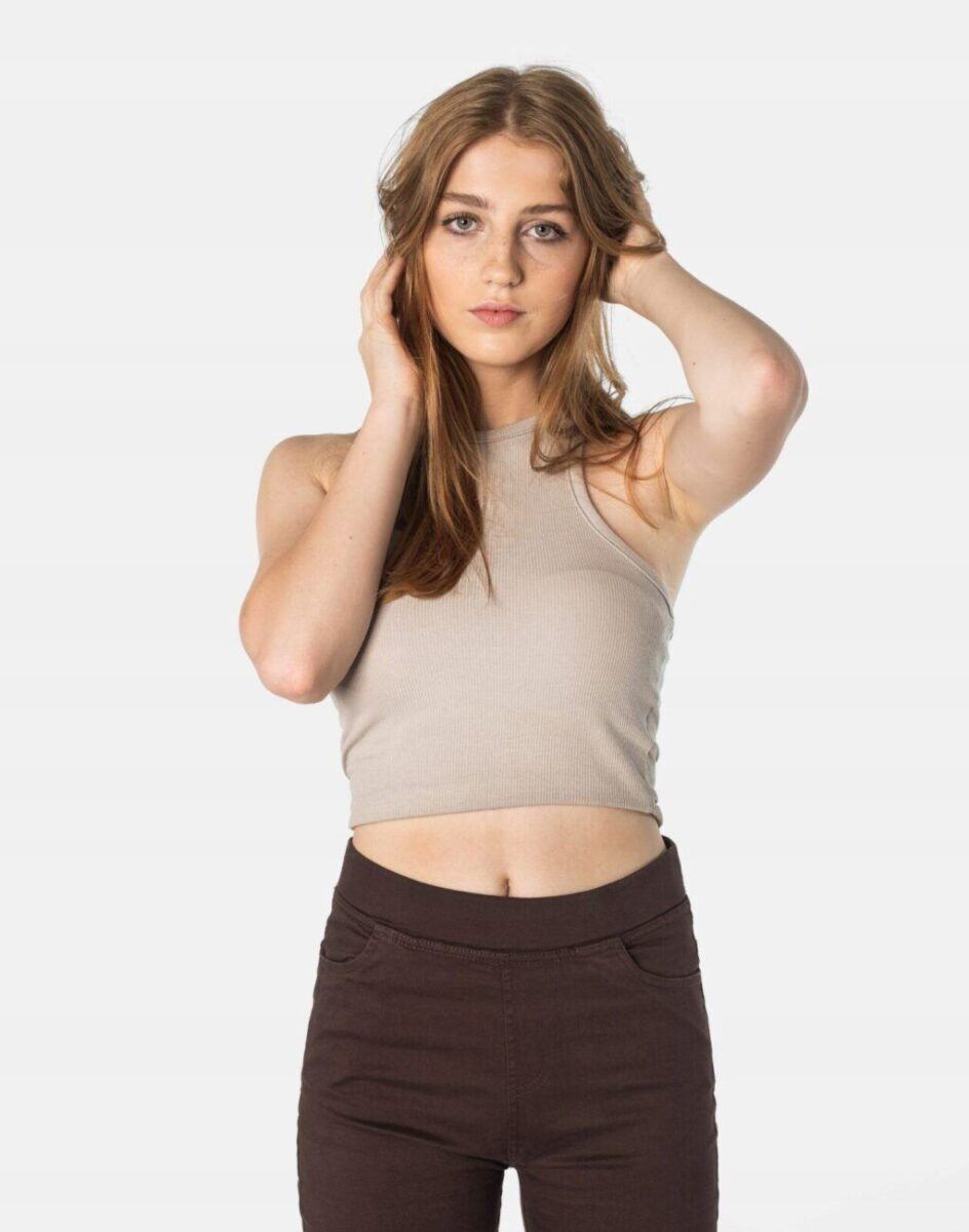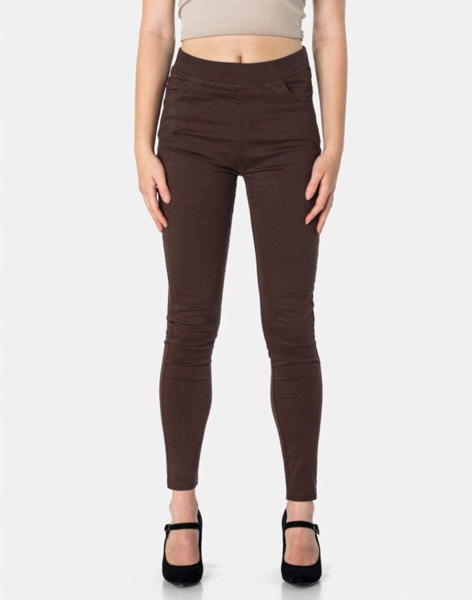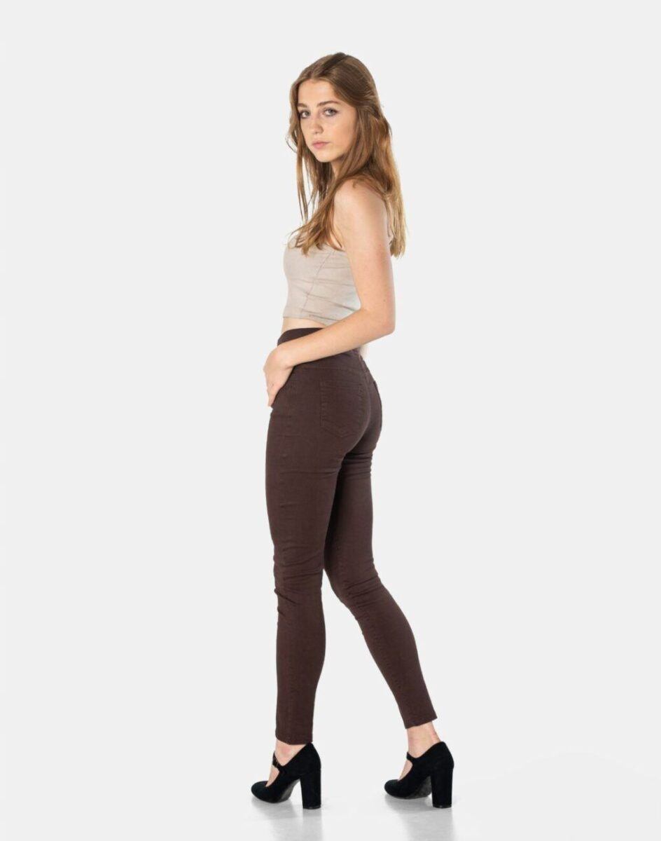 Spodnie damskie model 1920 Slim Fit to klasyczne, bardzo szykowne rurki w kolorze brązowym z wysokim stanem i wąskimi nogawkami, dzięki czemu sylwetka wygląda w nich lekko i zgrabnie. Optycznie wysmuklają, odwracając uwagę od ewentualnych niedoskonałości. Posiadają szeroki elastyczny pas ściągający sylwetkę w talii. Z przodu mają dwie kieszonki zaokrąglone a na tyle klasyczne kieszenie naszywane jak w typowych spodniach jeansowych. Najbardziej podatne na uszkodzenia miejsca wzmocnione są dodatkowymi przeszyciami.