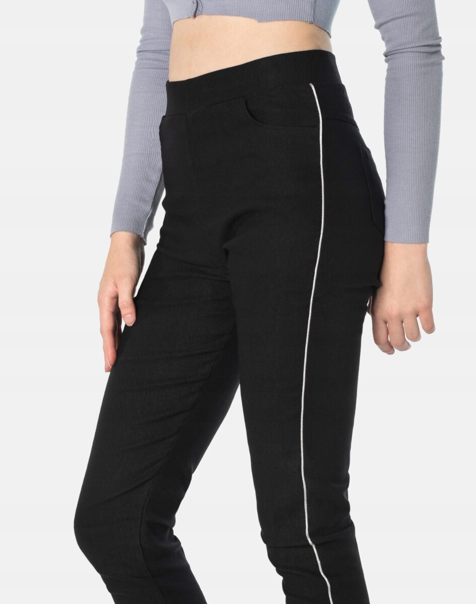 Spodnie damskie firmy VsisiV Fashion Wear to komfortowo skrojony model z wysoką elastyczną talią i wąską, dopasowaną nogawką ozdobioną lampasami, co nadaje im wyjątkowego charakteru, sylwetka wygląda w nich lekko i zgrabnie a nogi wydają się optycznie dłuższe. Elastyczne i przyjemne w dotyku, świetnie opinają ciało i modelują nogi odwracając uwagę od ewentualnych niedoskonałości. Z założenia wyróżniają się dużą wygodą a dopasowanie w pasie zapewnia szeroki, elastyczny pas ściągający. Materiał charakteryzuje się dużą elastycznością co zapewnia doskonałe dopasowanie spodni do sylwetki gwarantując tym piękny opływowy kształt. Zastosowana do produkcji wysokiej jakości tkanina jest elastyczna, idealnie dopasowuje się i jest bardzo komfortowa. Trwałe i elastyczne wykończenie spodni (użycie do produkcji elastycznych nici) gwarantuje komfort i wygodę ich użytkownikowi w każdych warunkach. Z przodu mają dwie kieszonki zaokrąglone a na tyle klasyczne kieszenie naszywane jak w typowych spodniach jeansowych. Najbardziej podatne na uszkodzenia miejsca wzmocnione są dodatkowymi przeszyciami.