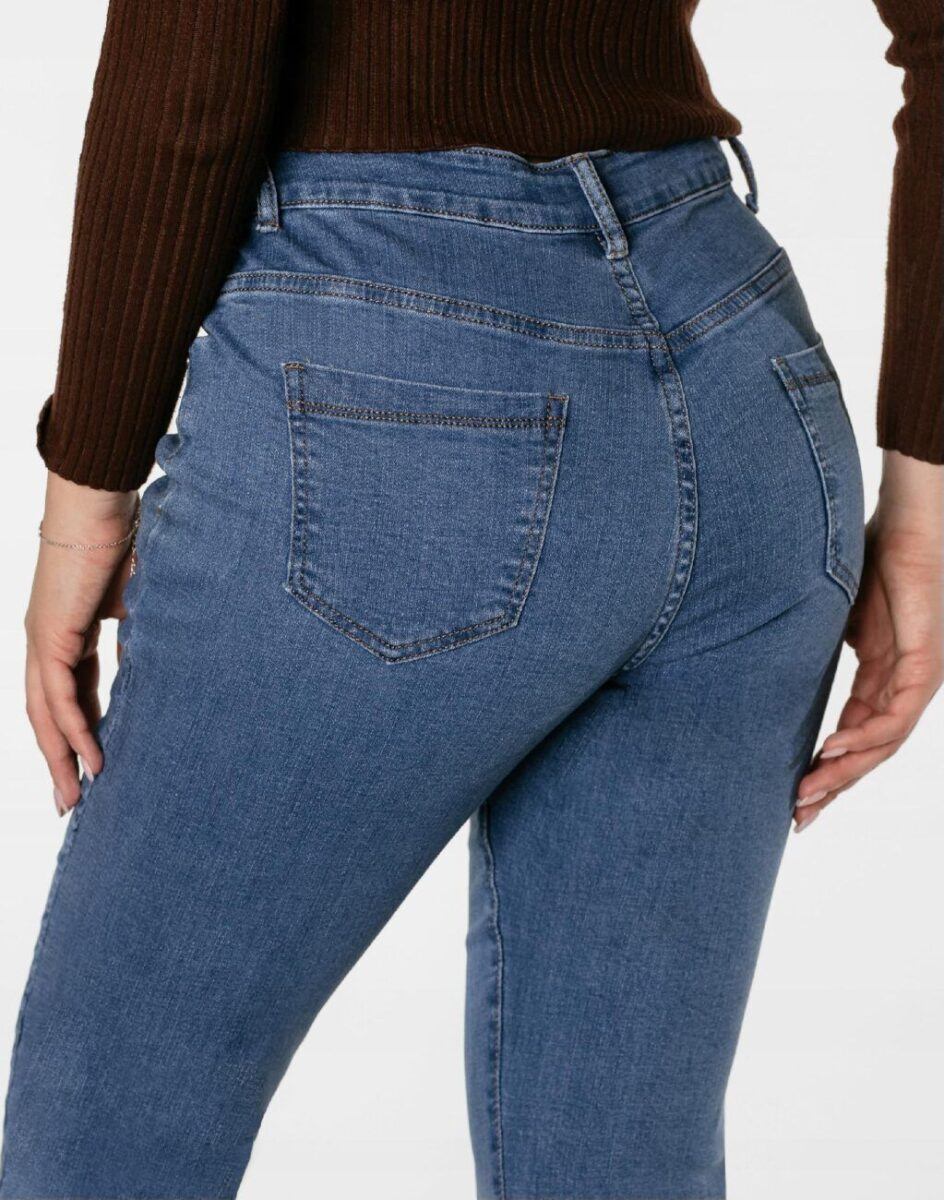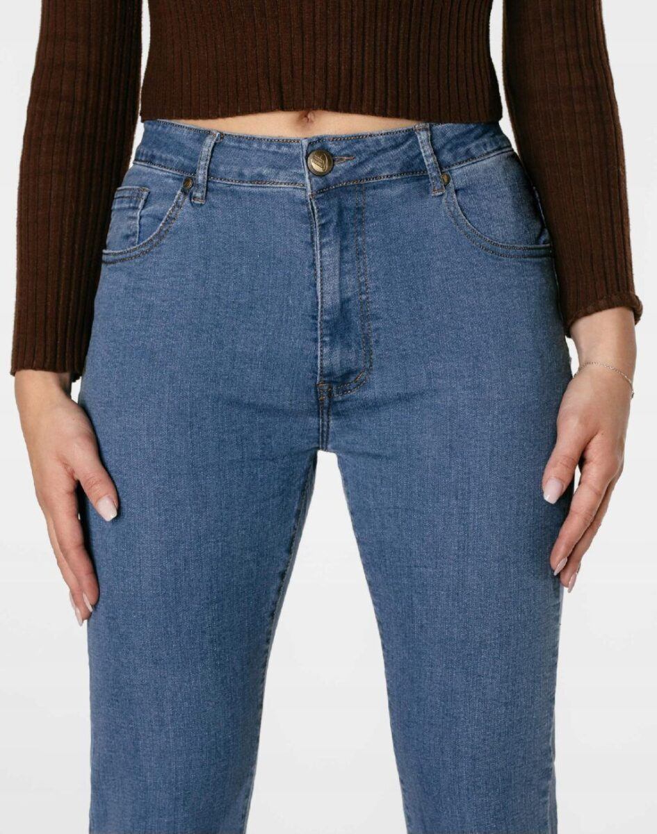Oferowane przez nas spodnie uszyte są z wysokiej jakości bawełnianej tkaniny jeansowej „Light Blue Denim” z domieszką lycry, która odznacza się wysoką elastycznością, co gwarantuje że spodnie nie będą się deformować i odkształcać nawet po długim użytkowaniu. Jeansy świetnie przylegają do ciała i pozwalają na pełną swobodę ruchów, co daje wygodę przy siadaniu i zapewnia ogromny komfort noszenia. Możesz je śmiało łączyć zarówno ze szpilkami (idealnie wydłużają kobiece nogi), jak i obuwiem sportowym. Dobrze wyglądają również z podwiniętymi nogawkami. Niepozorne podwinięcie nogawek nadaje stylizacjom ciekawej nonszalancji i zadziorności. Zapewniają poczucie atrakcyjności przy jednoczesnym zachowaniu wygody i pełnej swobody ruchów.