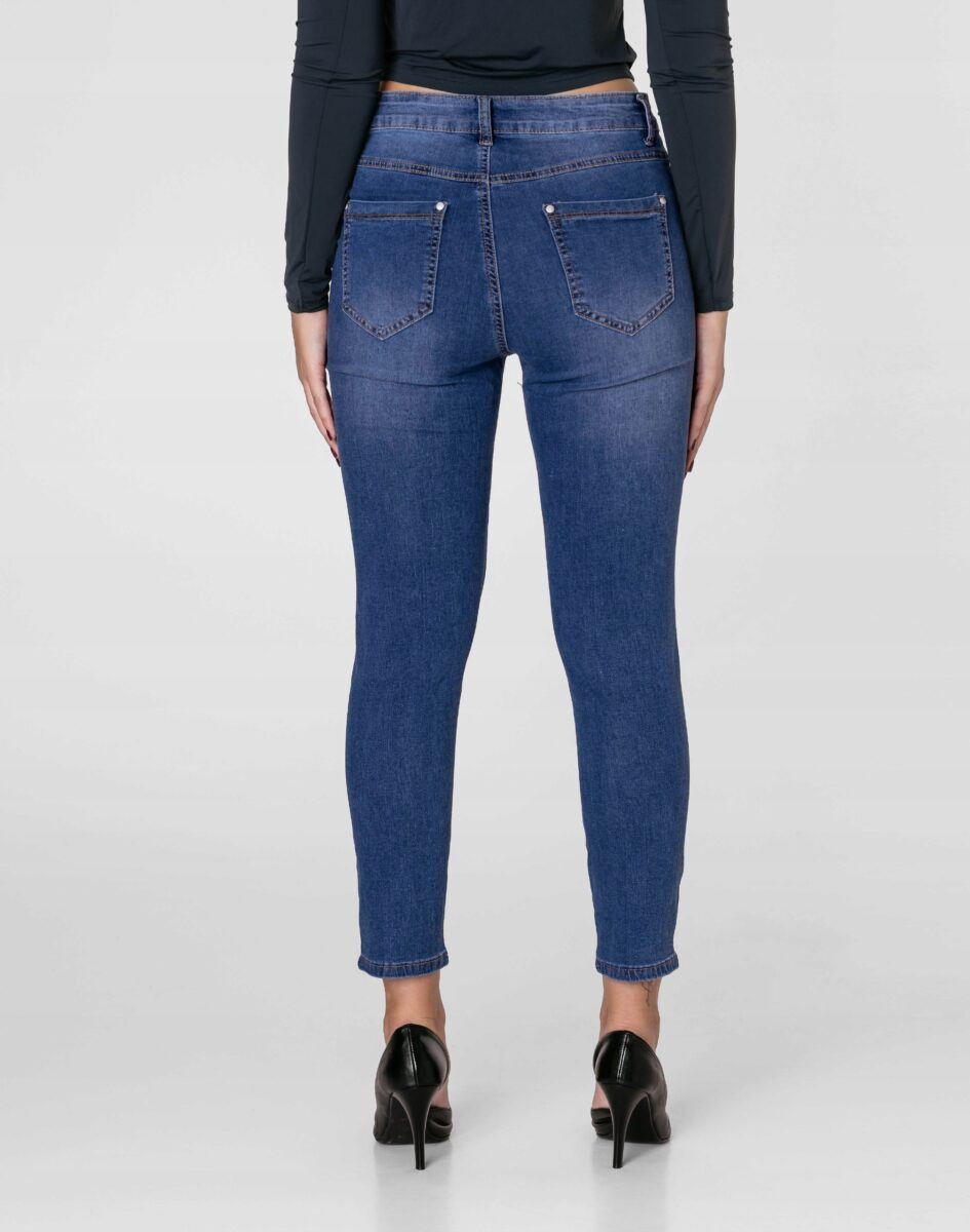 Oferowane przez nas spodnie uszyte są z wysokiej jakości, trwałej i mocnej, elastycznej tkaniny jeansowej „Light Blue Denim Jeans” z domieszką lycry (elastan). Niewielki dodatek lycry sprawia, że spodnie są bardziej elastyczne, ładnie dopasowują się do sylwetki i są bardzo komfortowe w użytkowaniu, a nogi wydają się się optycznie dłuższe. Krótsze nogawki 7/8 i delikatne przetarcia na spodniach nadają stylizacjom ciekawej nonszalancji i zadziorności. Łatwo się je zakłada i są znacznie wygodniejsze od jeansów, które lycry nie mają. Poza tym bawełna ma tendencję do kurczenia się w praniu, dlatego lycra sprawia, że spodnie są wyjątkowo praktyczne i można je bez problemu założyć po wysuszeniu. Pozwalają na pełną swobodę ruchów, co daje wygodę przy siadaniu i zapewnia ogromny komfort noszenia. Możesz je śmiało łączyć zarówno ze szpilkami (idealnie wydłużają kobiece nogi), jak i obuwiem sportowym lub czółenkami na wysokim obcasie, a Twoja stylizacja nabierze wyjątkowego charakteru. Zapewniają poczucie atrakcyjności przy jednoczesnym zachowaniu wygody i pełnej swobody ruchów.