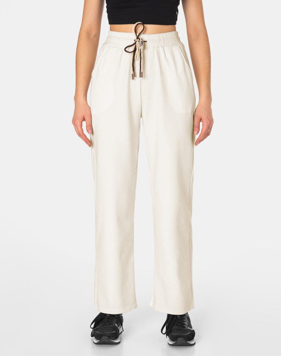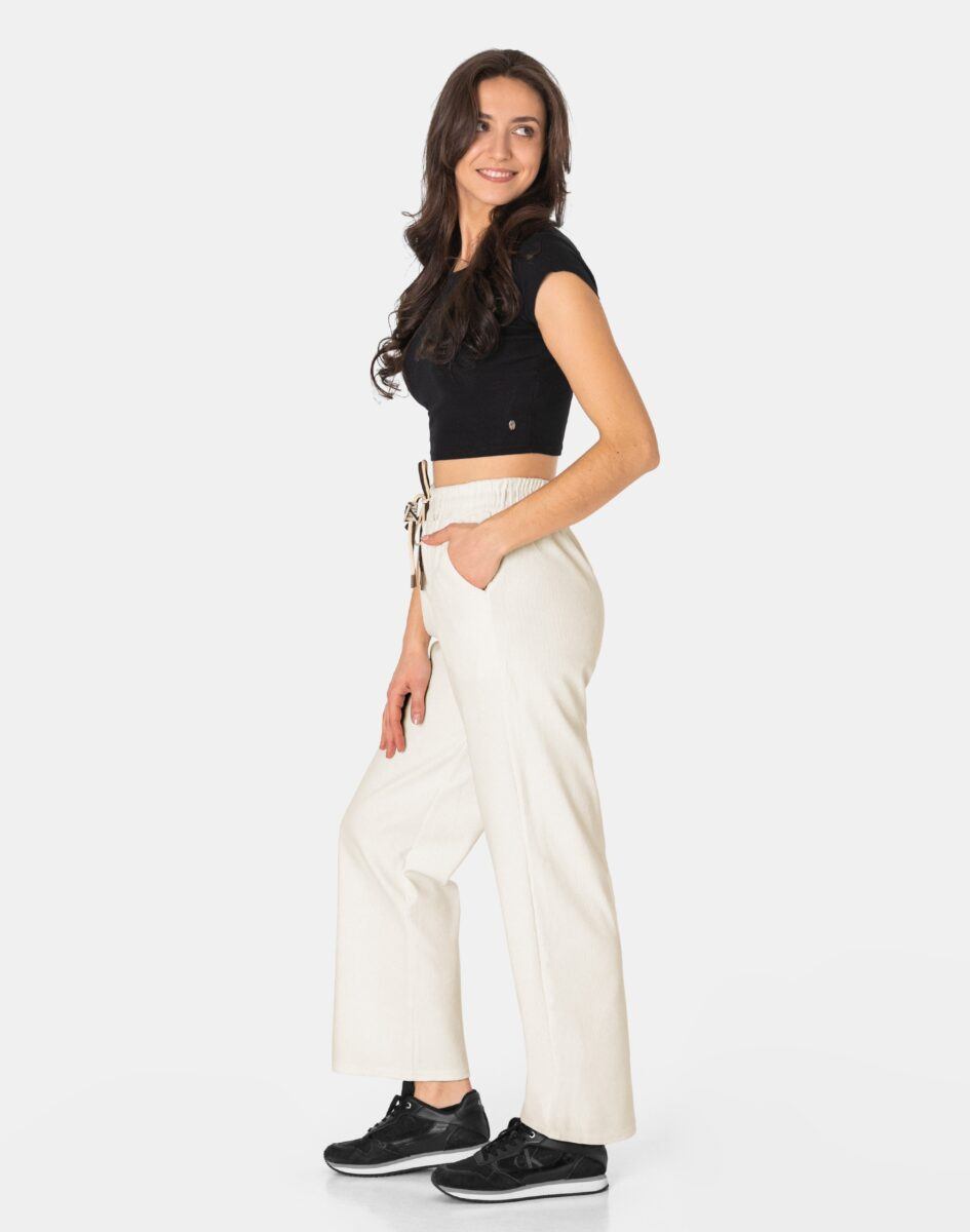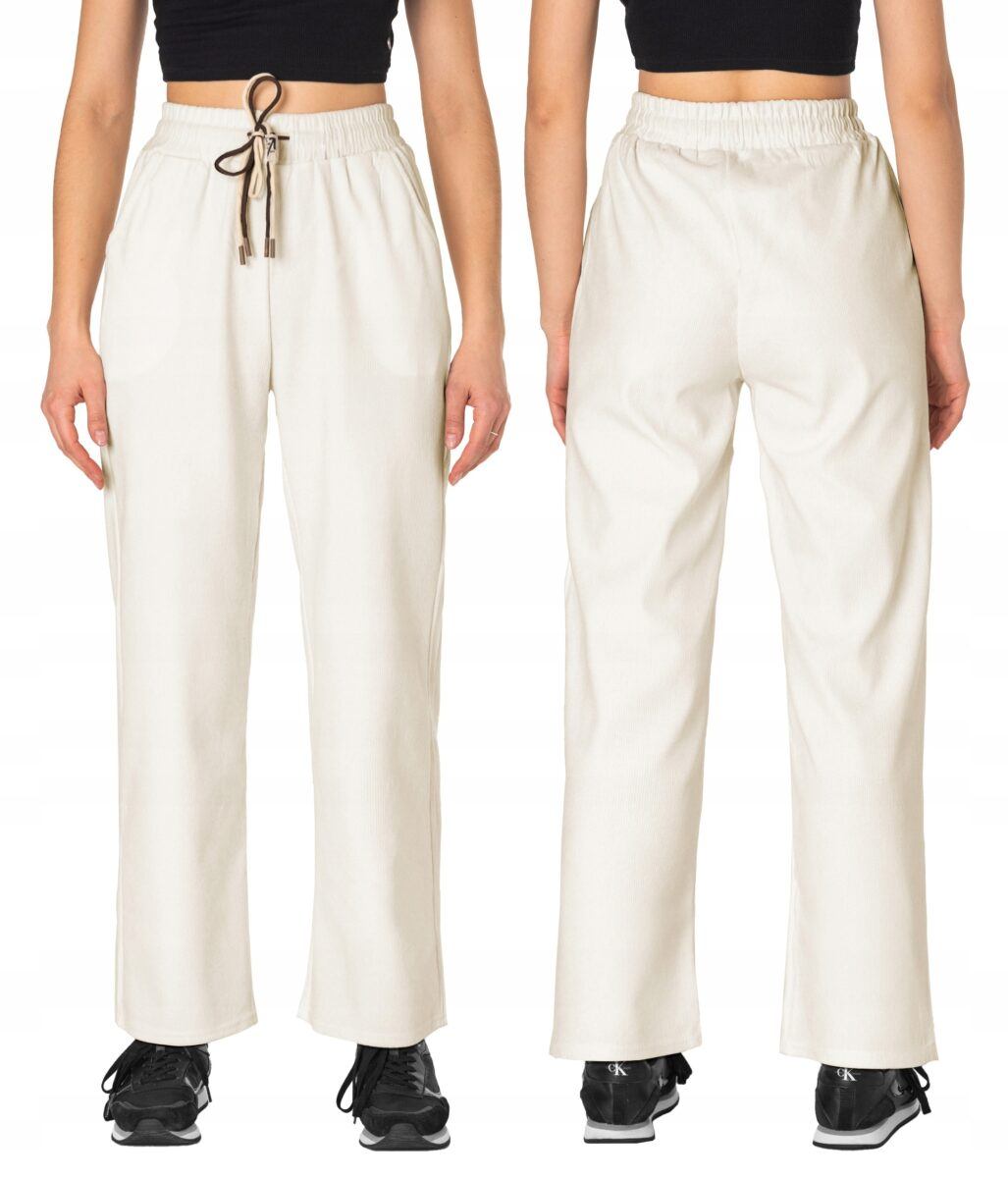 Spodnie model #970 to powracające do łask damskie szwedyWide Leg w letnim kolorze ecru, o charakterystycznych dla tego modelu szerokichnogawkach wide, rozszerzających się już od bioder. Wykonane z wysokiej jakości trwałej, mocnej i sprężystej tkaniny o najlepszej fakturze typu Bedford w charakterystyczny drobny prążek przypominającej tradycyjny sztruks o jednolitym wybarwieniu, wyjątkowo wygodnej w użytkowaniu. Z założenia wyróżniają się dużą wygodą a dopasowanie w pasie zapewnia szeroki, elastyczny pas ściągający zgrabnie modelujący talię, oraz dodatkowo wpuszczona w pasek ozdobna taśma regulacyjna z możliwością jej zawiązywania. Z przodu dwie wpuszczane kieszenie na dłonie, tył gładki bez kieszeni. Niewielki dodatek elastanu (lycra) sprawia, że spodnie są bardziej elastyczne, ładnie dopasowują się do sylwetki i są bardzo komfortowe w użytkowaniu. Łatwo się je zakłada i są znacznie wygodniejsze od spodni, które lycry nie mają.