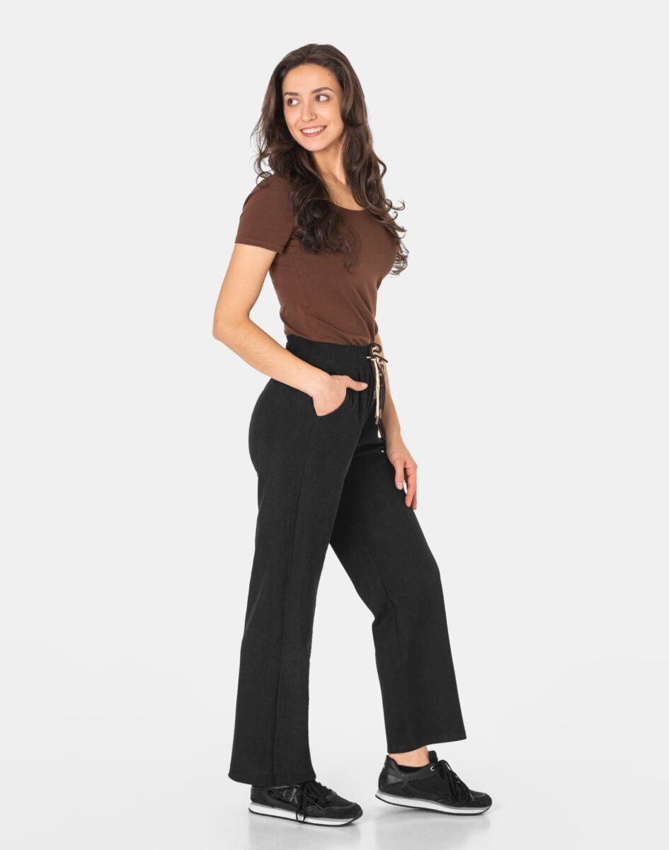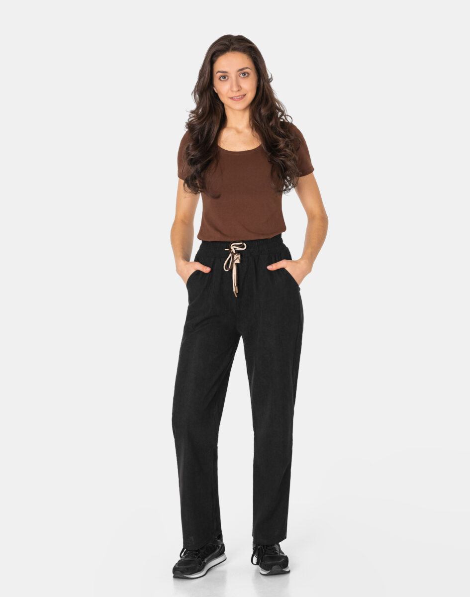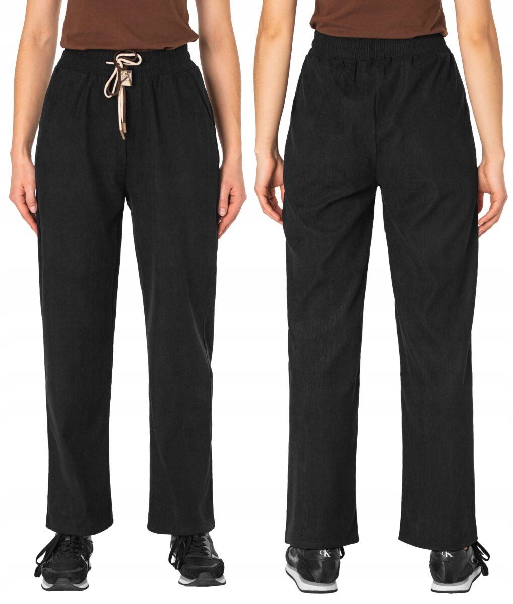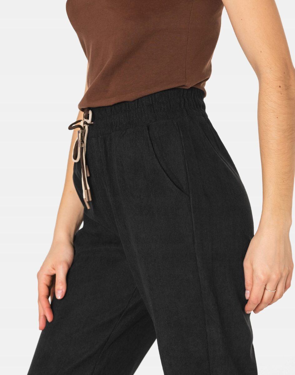 Spodnie model #970 to powracające do łask damskie szwedyWide Leg w letnim kolorze czarnym, o charakterystycznych dla tego modelu szerokichnogawkach wide, rozszerzających się już od bioder. Wykonane z wysokiej jakości trwałej, mocnej i sprężystej tkaniny o najlepszej fakturze typu Bedford w charakterystyczny drobny prążek przypominającej tradycyjny sztruks o jednolitym wybarwieniu, wyjątkowo wygodnej w użytkowaniu. Z założenia wyróżniają się dużą wygodą a dopasowanie w pasie zapewnia szeroki, elastyczny pas ściągający zgrabnie modelujący talię, oraz dodatkowo wpuszczona w pasek ozdobna taśma regulacyjna z możliwością jej zawiązywania. Z przodu dwie wpuszczane kieszenie na dłonie, tył gładki bez kieszeni. Niewielki dodatek elastanu (lycra) sprawia, że spodnie są bardziej elastyczne, ładnie dopasowują się do sylwetki i są bardzo komfortowe w użytkowaniu. Łatwo się je zakłada i są znacznie wygodniejsze od spodni, które lycry nie mają.