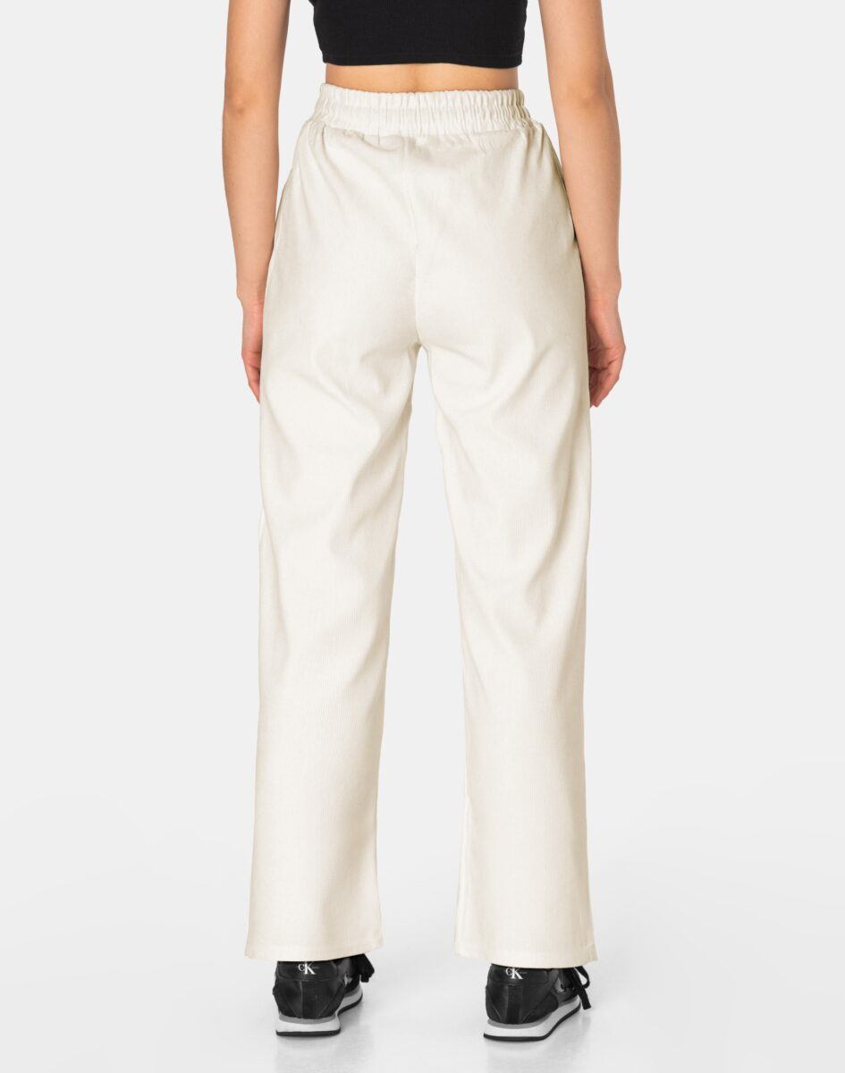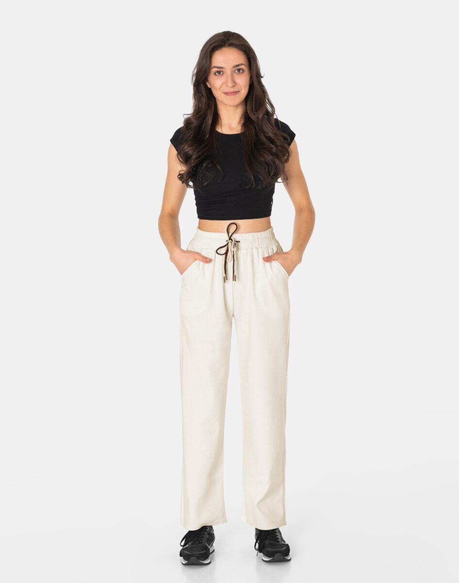 Spodnie model #970 to powracające do łask damskie szwedyWide Leg w letnim kolorze ecru, o charakterystycznych dla tego modelu szerokichnogawkach wide, rozszerzających się już od bioder. Wykonane z wysokiej jakości trwałej, mocnej i sprężystej tkaniny o najlepszej fakturze typu Bedford w charakterystyczny drobny prążek przypominającej tradycyjny sztruks o jednolitym wybarwieniu, wyjątkowo wygodnej w użytkowaniu. Z założenia wyróżniają się dużą wygodą a dopasowanie w pasie zapewnia szeroki, elastyczny pas ściągający zgrabnie modelujący talię, oraz dodatkowo wpuszczona w pasek ozdobna taśma regulacyjna z możliwością jej zawiązywania. Z przodu dwie wpuszczane kieszenie na dłonie, tył gładki bez kieszeni. Niewielki dodatek elastanu (lycra) sprawia, że spodnie są bardziej elastyczne, ładnie dopasowują się do sylwetki i są bardzo komfortowe w użytkowaniu. Łatwo się je zakłada i są znacznie wygodniejsze od spodni, które lycry nie mają.